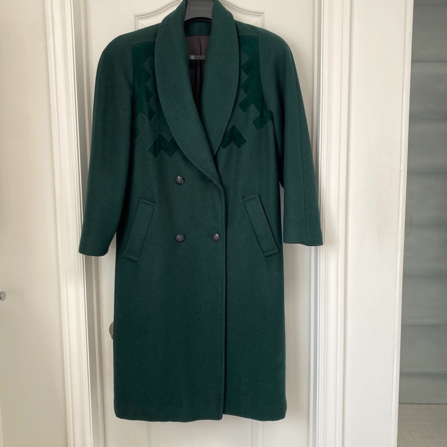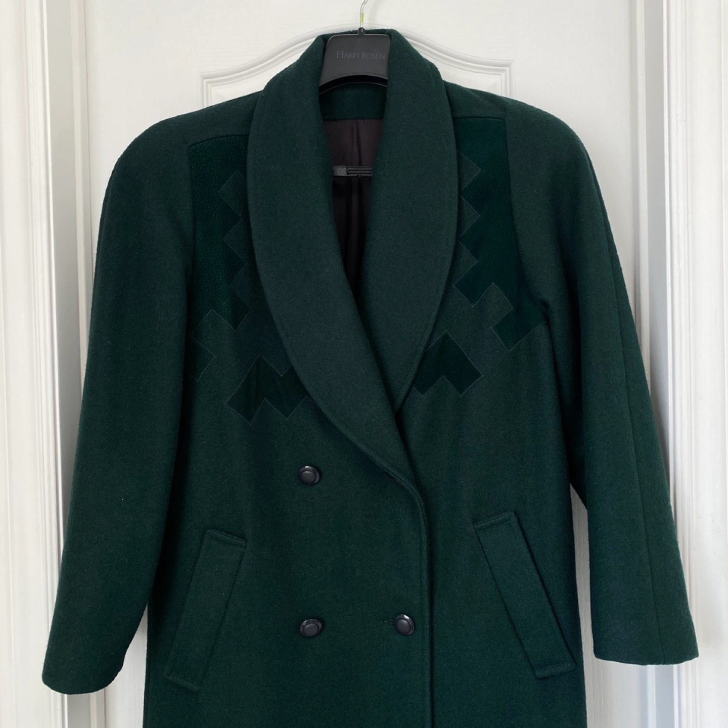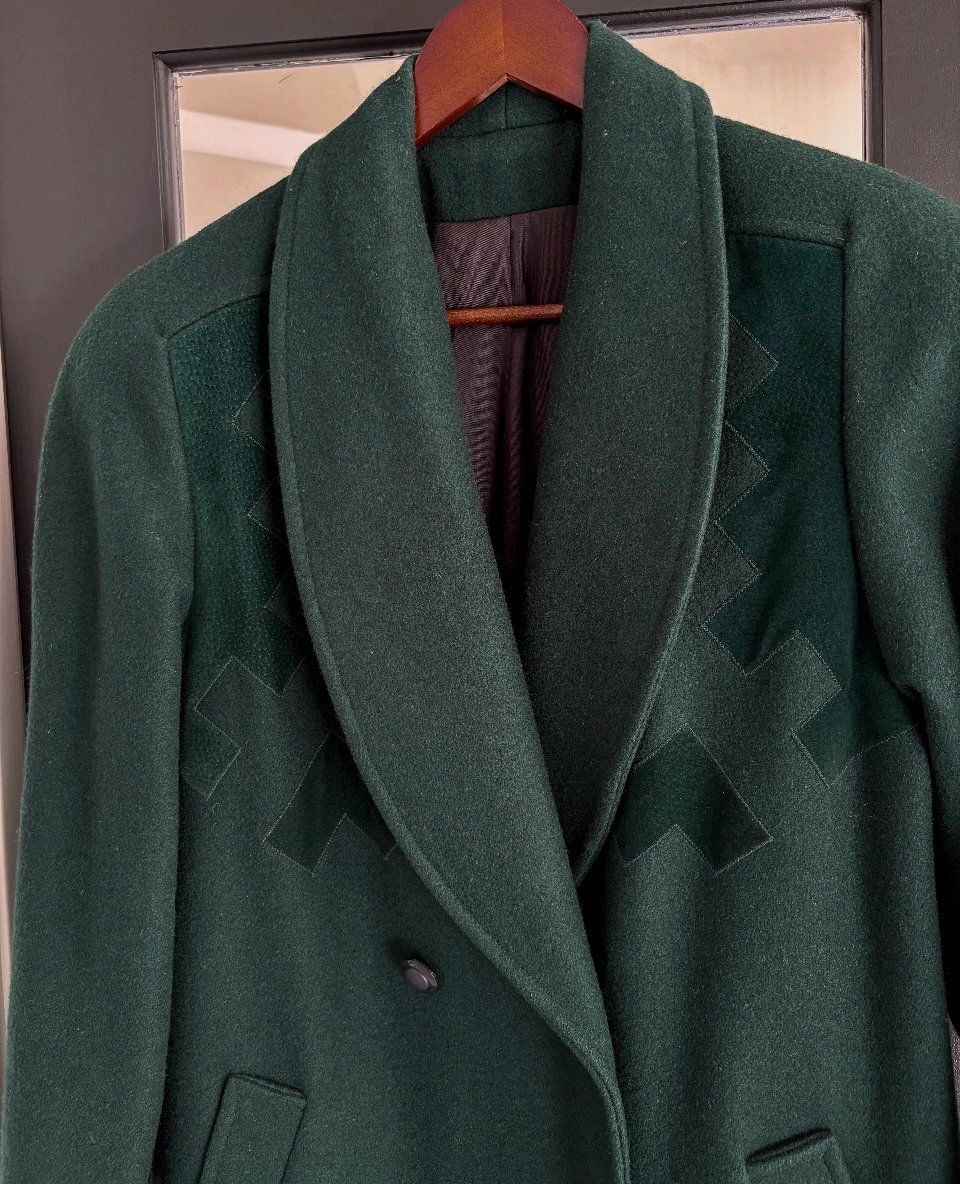 Green wool coat with a double breasted closure and wide collar. In very good condition, hardly worn. It has sat in my closet for years unworn as it no longer fit. Fabric/Size label was removed. Size - Medium Measurement - PTP is 20” Comes from a pet free, smoke free, scent free home. Pick up - Pickering - Altona & Sheppard or Toronto - Broadview & Gerrard
