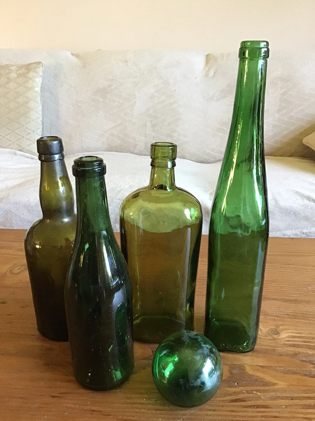 Selling a collection of vintage green glass bottles. They would make a great addition to any collection or as decorative pieces around the house. They have a lovely vintage look and feel