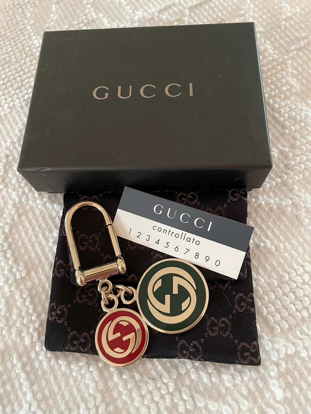 Vintage Gucci key ring,Key holder G logos Gold Green Red (original Gucci colour scheme), Authentic, Unused with original pouch, tag and box. Someone is selling her Used version for $460 on eBay. Insane!