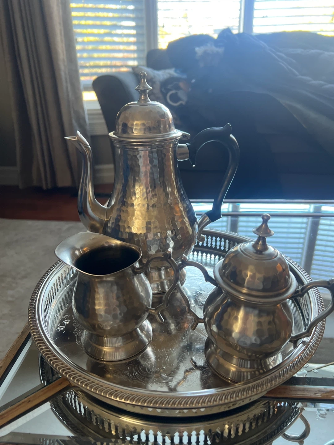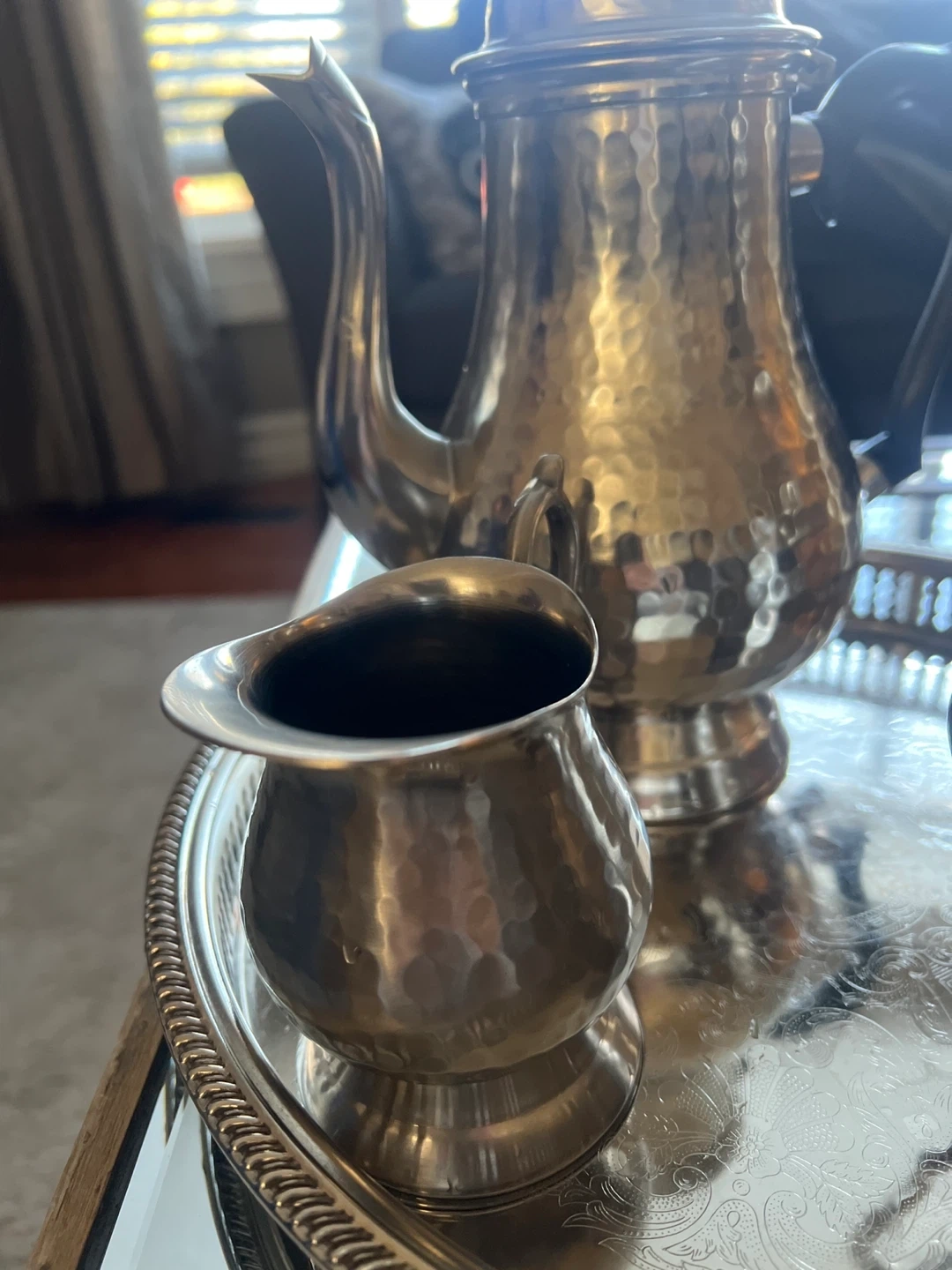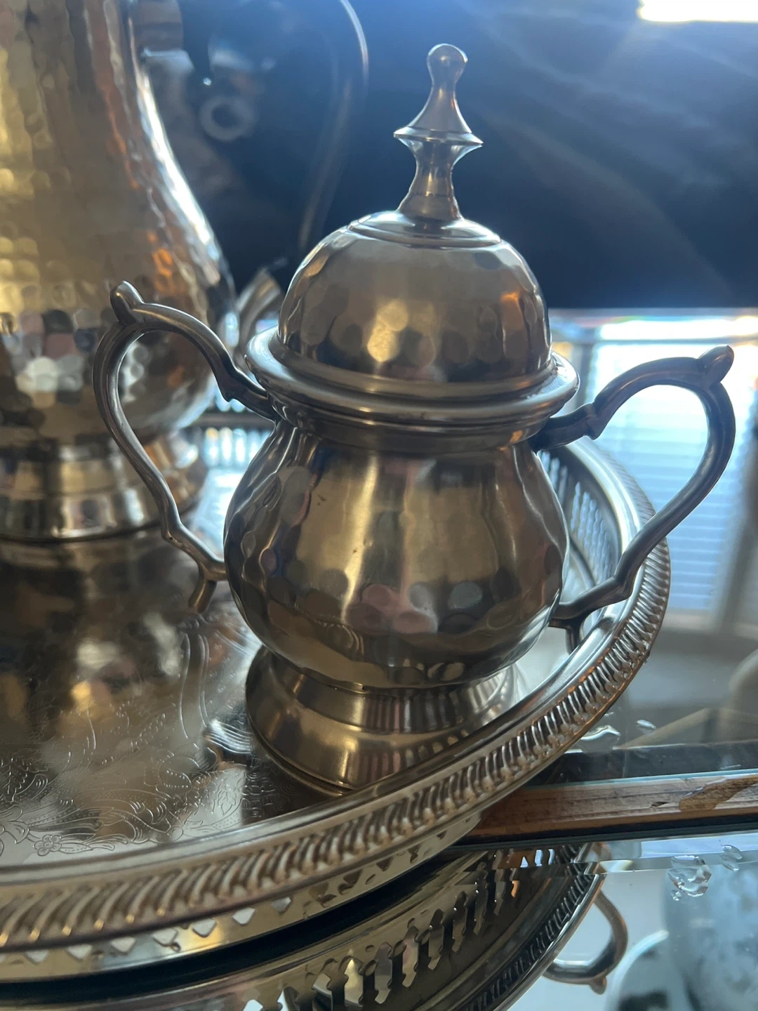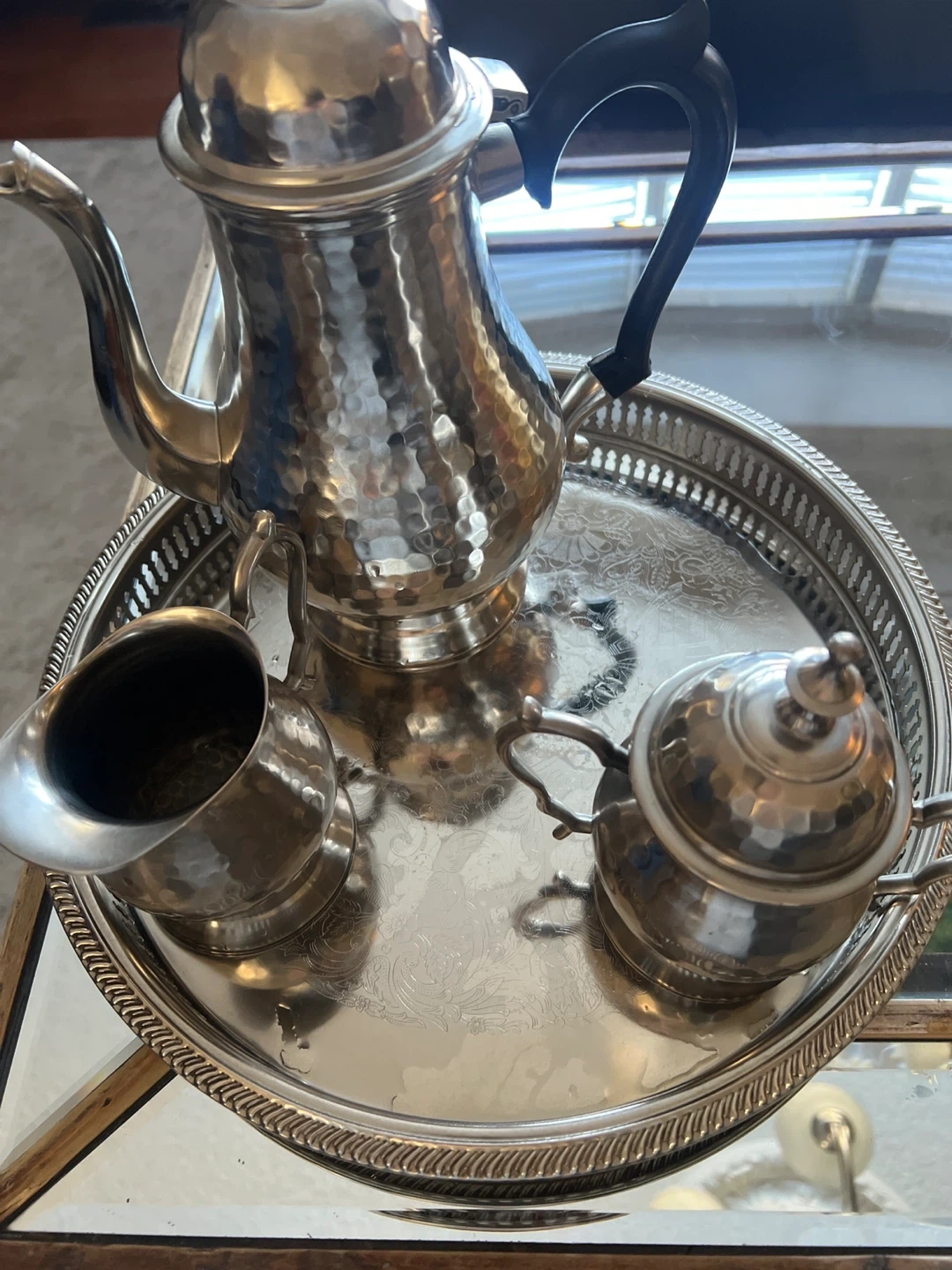 Selling a lovely vintage hammered sliver tea set. Includes a teapot, creamer, and sugar bowl. Perfect for adding a touch of elegance to your tea time!