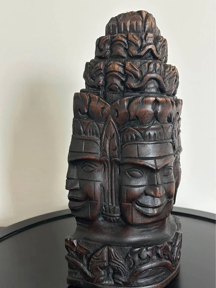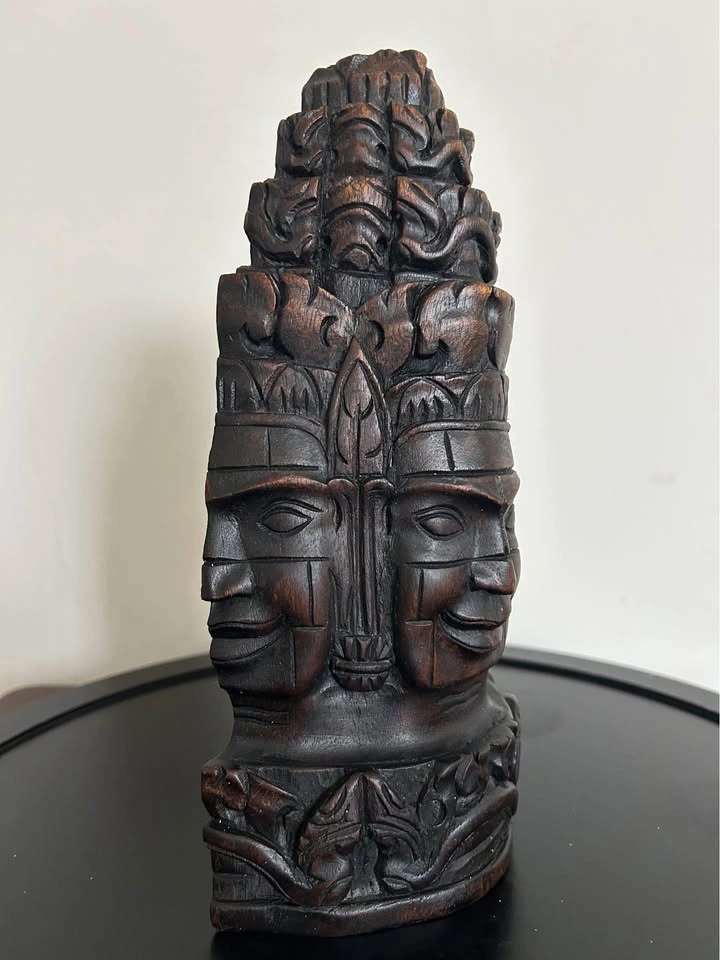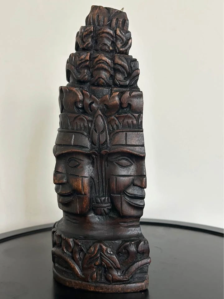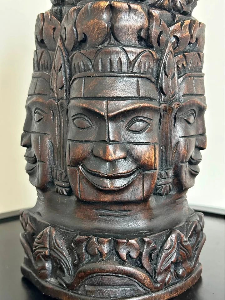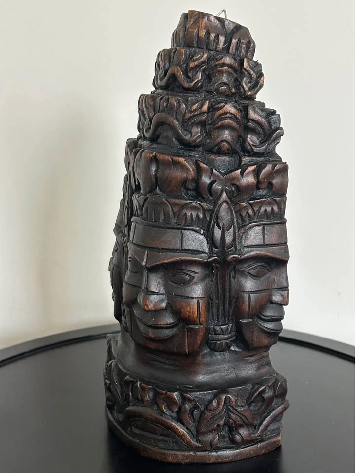 Elegant hand-carved wooden sculpture inspired by the Bayon Temple of Angkor Thom, Cambodia. Depicting three serene faces of Bodhisattva Avalokiteshvara, this artwork represents peace, mindfulness, and divine balance. Crafted from dark hardwood with a smooth aged finish and intricate details, it’s a striking example of traditional Southeast Asian craftsmanship. Can be displayed standing or hung on a wall. Pick up: Seton area, Calgary. See also my other lots. Open to your questions and suggestions. If necessary, I provide additional photos. These are not new things, so please look carefully at the photos and videos. Sizes are submitted on request and also using a tape measure in the photo.