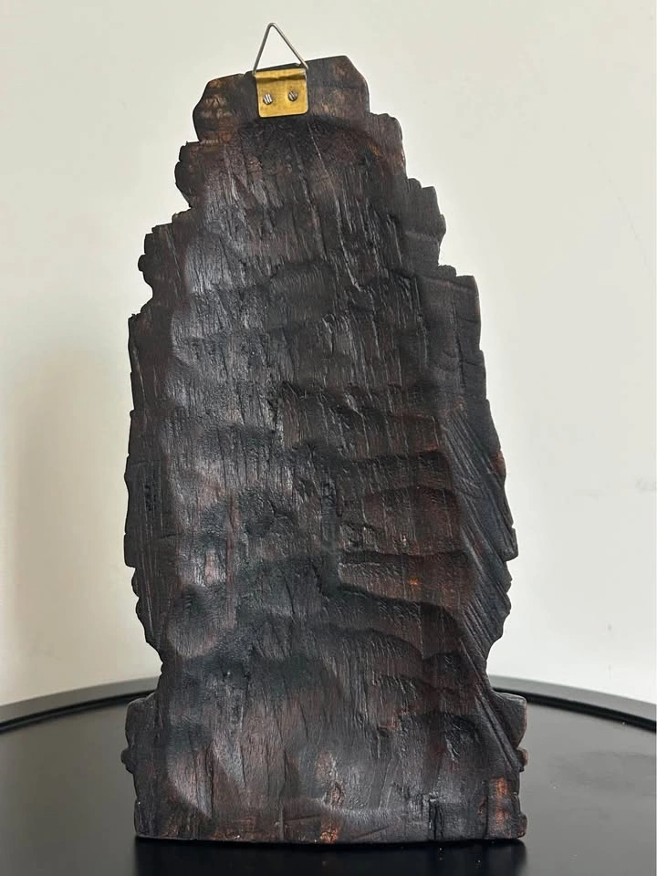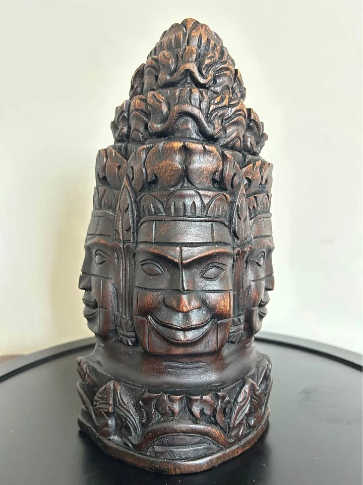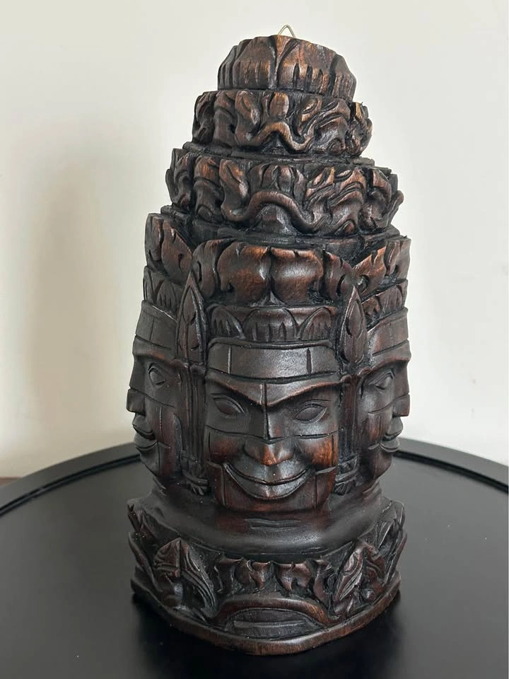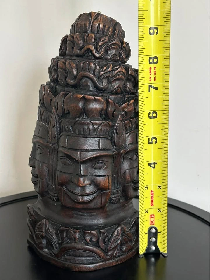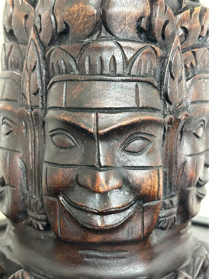 Elegant hand-carved wooden sculpture inspired by the Bayon Temple of Angkor Thom, Cambodia. Depicting three serene faces of Bodhisattva Avalokiteshvara, this artwork represents peace, mindfulness, and divine balance. Crafted from dark hardwood with a smooth aged finish and intricate details, it’s a striking example of traditional Southeast Asian craftsmanship. Can be displayed standing or hung on a wall. Pick up: Seton area, Calgary. See also my other lots. Open to your questions and suggestions. If necessary, I provide additional photos. These are not new things, so please look carefully at the photos and videos. Sizes are submitted on request and also using a tape measure in the photo.