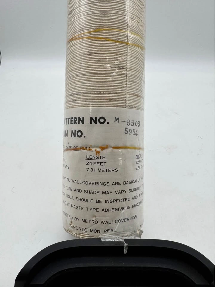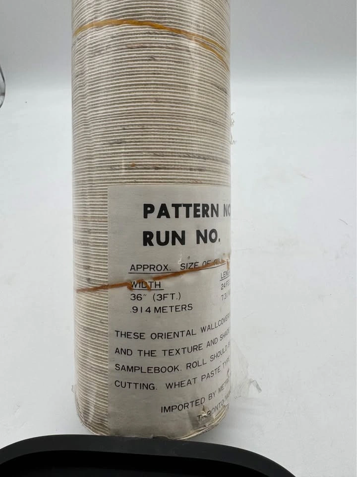Beautiful vintage Oriental Wallpaper roll, Made in Korea and imported by Metro Wallcoverings (Toronto–Montreal). This is a hand-made wallpaper, giving it a unique textured finish and natural shade variations. 📏 Details: • Width: 36 inches (91 cm / 3 ft) • Length: 24 ft (7.31 m) • Coverage: 72 sq ft (6.68 sq m) • Pattern No: M-8303 • Run No: 5984 • Type: Wheat paste adhesive recommended • Still sealed in original packaging