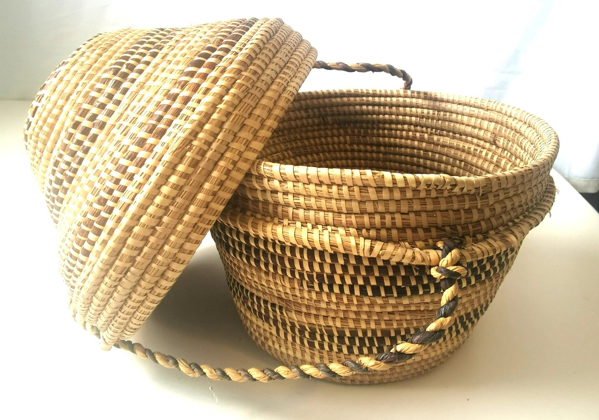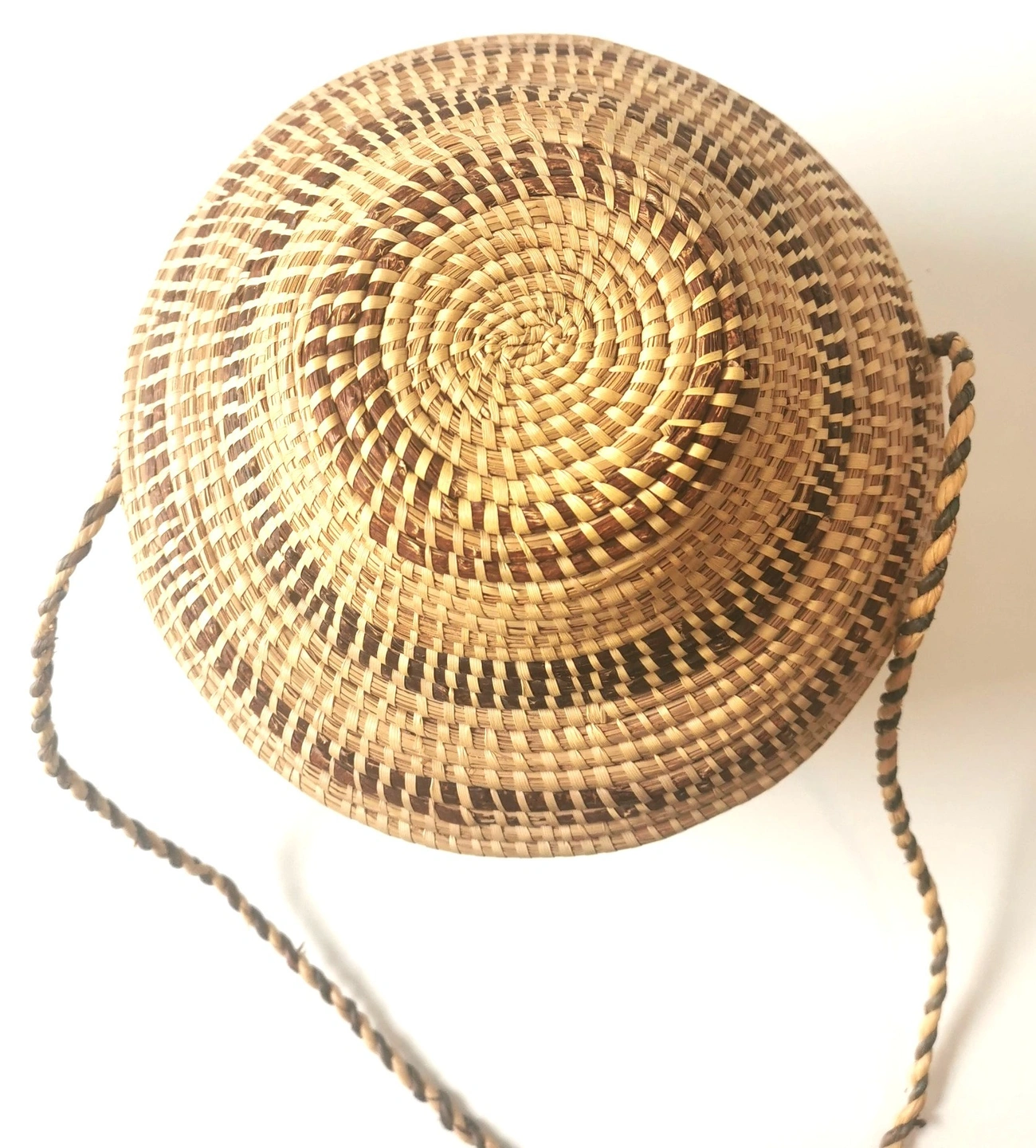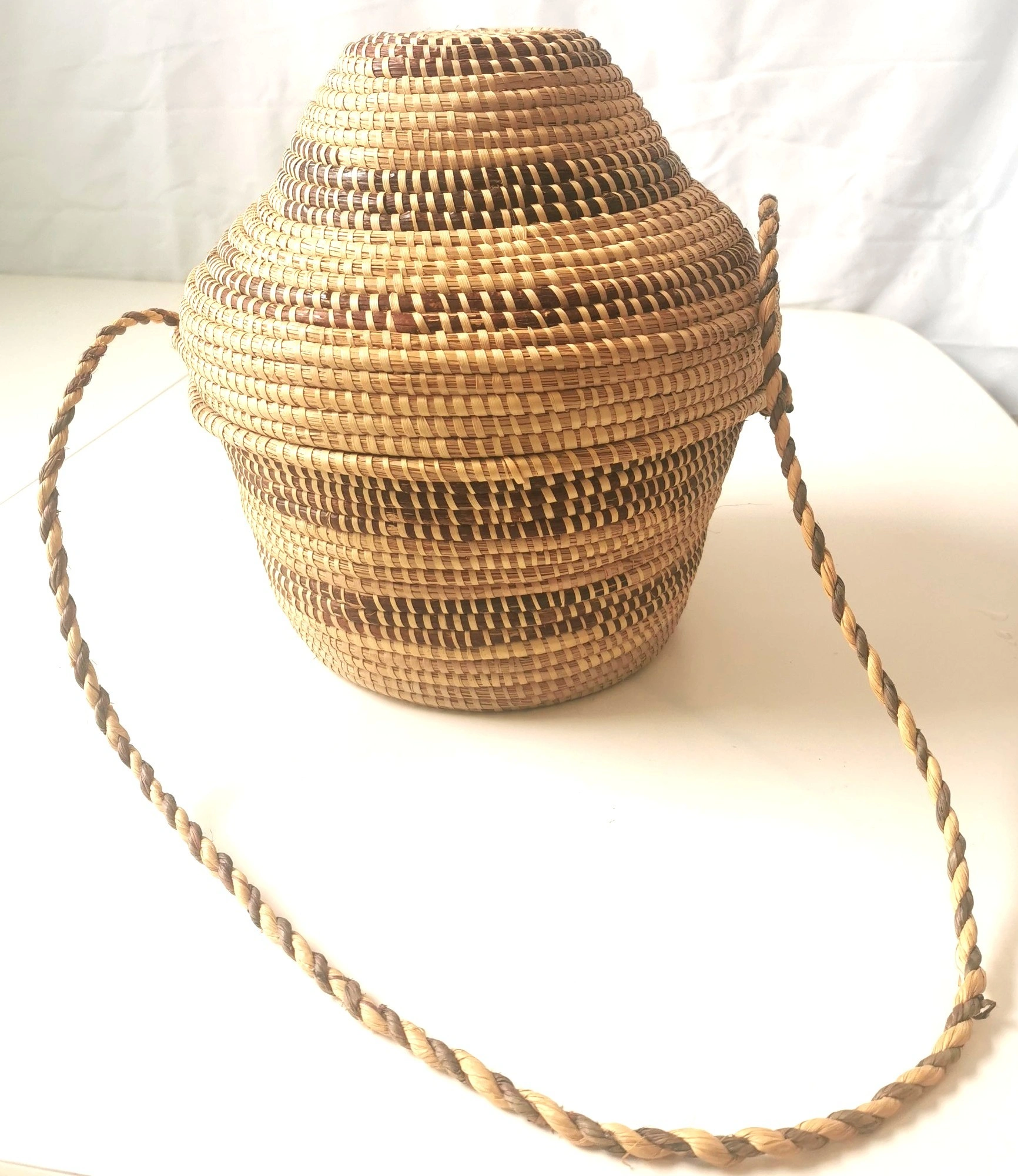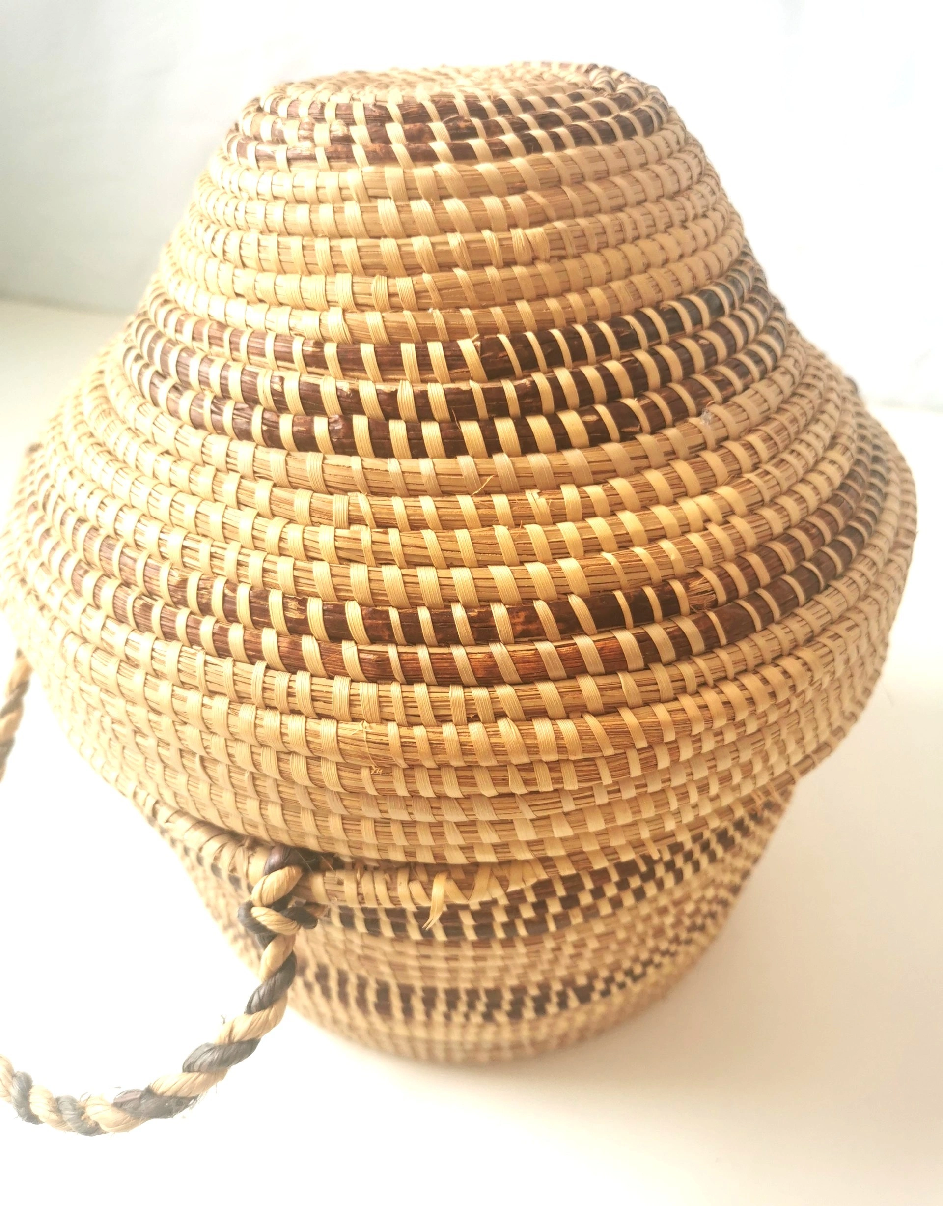 A beautiful and authentic vintage handmade basket from Botswana, Africa. This piece showcases the exceptional craftsmanship of the region's weavers, featuring a tight coil weave made from Mokola palm fibers. The basket has a unique and elegant gourd-like shape with a fitted lid and an attached, braided carrying strap. The natural and dyed fibers are woven into a striking geometric pattern, typical of traditional Botswana basketry. This piece is not only a functional storage item but also a stunning work of decorative art. It would be a perfect addition to a global-inspired or bohemian (boho) decor, or for a collector of African art. Features: Origin: Botswana, Africa Material: Mokola Palm Fiber Technique: Hand-coiled Weaving Design: Traditional Geometric Pattern Features: Fitted Lid and Braided Carrying Strap Shape: Unique Gourd/Tiered Shape Condition: This is a vintage item in good condition, consistent with its age. The weaving is tight and intact. There are no major breaks, cracks, or stains. Please see all photos for a detailed look at its condition. Approximate Height: 11 inches Approximate Diameter: 9 inches This exquisite piece of functional art is a testament to the rich cultural heritage of Botswana's artisans. Don't miss the opportunity to own this unique and beautiful handmade basket!