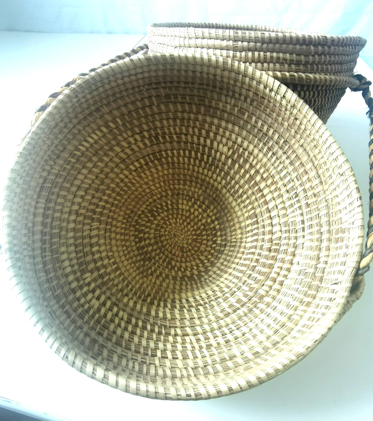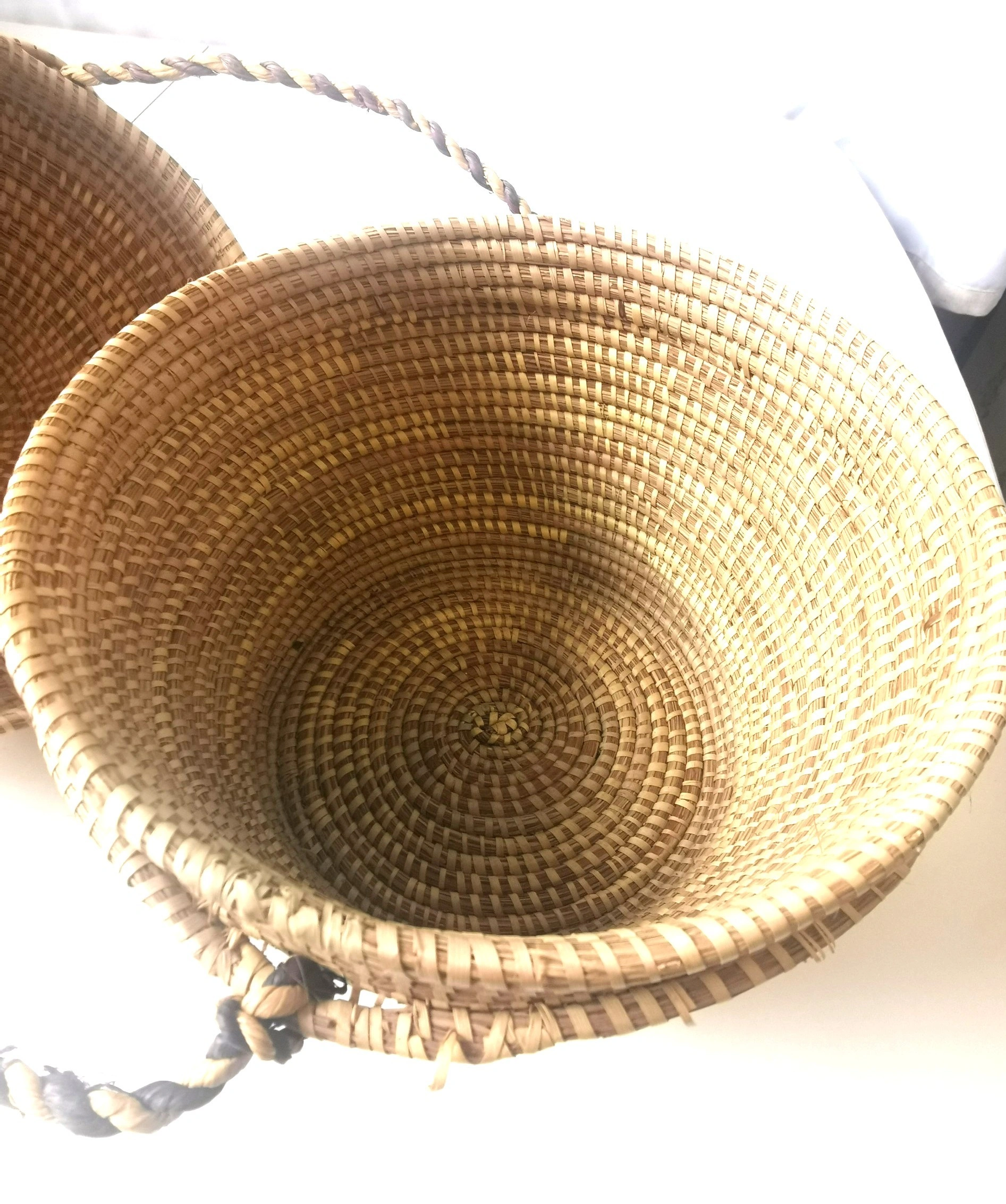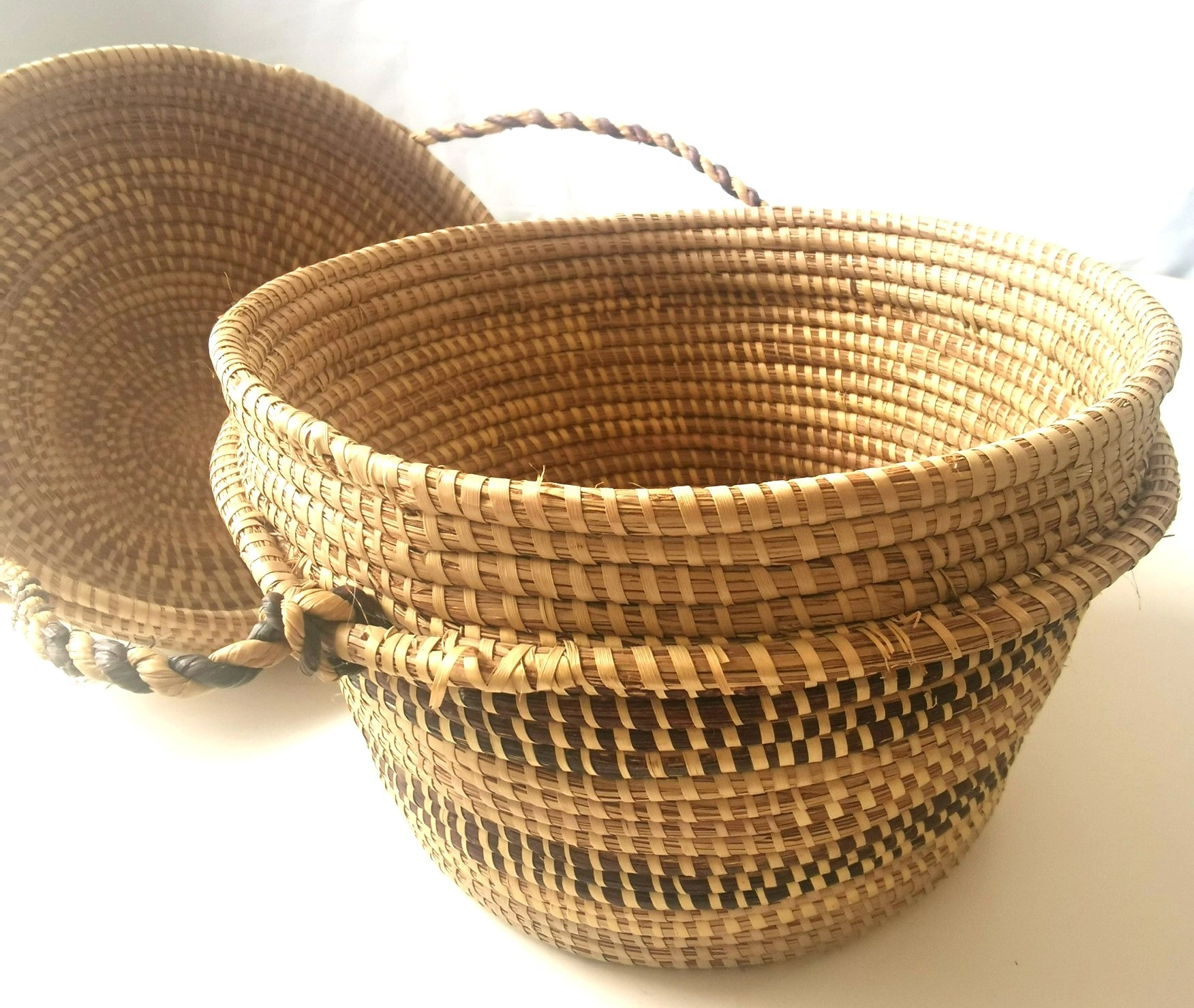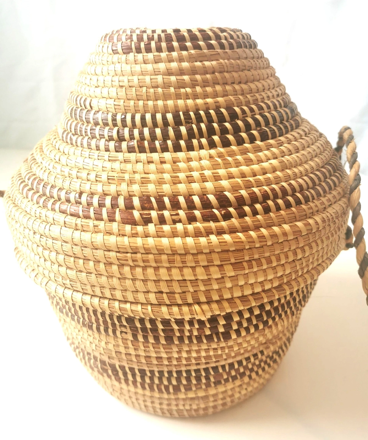 A beautiful and authentic vintage handmade basket from Botswana, Africa. This piece showcases the exceptional craftsmanship of the region's weavers, featuring a tight coil weave made from Mokola palm fibers. The basket has a unique and elegant gourd-like shape with a fitted lid and an attached, braided carrying strap. The natural and dyed fibers are woven into a striking geometric pattern, typical of traditional Botswana basketry. This piece is not only a functional storage item but also a stunning work of decorative art. It would be a perfect addition to a global-inspired or bohemian (boho) decor, or for a collector of African art. Features: Origin: Botswana, Africa Material: Mokola Palm Fiber Technique: Hand-coiled Weaving Design: Traditional Geometric Pattern Features: Fitted Lid and Braided Carrying Strap Shape: Unique Gourd/Tiered Shape Condition: This is a vintage item in good condition, consistent with its age. The weaving is tight and intact. There are no major breaks, cracks, or stains. Please see all photos for a detailed look at its condition. Approximate Height: 11 inches Approximate Diameter: 9 inches This exquisite piece of functional art is a testament to the rich cultural heritage of Botswana's artisans. Don't miss the opportunity to own this unique and beautiful handmade basket!