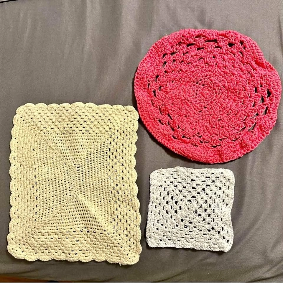 In good condition, very old!! Handmade. Likely made in the 50s or 60s. Possibly even older, could be from the 40s - I am estimating based on the fact that they came from an estate sale and while purchasing these, I saw what else was there. Use for arts and crafts or as a cloth, coaster, trivet, etc. I was originally going to use them for art in a shadowbox, but haven’t found myself doing it yet. 1 cream. 1 white. 1 red/hot pink tone. Pick up in Niagara Falls Ontario