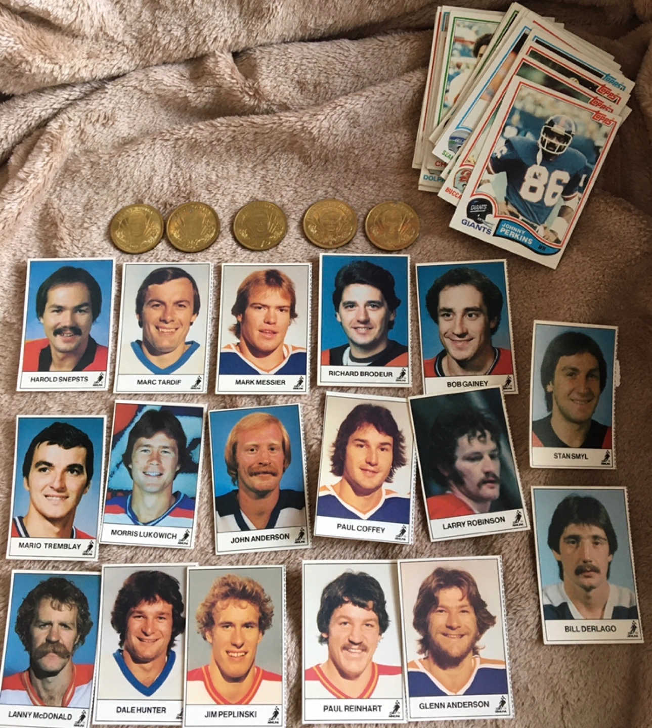I'm offering a collection of used hockey memorabilia, including vintage hats (brand new), cards, coins, game programs, a bobblehead and a headliner. These items showcase various players and teams, perfect for any hockey enthusiast looking to expand their collection. Also including a lot of early ‘80’s NFL cards. There's a real potpourri of nostalgia here! It's all available as long as you see the ad. Who knows what treasures you might find?
