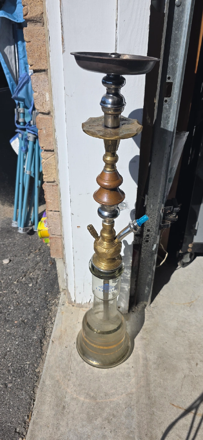 Selling a vintage hookah. It has a glass base with gold accents and a metal stem with wooden and silver-coloured sections. It appears to be in good condition for its age. Perfect for collectors or those interested in unique decor