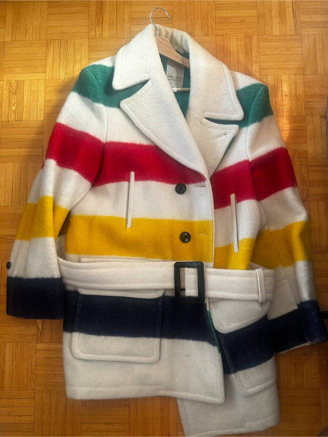 Beautiful Hudson's Bay Point Blanket Coat is made from 100% wool and crafted right here in Canada. It features the iconic stripes and comes in a size medium. A true Canadian classic! They truly do make quality like this anymore.