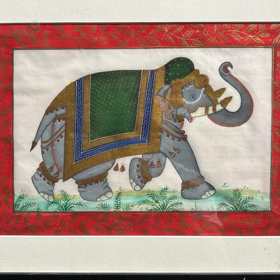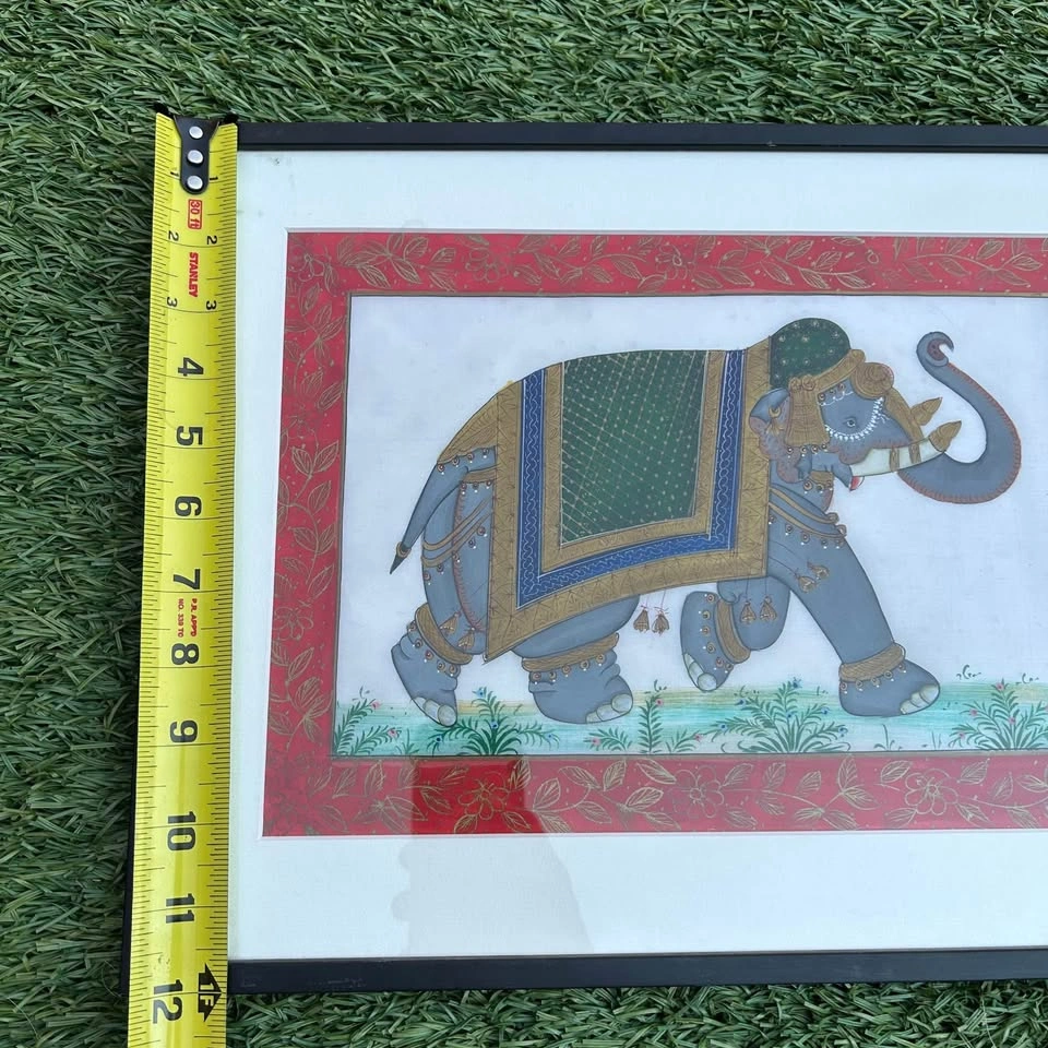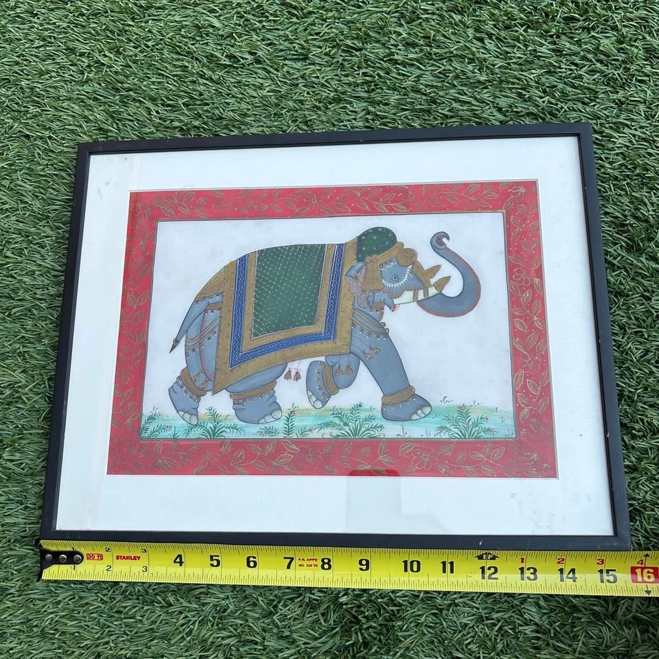 A fine example of traditional Indian miniature painting, this artwork portrays a royal elephant richly decorated with jewelry, ornaments, and ceremonial fabrics. Hand-painted with exquisite detail, the elephant is framed within a red floral border with golden accents, symbolizing prosperity and protection. Miniature paintings have a long history in Indian royal courts, often used to depict scenes of power, devotion, and prestige. The elephant, in particular, is a sacred and cultural icon, representing wisdom, strength, loyalty, and royal dignity. Collectors value these works not only for their artistic charm but also for their deep symbolism and connection to South Asian heritage. This framed piece is ideal for collectors of ethnic art, cultural symbolism, or anyone seeking a striking and meaningful decorative artwork. Pick up: Seton area, Calgary. Payment: e-transfers and cash. See also my other lots. Open to your questions and suggestions. If necessary, I provide additional photos. These are not new things, so please look carefully at the photos and videos. Sizes are submitted on request and also using a tape measure in the photo.