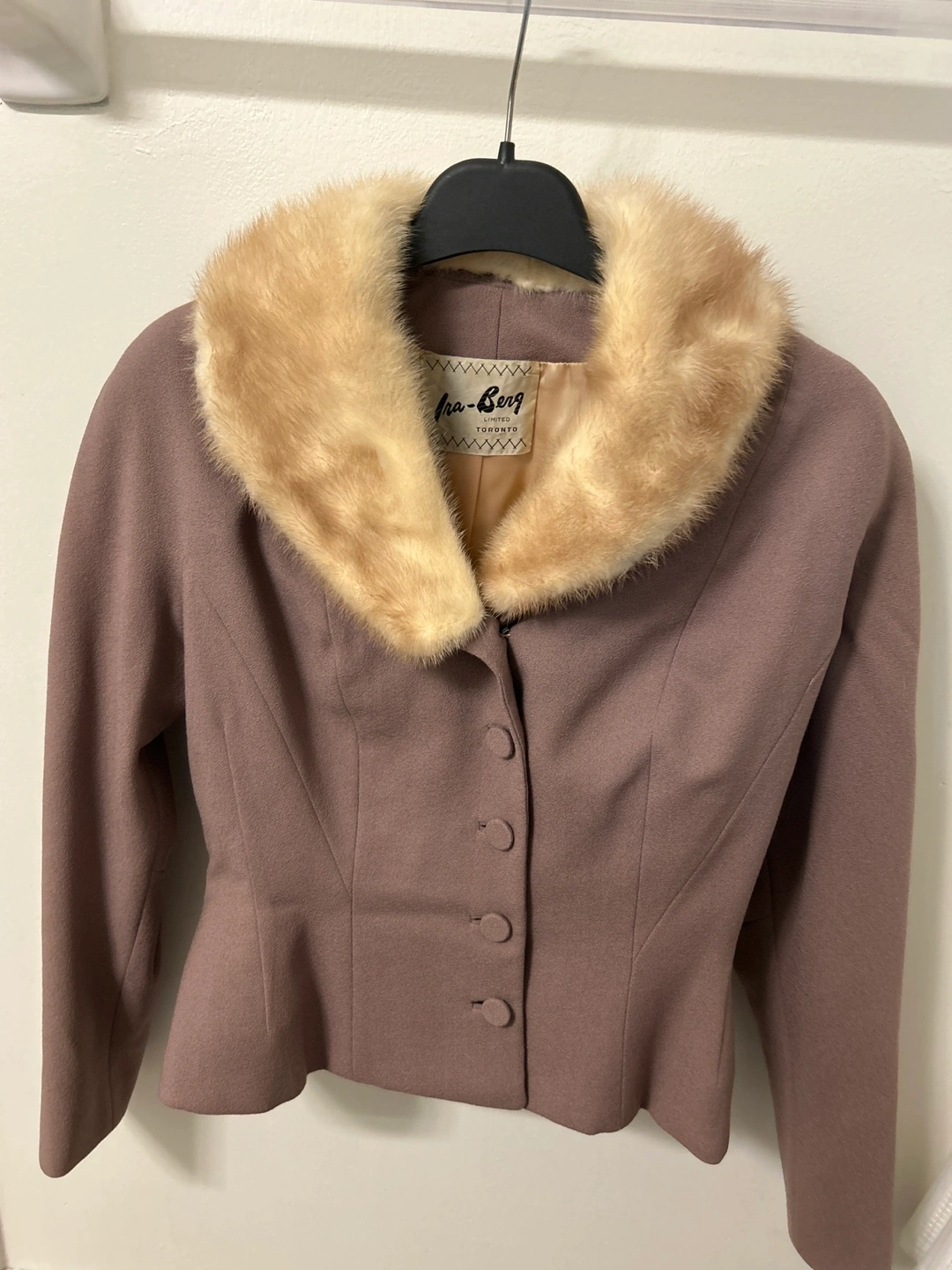 Beautiful vintage jacket. Mauve coloured wool. Features a lovely fur collar, Removeable Classic design. Light mauve satin lining. One of a kind!!