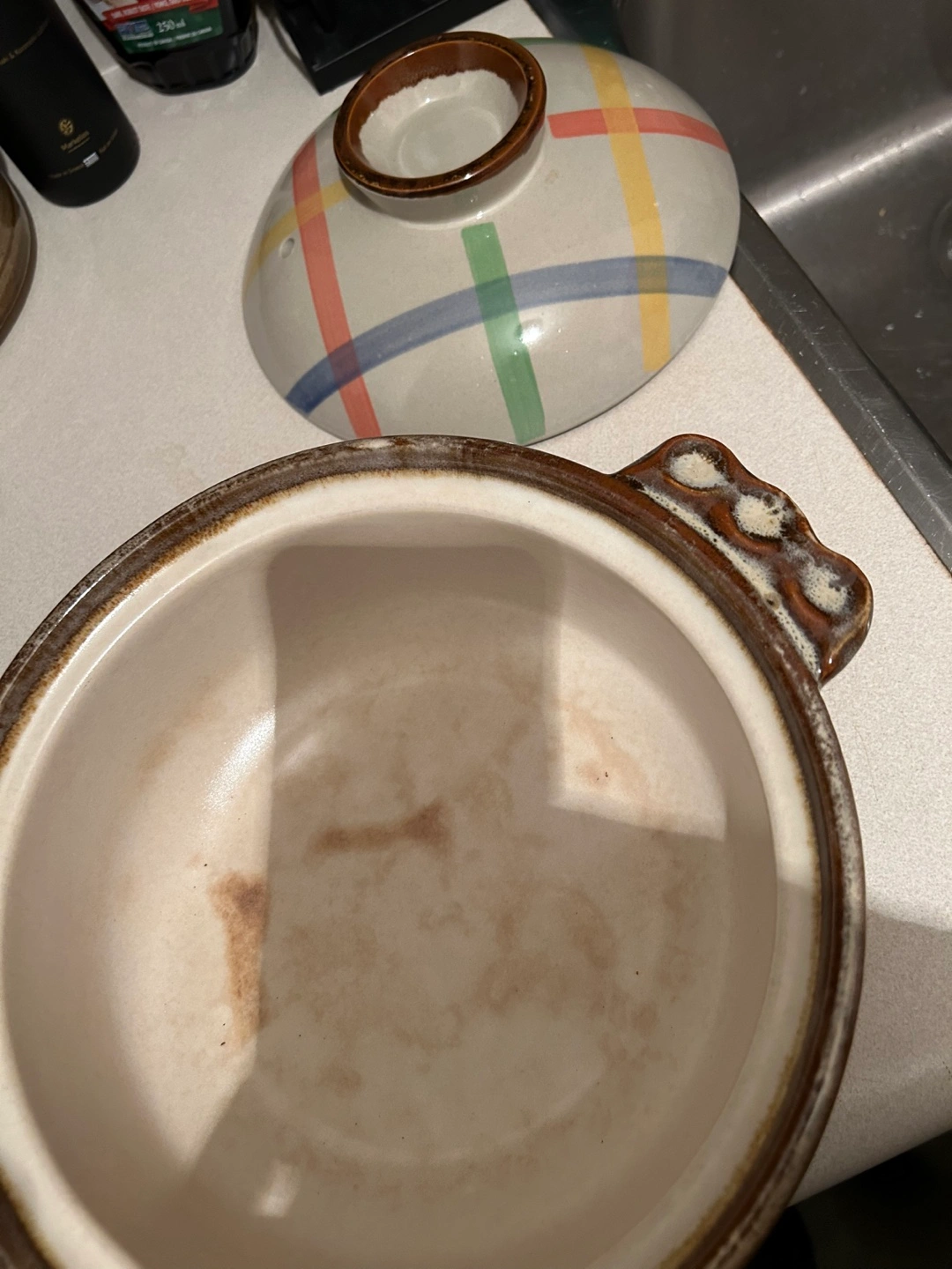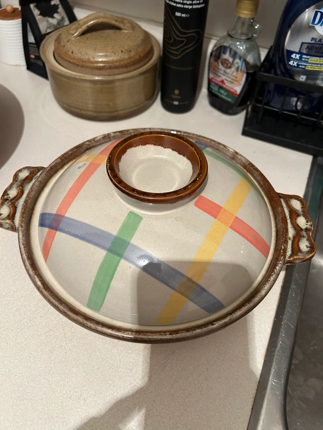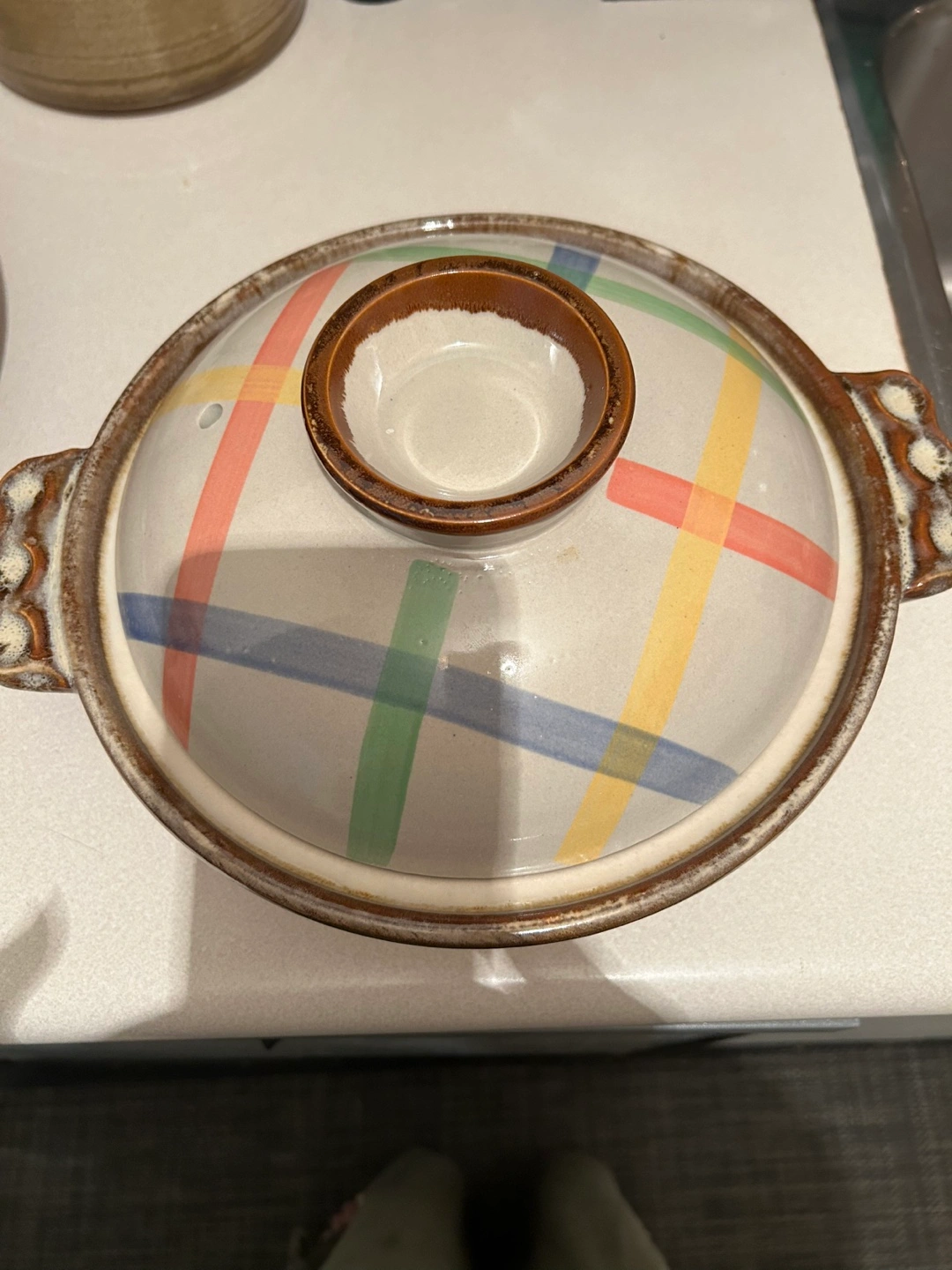 Selling a vintage Japanese Donabe earthenware pot. It features a unique plaid design on the lid and has a charming, rustic feel. It's perfect for cooking and serving hot pot dishes. There are some signs of use, please see photos for condition