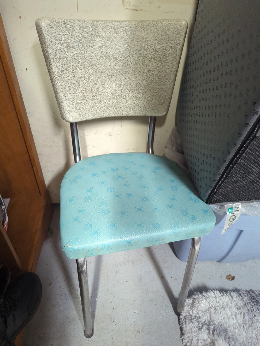 Selling a cute vintage kitchen chair! It has a turquoise seat with a patterned design and a speckled off-white back. The legs are chrome. It has some wear and tear on the seat, but still has a lot of life left!