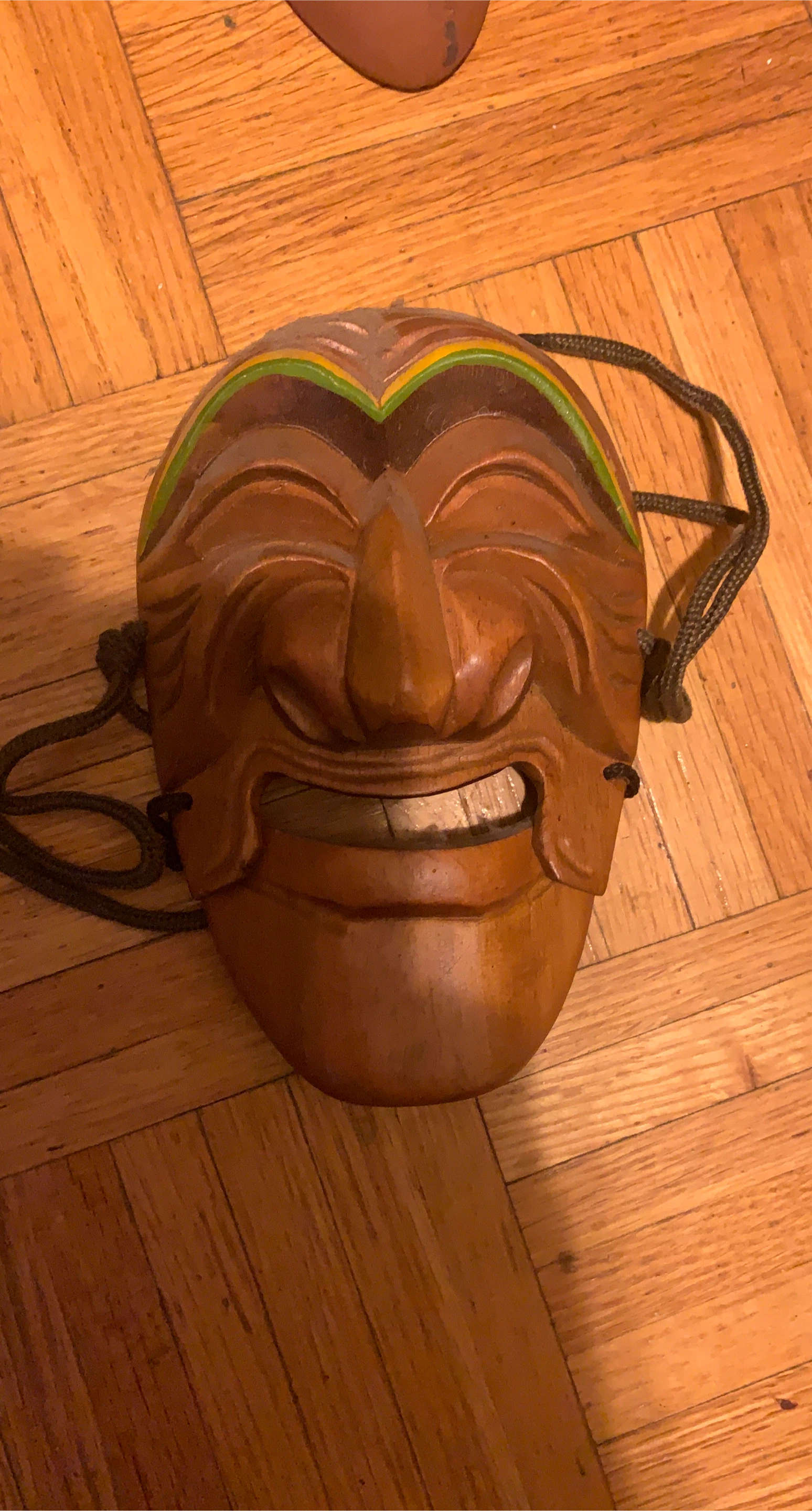Selling a traditional Korean Hahoe mask. It's a beautiful piece of folk art, perfect for display or cultural appreciation. The mask is made of wood and has a unique, expressive face. It has a cord attached for wearing or hanging.