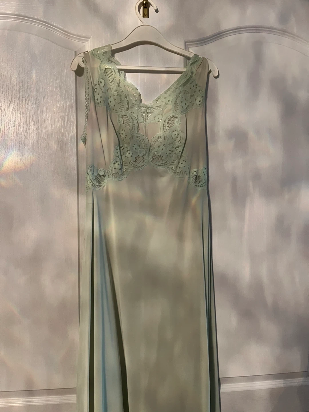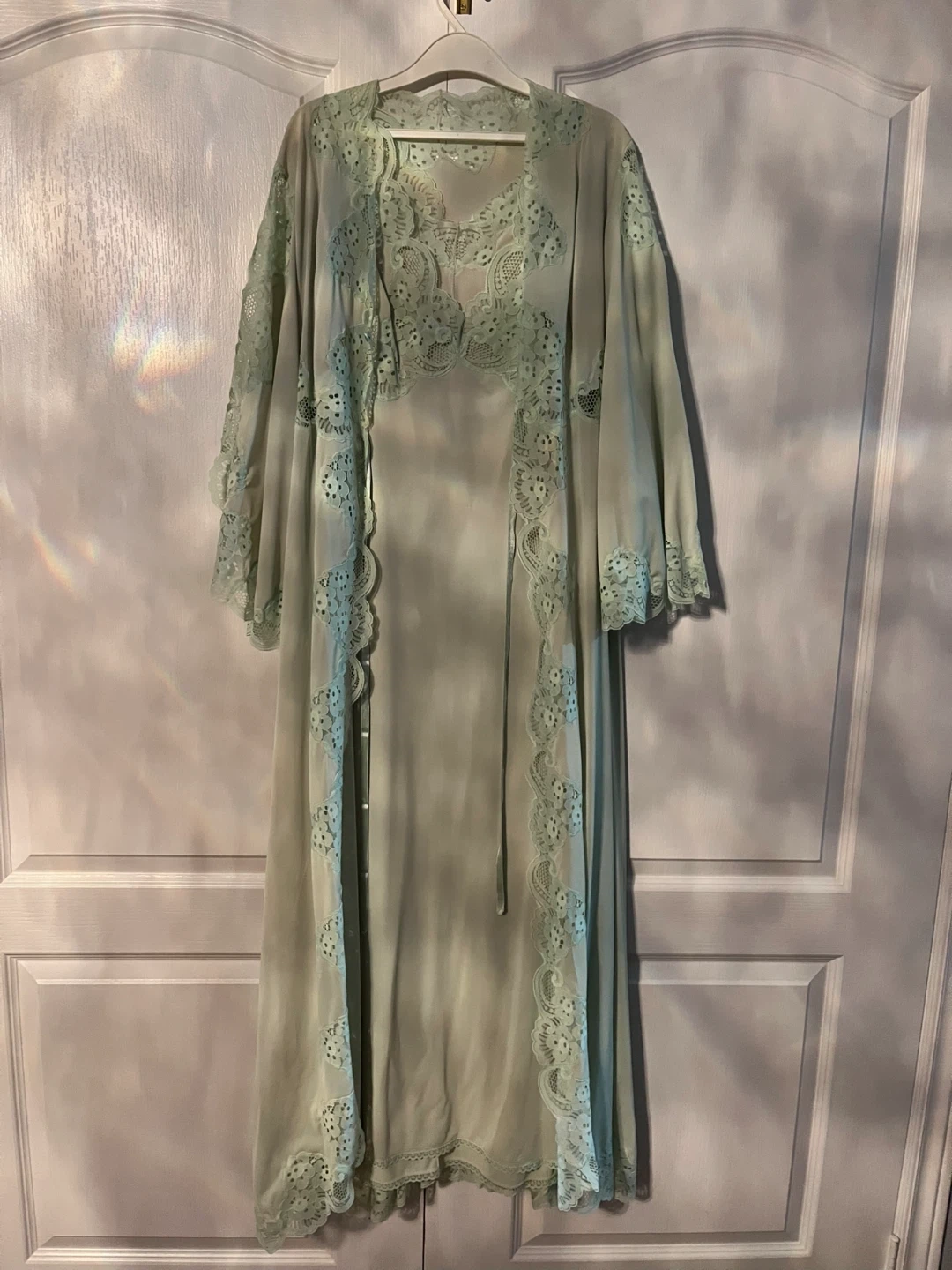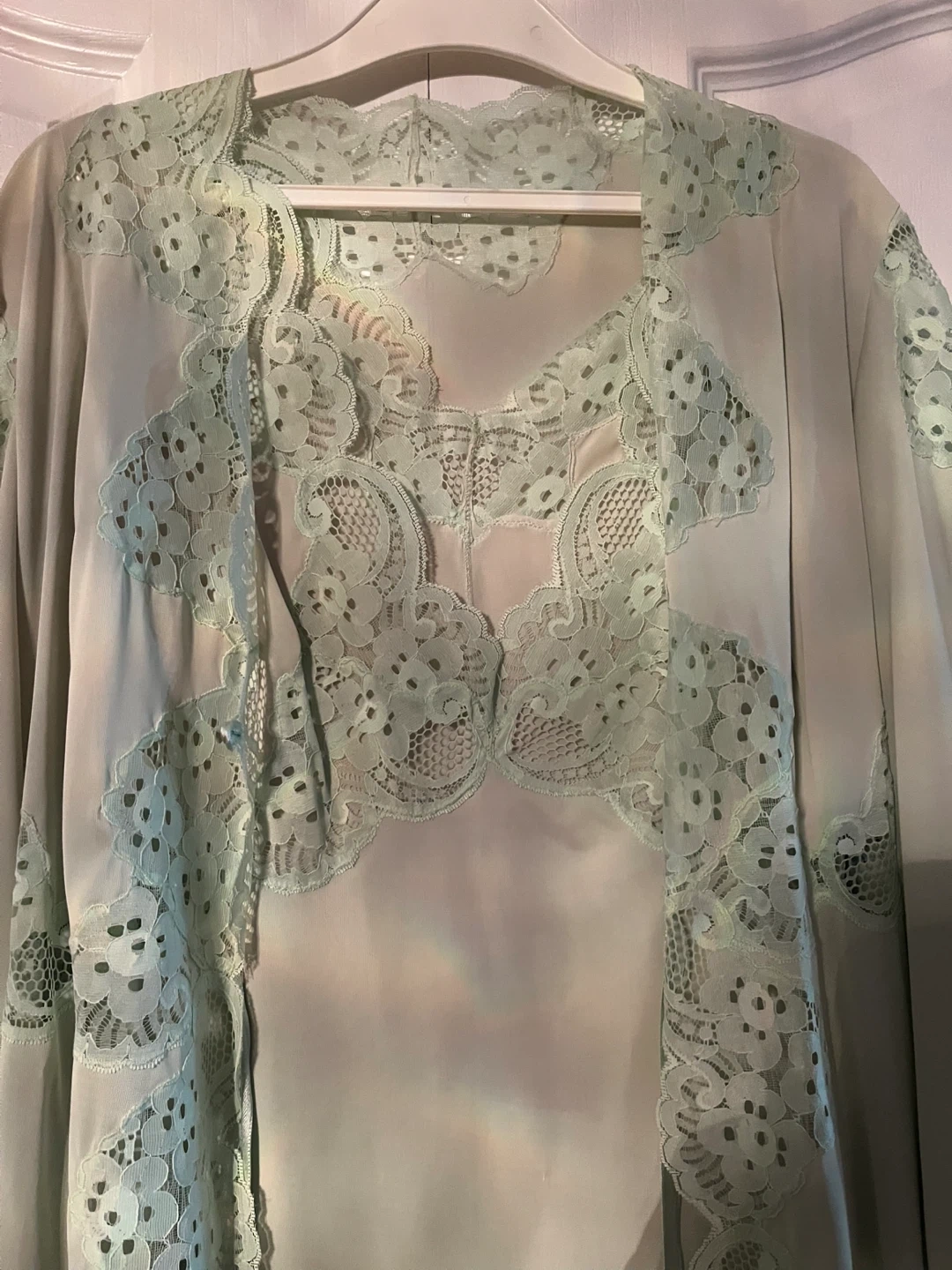 Beautiful vintage lingerie set in a soft, pale green colour. Includes a long nightgown with lace detailing on the bodice and a matching robe with lace trim. Perfect for adding a touch of elegance to your sleepwear collection! Made in Italy ! Bought in Rome never been worn - make an offer