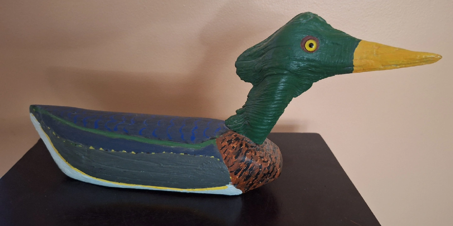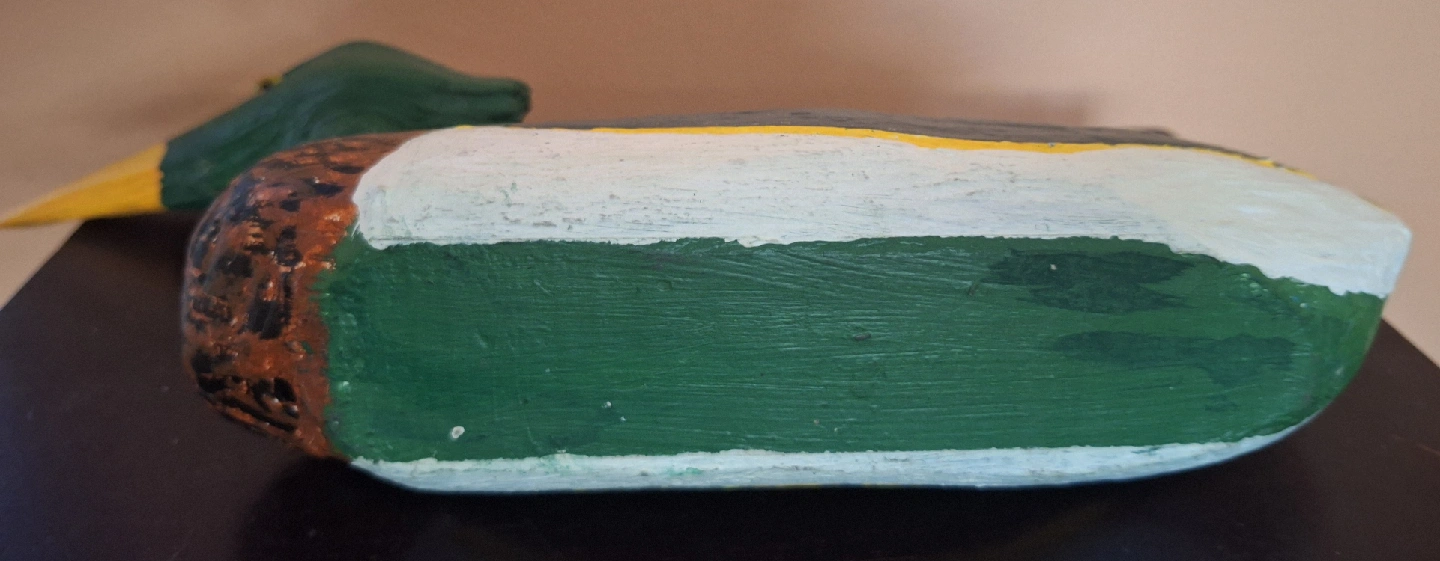 Vintage hand carved duck decoy. Large 17 inches x 8 inches tall. It's painted in various colours, including green, yellow, blue and brown. It would make a great addition to any collection!
