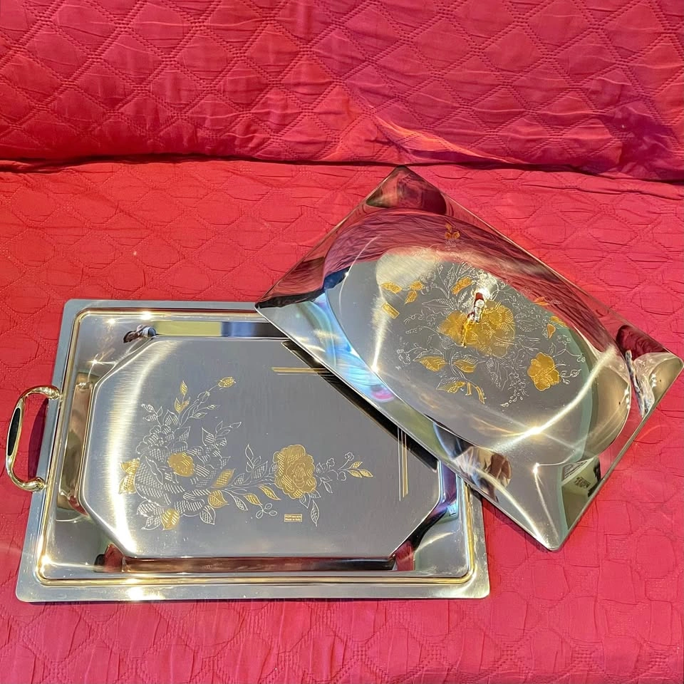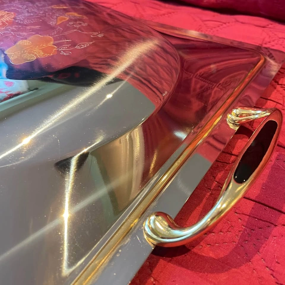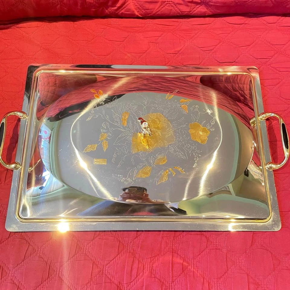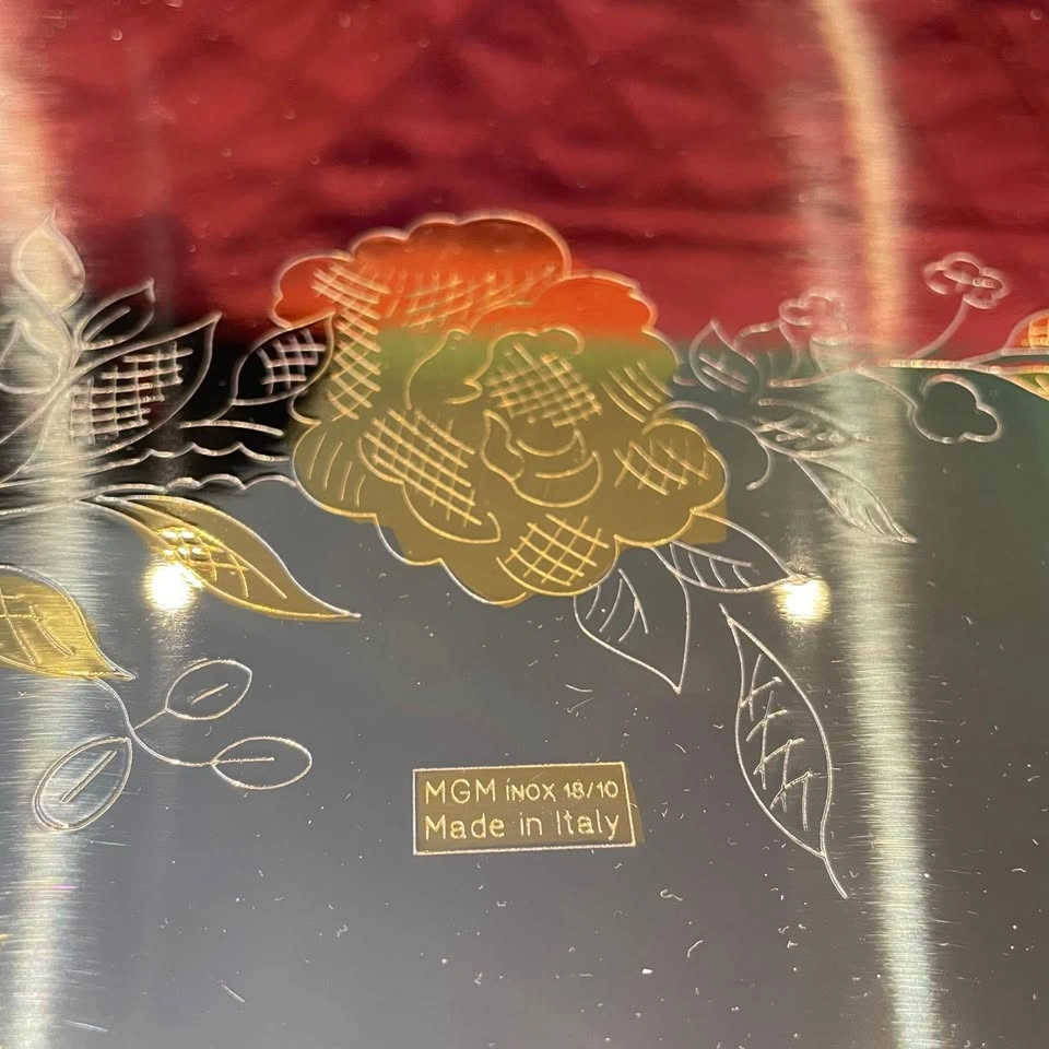 Pick up at Don Mills & Steeles Vintage Italian MGM Inox 18/10 stainless steel rectangular serving tray with lid. Mirror-polished finish with elegant silver and 24k gold floral accents. Perfect for serving desserts, appetizers, drinks at parties, buffets, and home gatherings, or as a decorative centerpiece. Condition: Excellent condition, never used. Dimensions: 17.7” x 12.4” (45 cm x 31.5 cm) without handles Brand: MGM (Made in Italy) What is 18/10 Stainless Steel? Made from premium stainless steel containing 18% chromium and 10% nickel. This composition provides excellent resistance to rust, stains, and corrosion, while maintaining a bright, polished finish. 18/10 stainless steel is widely used in professional kitchens and high-quality tableware.