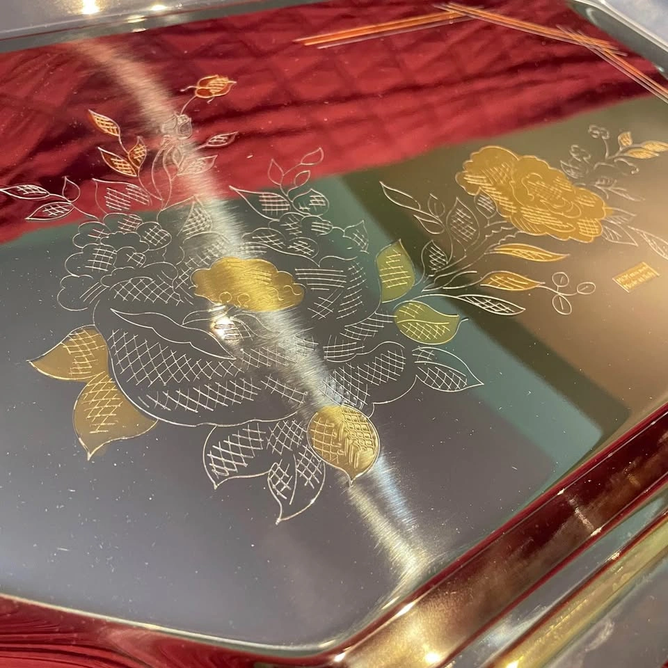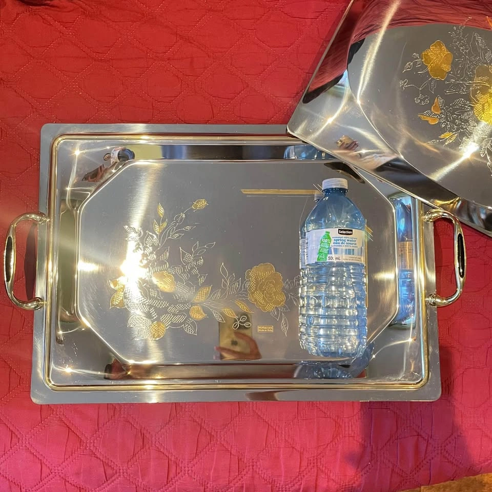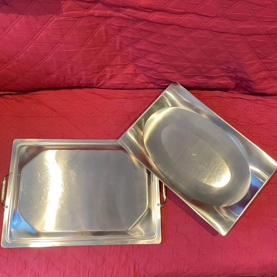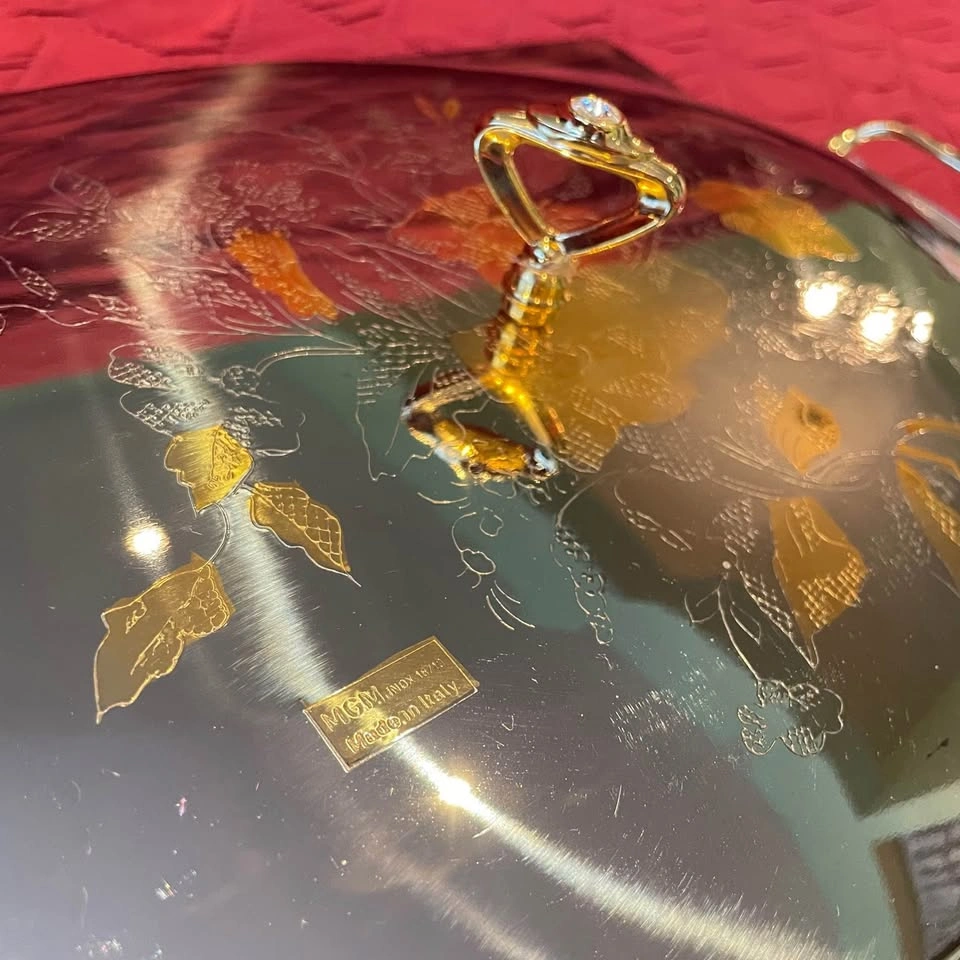 Pick up at Don Mills & Steeles Vintage Italian MGM Inox 18/10 stainless steel rectangular serving tray with lid. Mirror-polished finish with elegant silver and 24k gold floral accents. Perfect for serving desserts, appetizers, drinks at parties, buffets, and home gatherings, or as a decorative centerpiece. Condition: Excellent condition, never used. Dimensions: 17.7” x 12.4” (45 cm x 31.5 cm) without handles Brand: MGM (Made in Italy) What is 18/10 Stainless Steel? Made from premium stainless steel containing 18% chromium and 10% nickel. This composition provides excellent resistance to rust, stains, and corrosion, while maintaining a bright, polished finish. 18/10 stainless steel is widely used in professional kitchens and high-quality tableware.