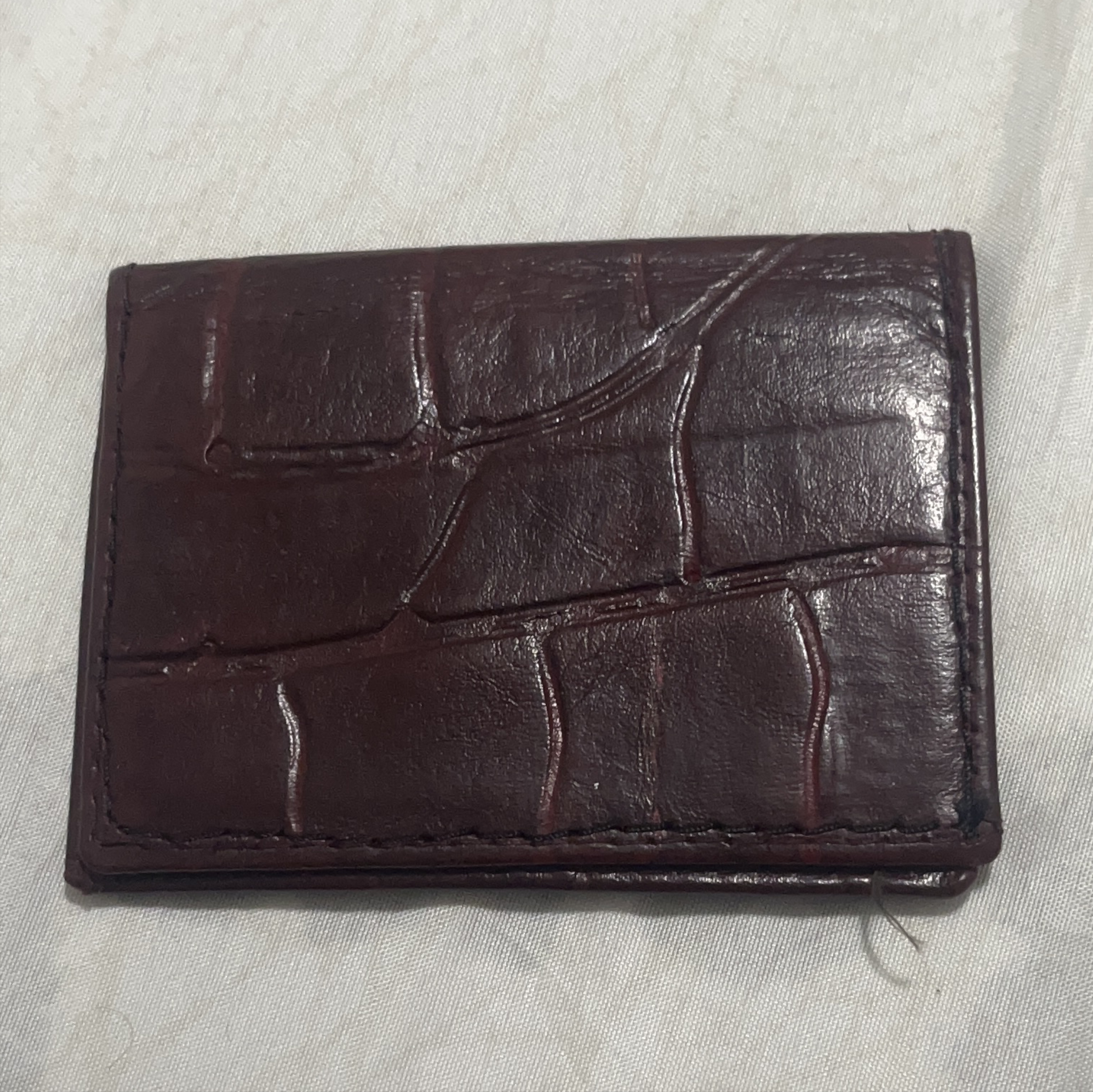 Dark brown leather card holder. Crocodile embossed pattern. Multiple card slots and clear ID window. Compact size, perfect for minimalists.