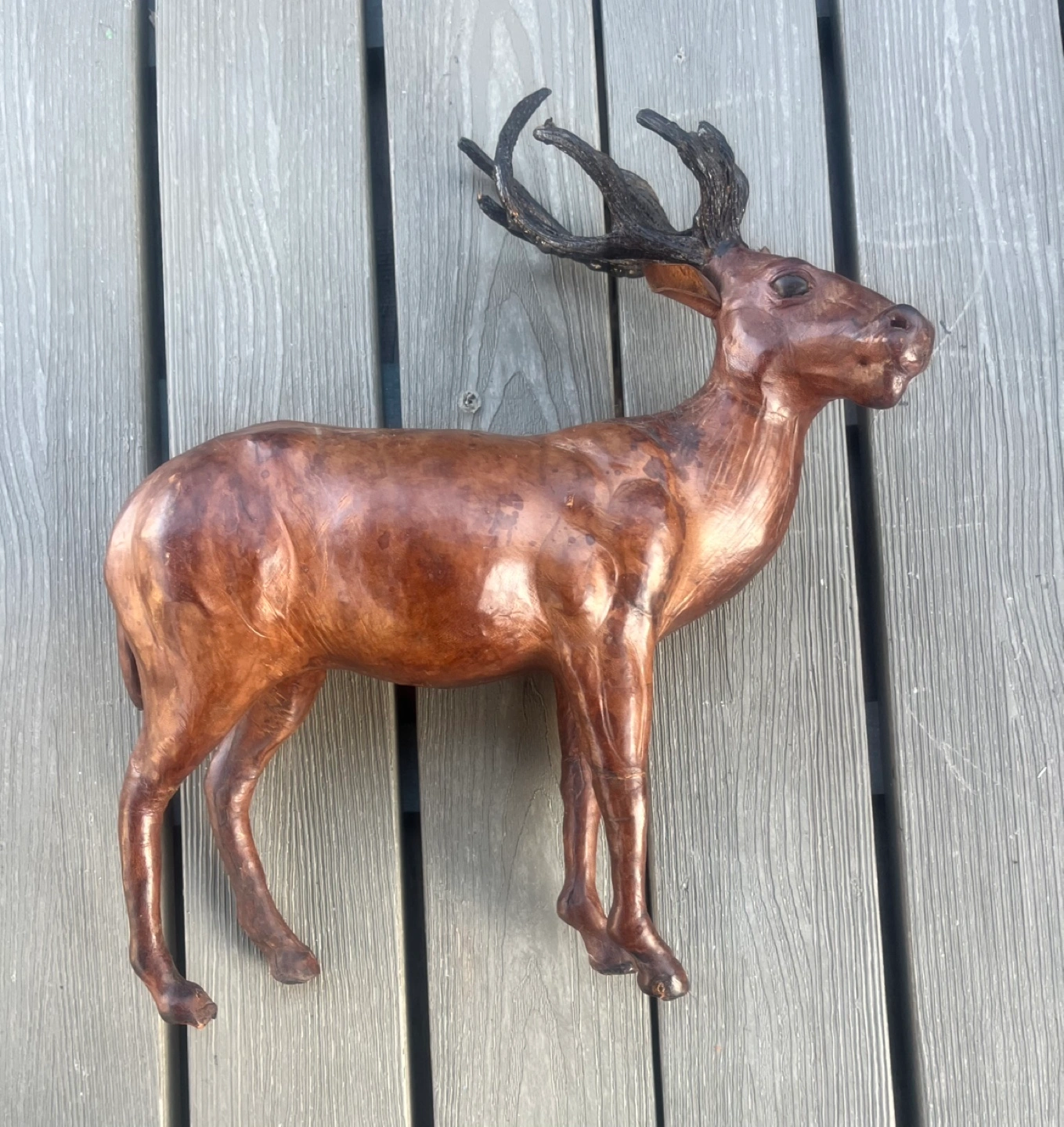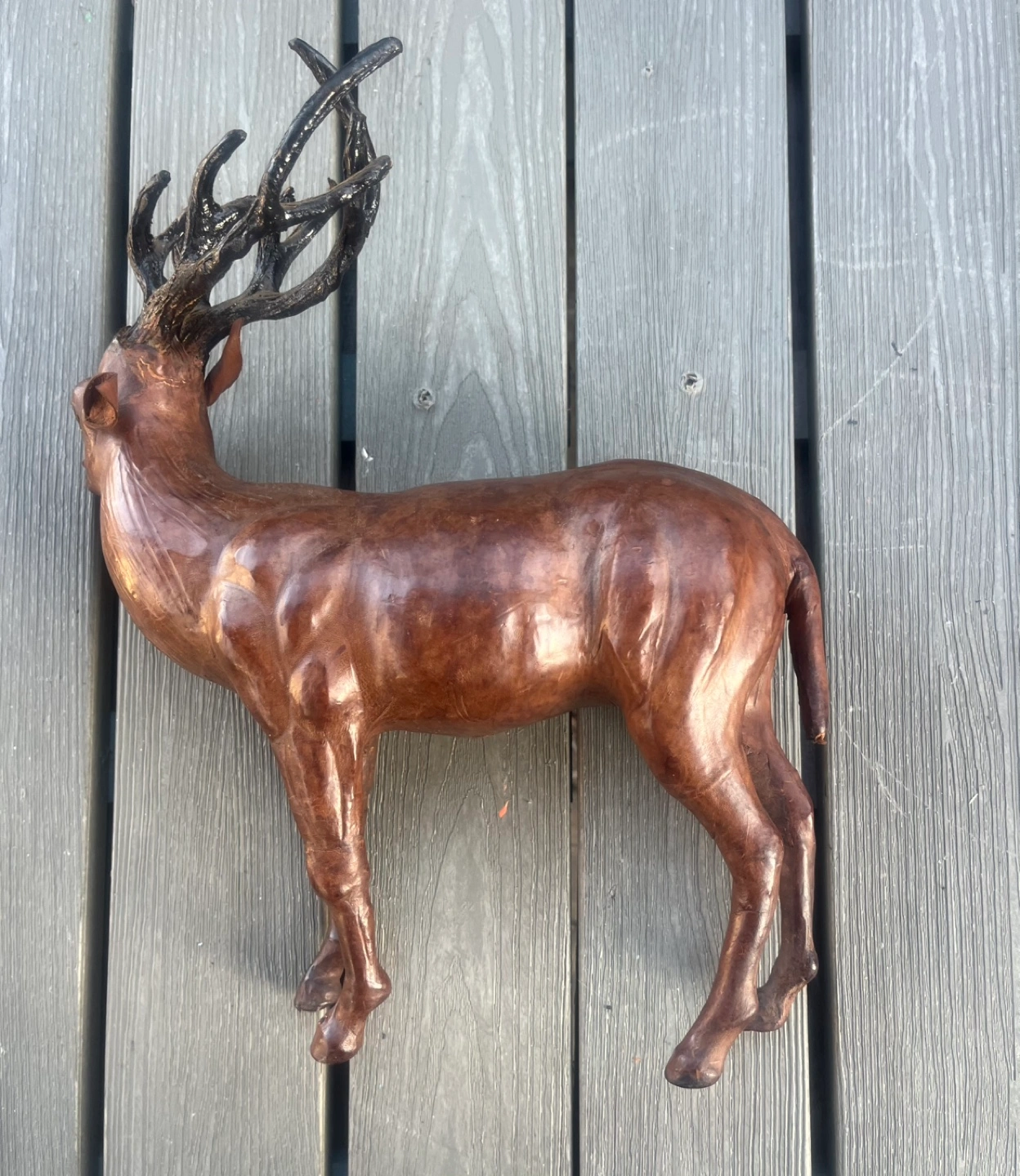Brown leather deer figurine. Large antlers. Unique home decor. Collectible item.