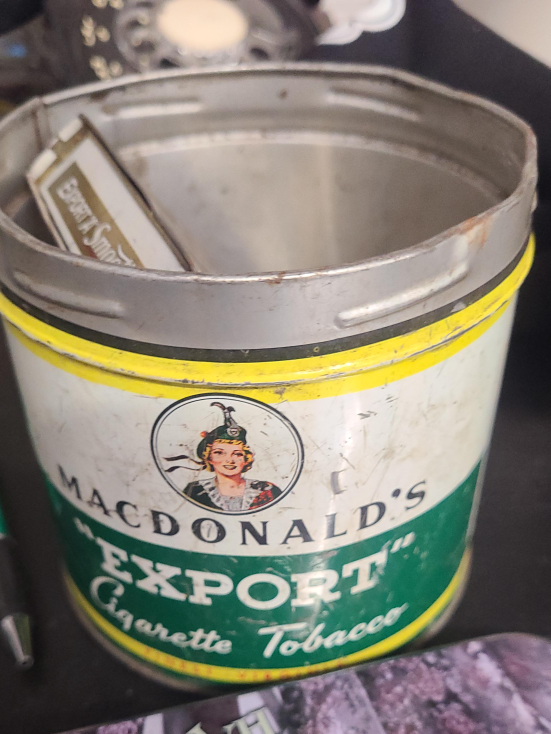 Selling a vintage MacDonald's 'Export' Cigarette Tobacco tin. It shows signs of wear, adding to its unique character and vintage appeal! Perfect for collectors or as a decorative piece