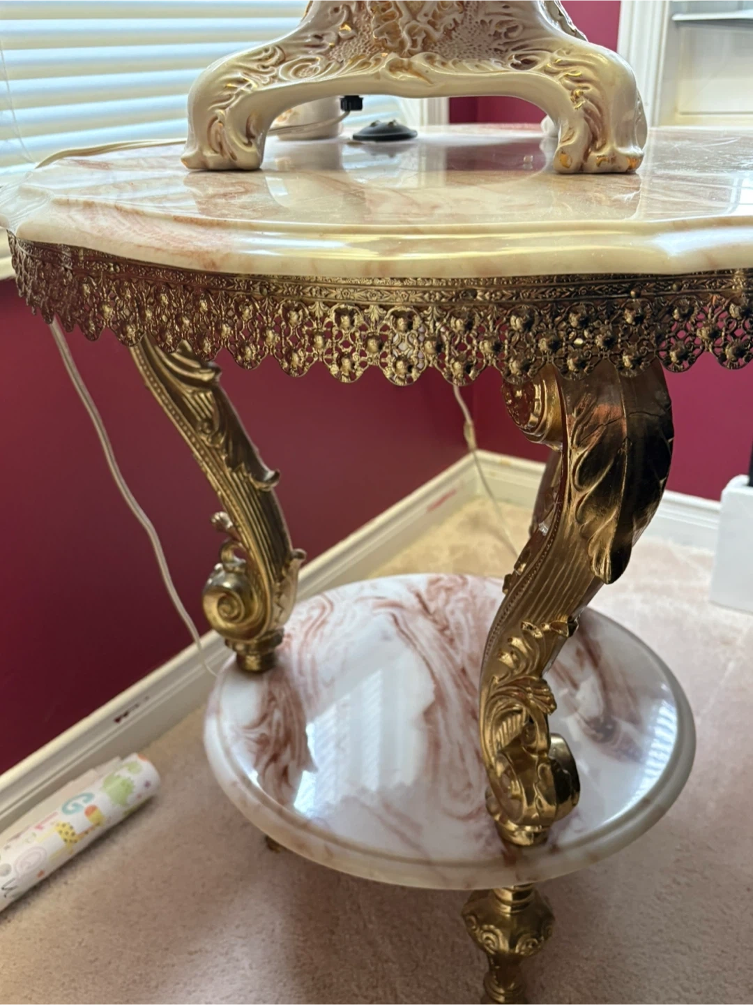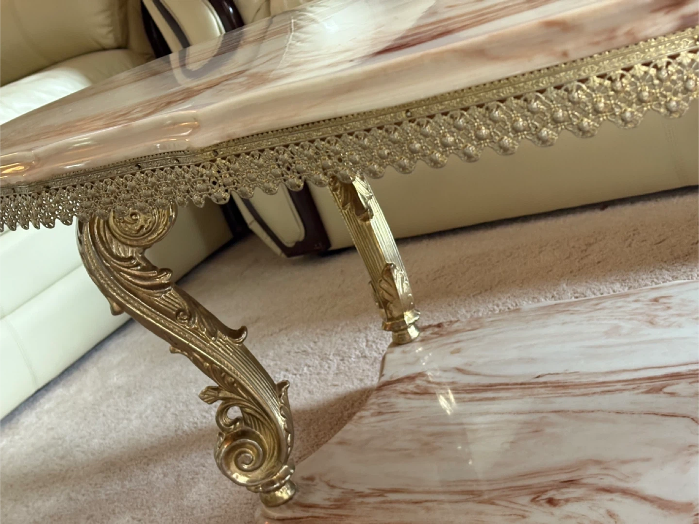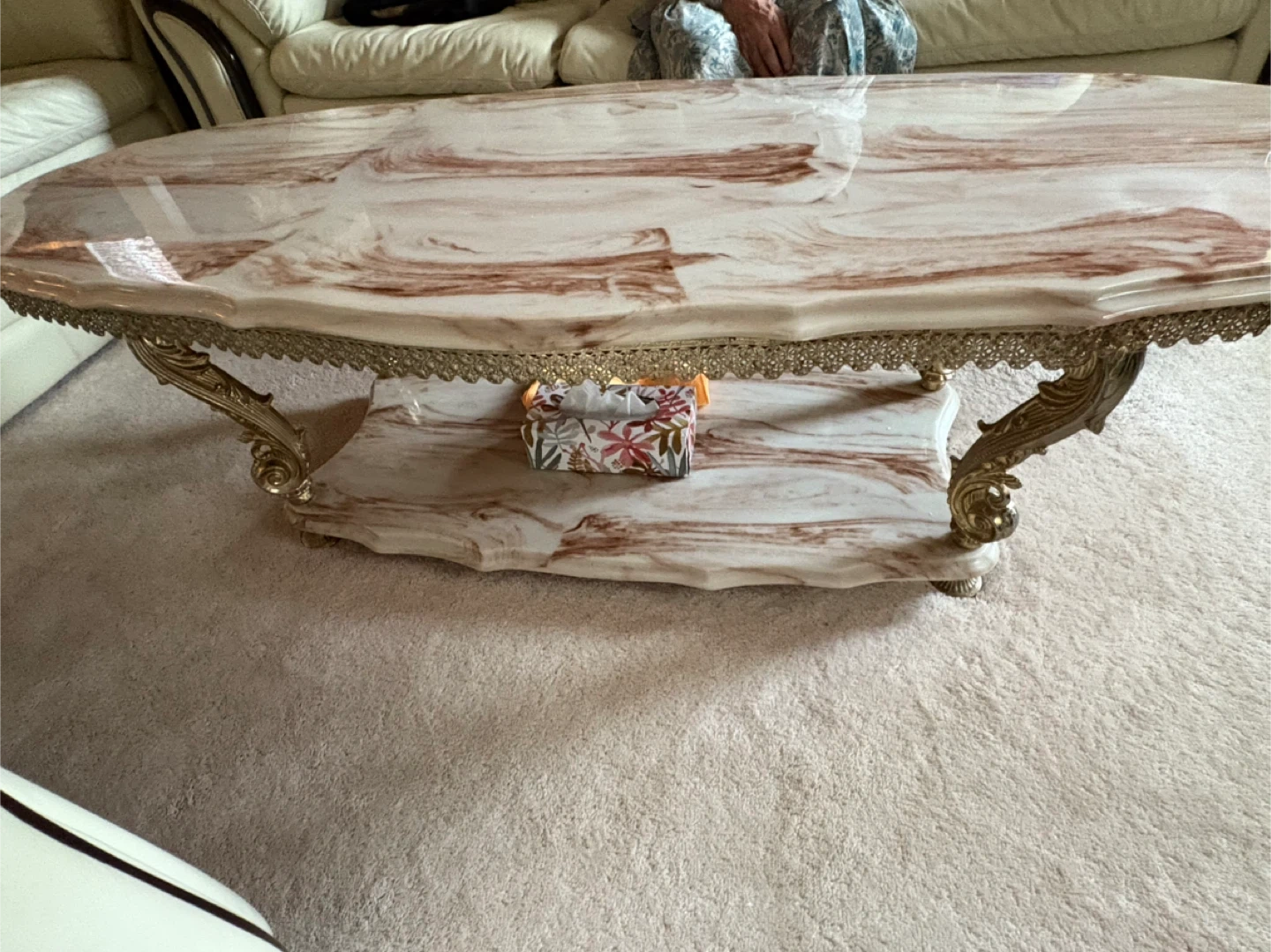 Selling a beautiful coffee table with a marble top and ornate gold accents along with 2 side tables. It has a unique design that would add a touch of elegance to any living room. It's in great condition and ready for a new home!