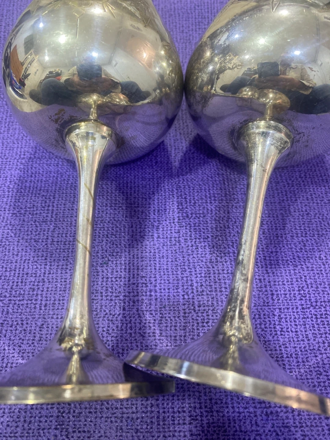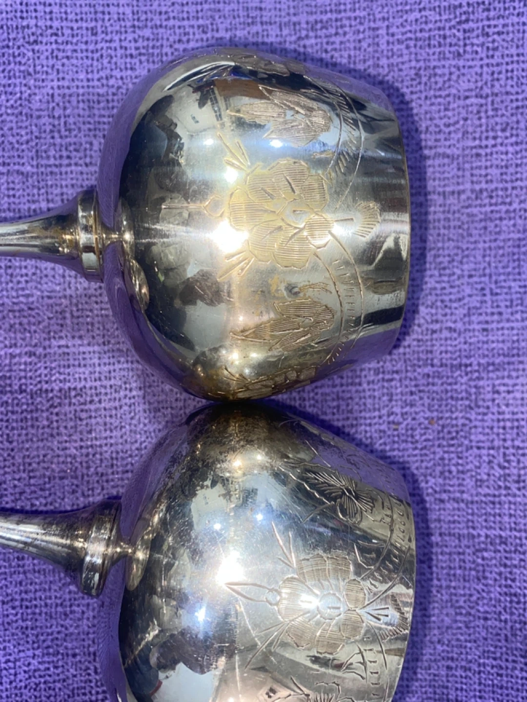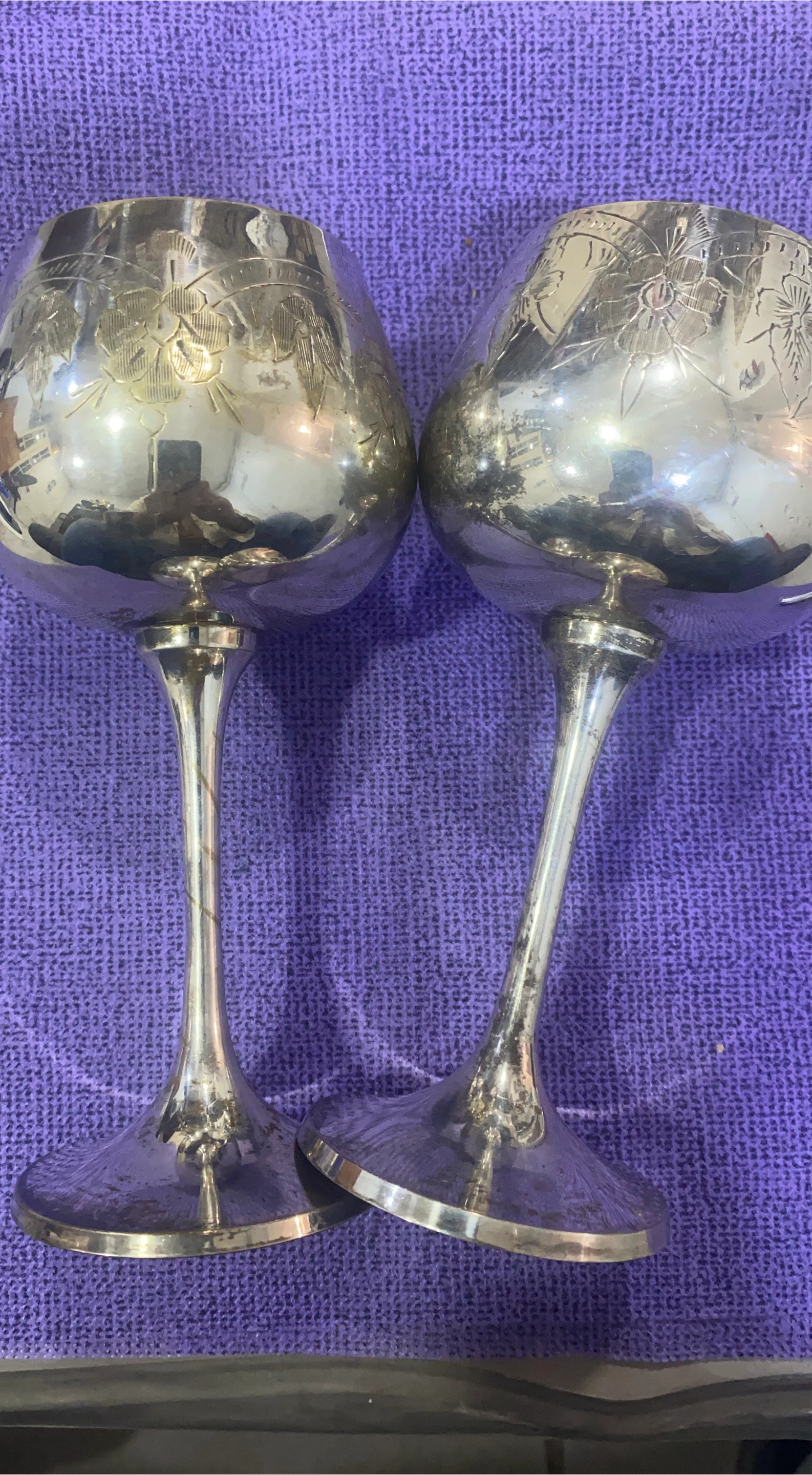 Selling a set of two vintage silver wine goblets. They have a lovely floral design etched around the top. Perfect for adding a touch of elegance to your table!