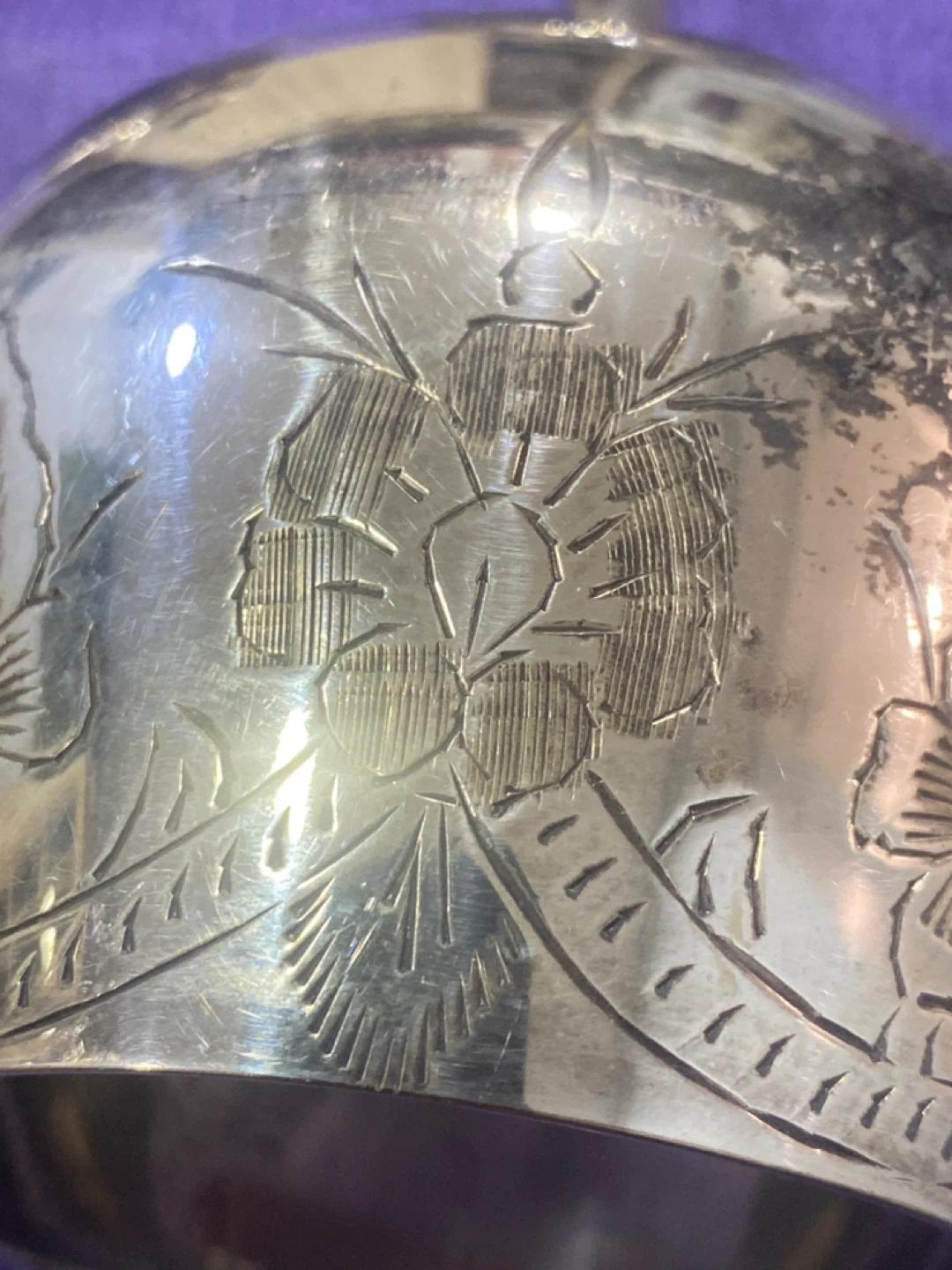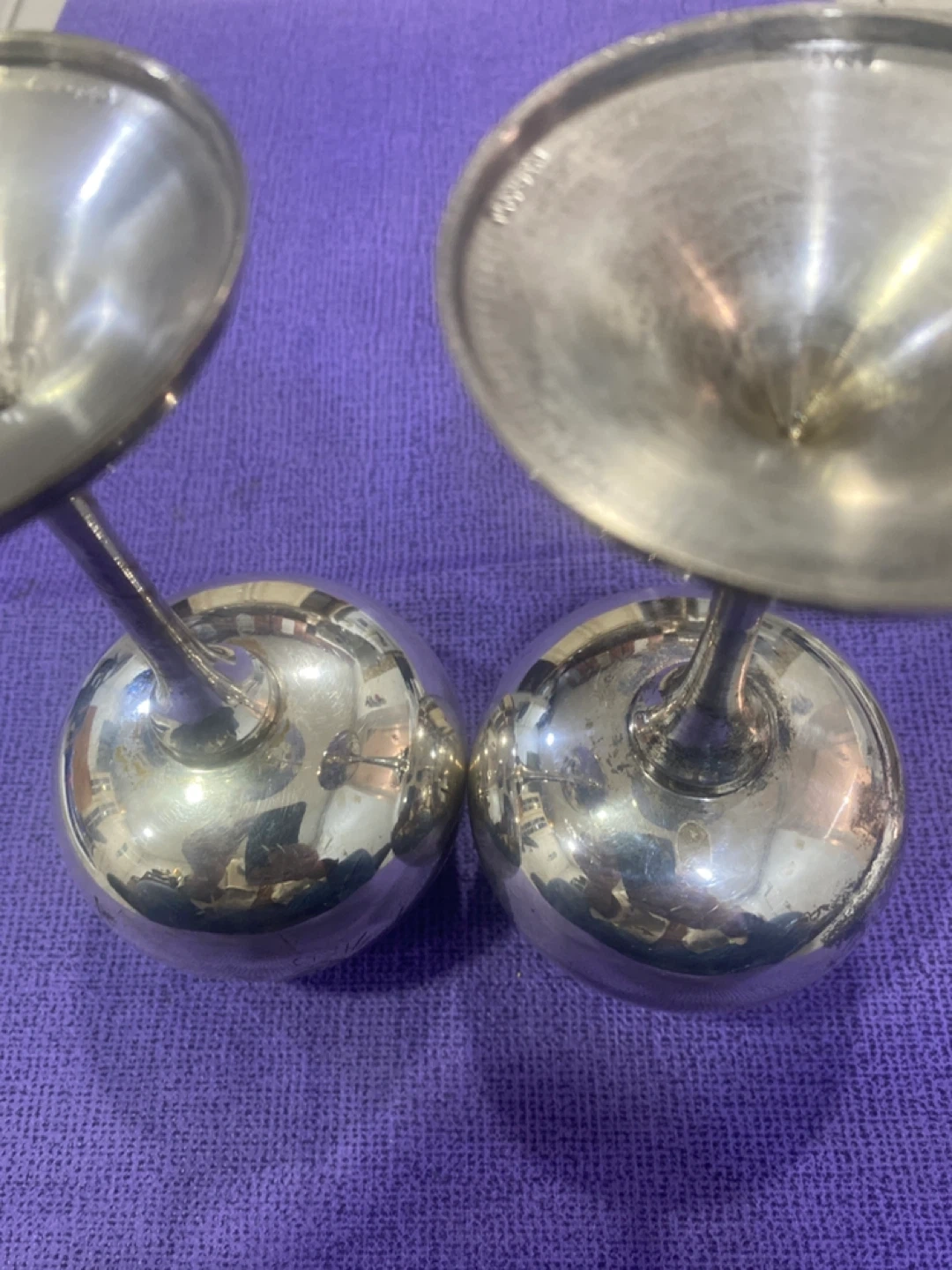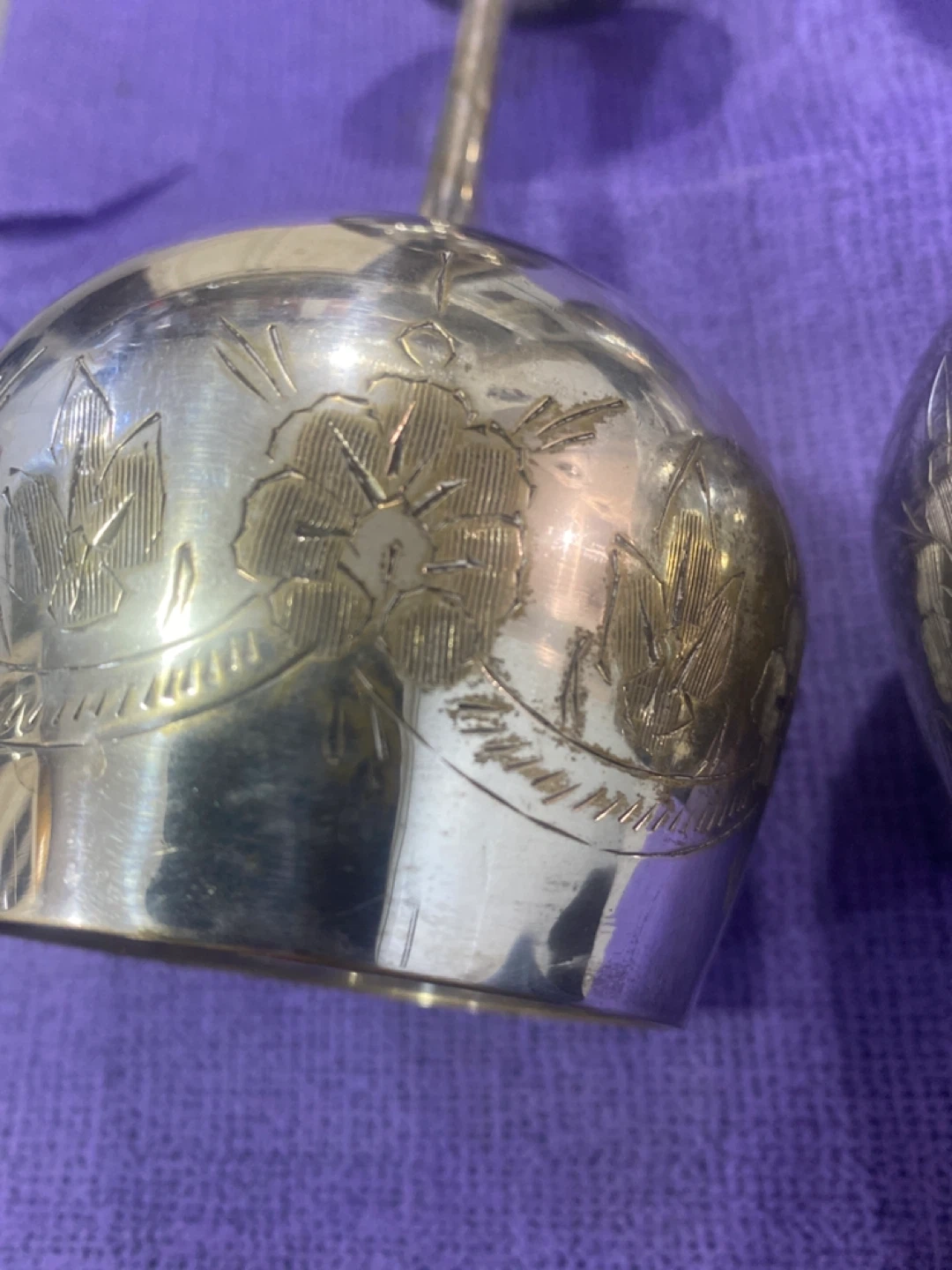 Selling a set of two vintage silver wine goblets. They have a lovely floral design etched around the top. Perfect for adding a touch of elegance to your table!