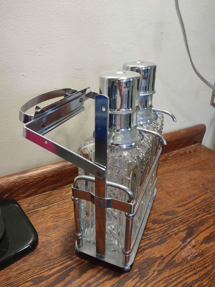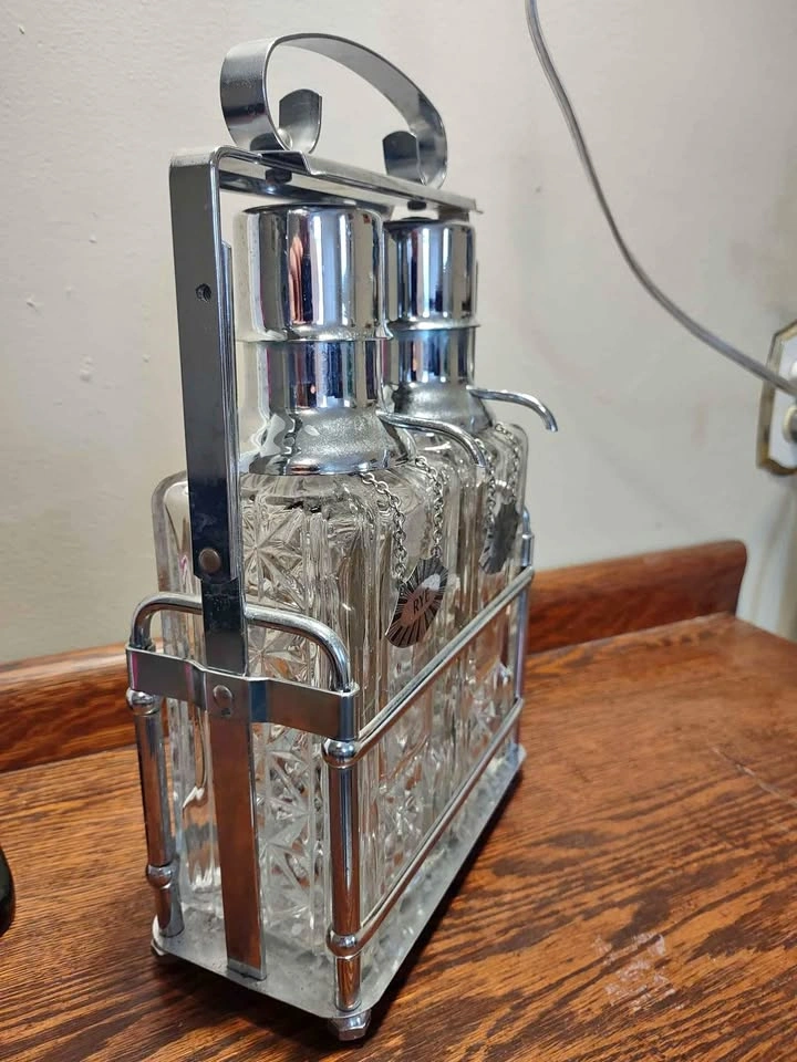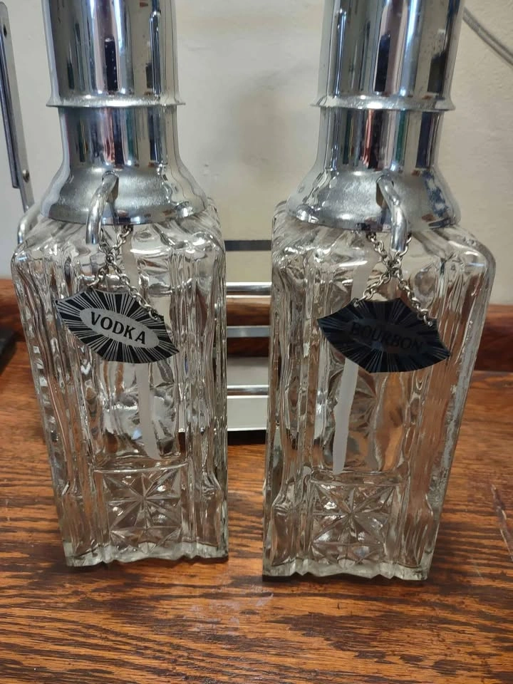 Great vintage barware item. Two liquor pump decanters, each with tags that have different liquors on each side. Includes: Scotch, Vodka, Bourbon and Rye. Fabulous Glass and Chrome - a great bar item that will look great in any setting. Pick up near Grand River hospital Kitchener