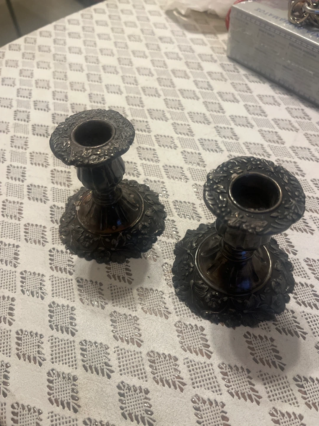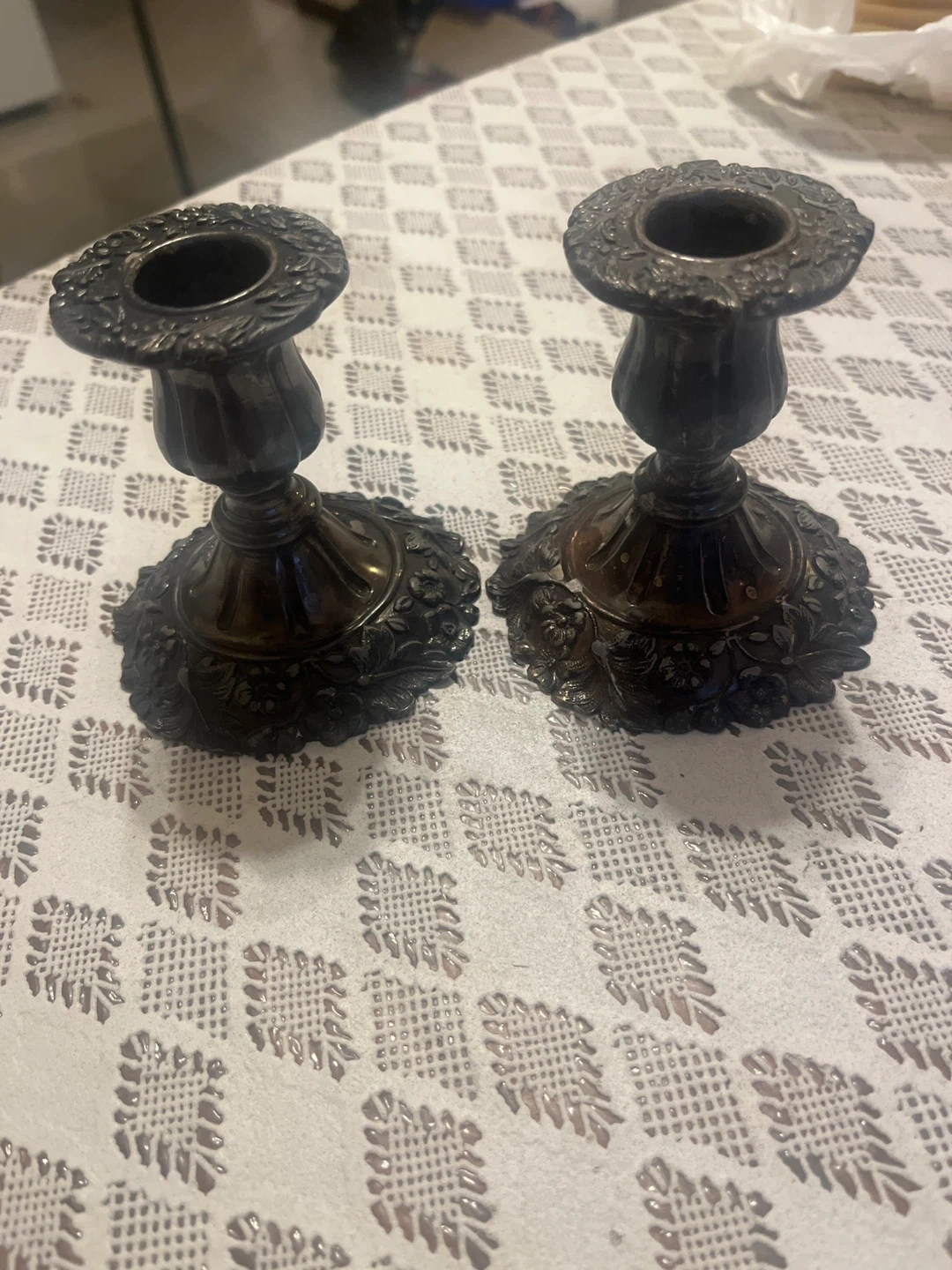 Selling a pair of vintage metal candlestick holders. They have a lovely floral design and are in great condition. Perfect for adding a touch of elegance to your home!