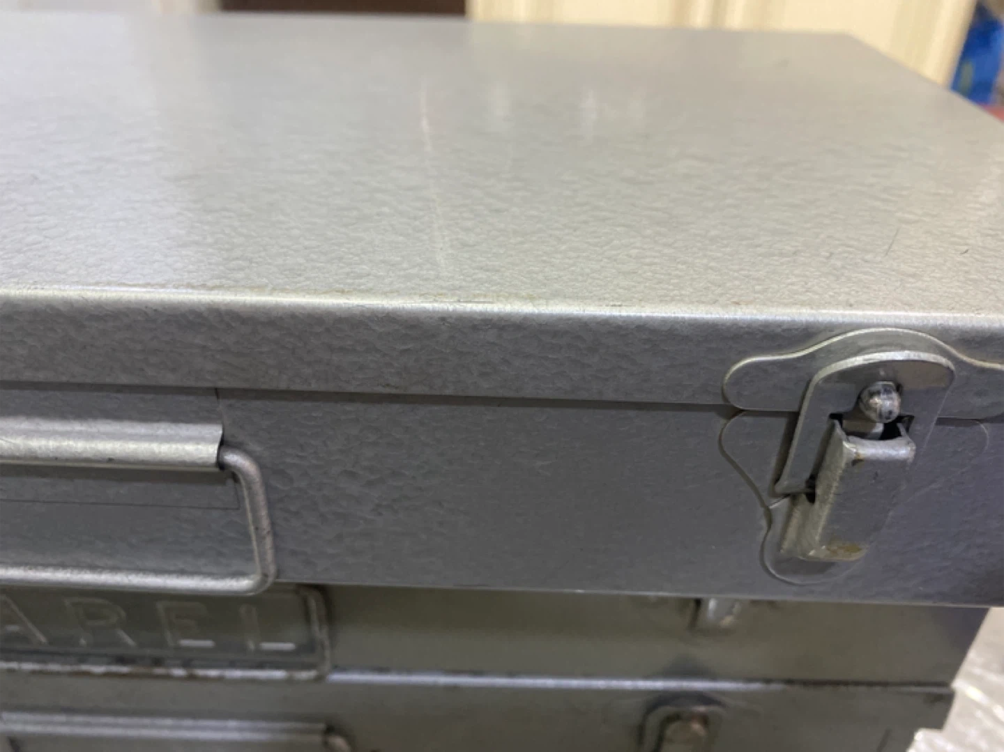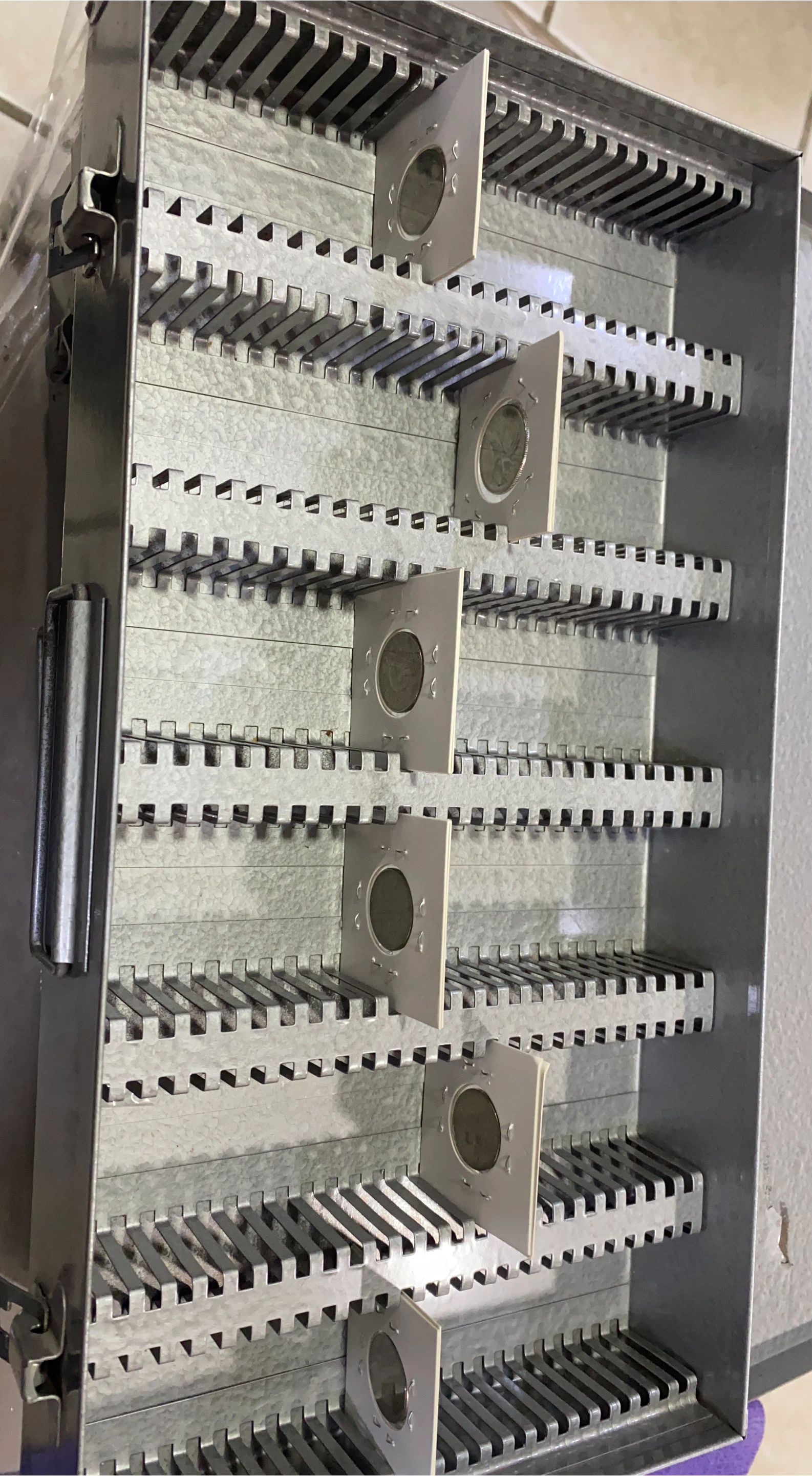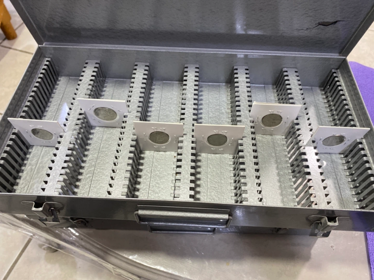 Selling a vintage metal box designed for coin storage. It has multiple rows with individual slots and coin holders. The box has a latch closure and is in good condition for its age. Great for collectors!