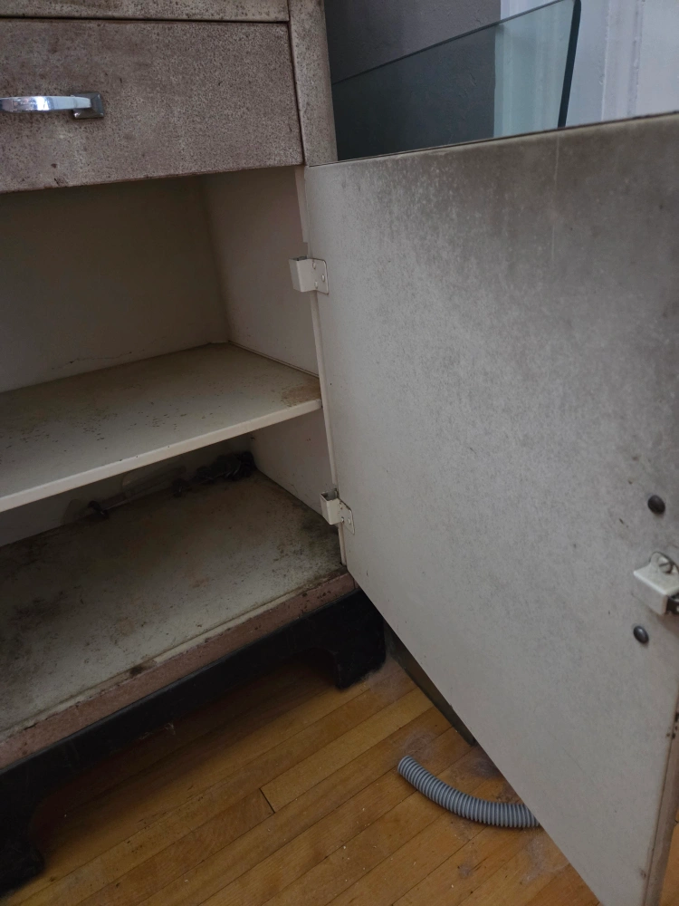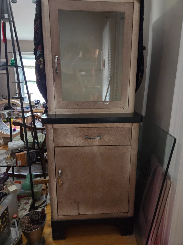 Selling a vintage metal medical cabinet. It features a glass door on top and a drawer and cabinet below. Perfect for adding a unique, industrial touch to your space! It shows signs of wear and age, adding to its character. The metal is in great condition. You can strip the paint and buff up the metal finish.Has light which turns on when door is opened. 60" h x 24" w x 17" d