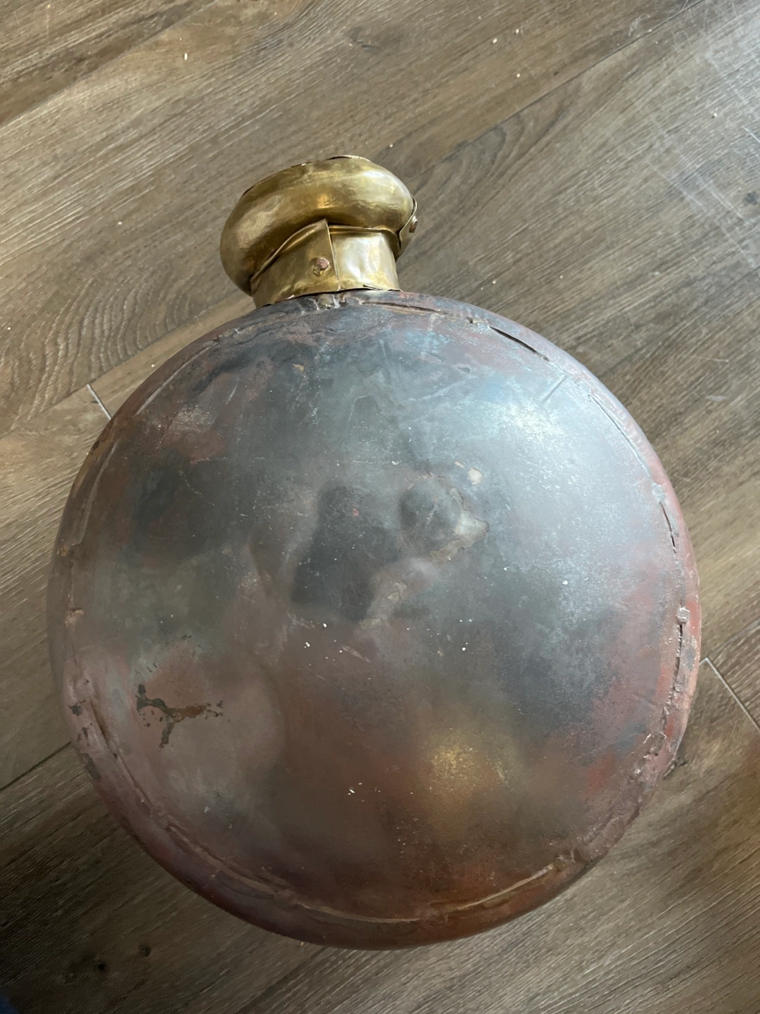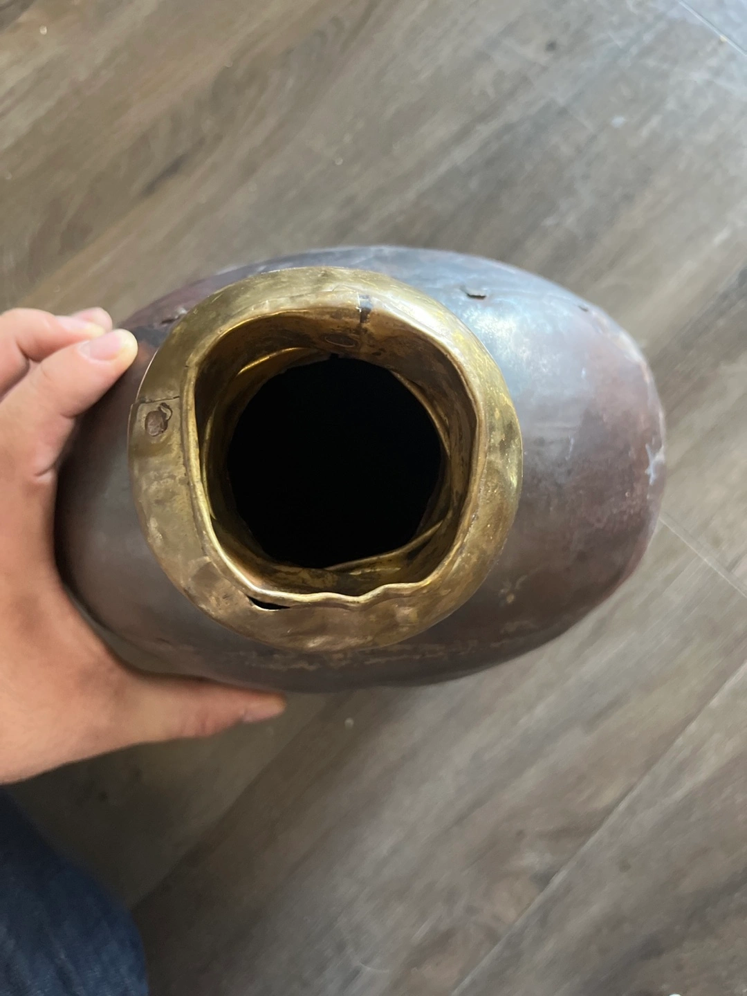 Antique-looking metal water pot. Round shape, dark brown/grey colour. Brass coloured accents around the opening. Unique design.
