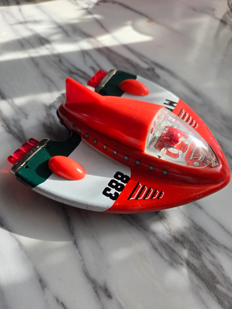 Collectible tin toy spaceship. Red, white, and green colours. Features small lights. Made in China. P/U in Blackfalds