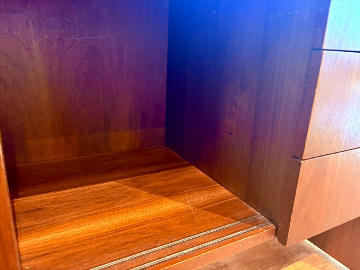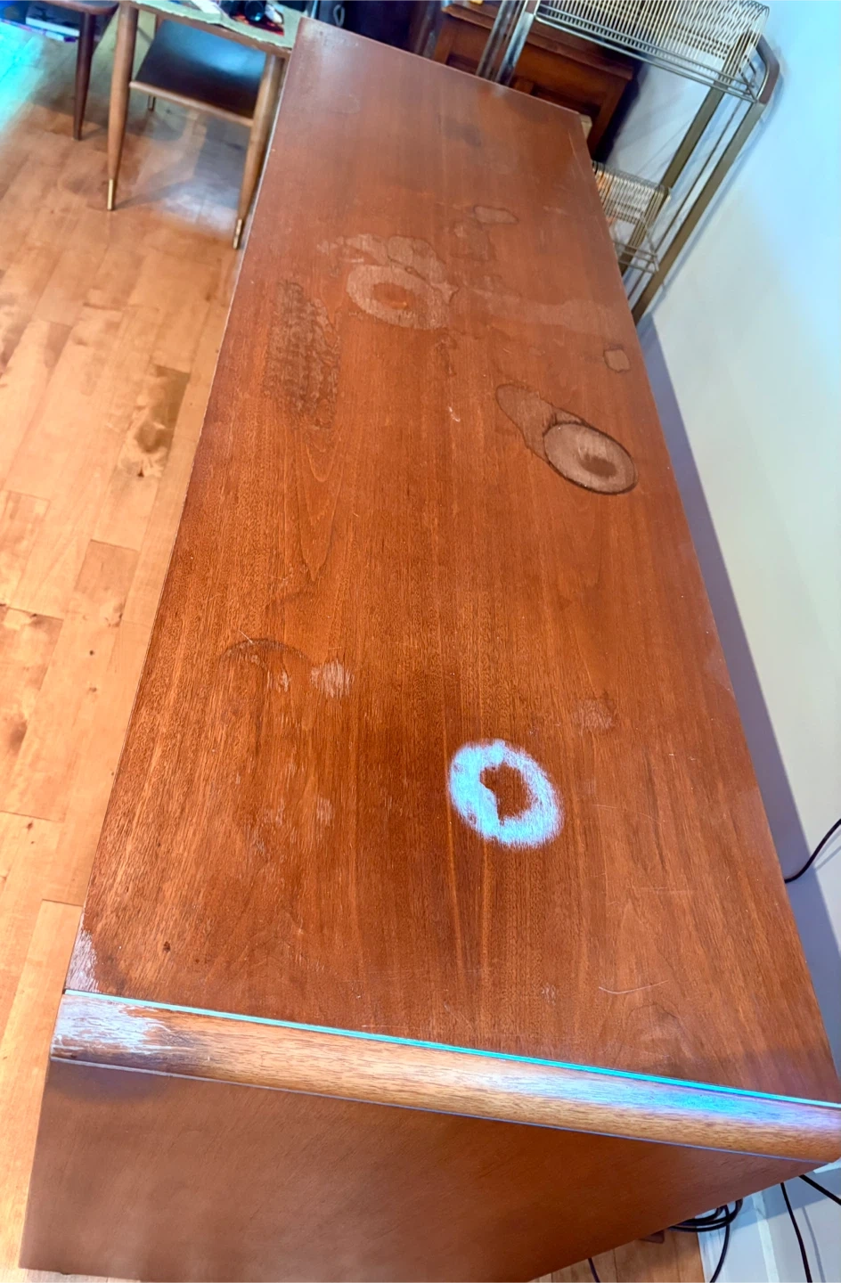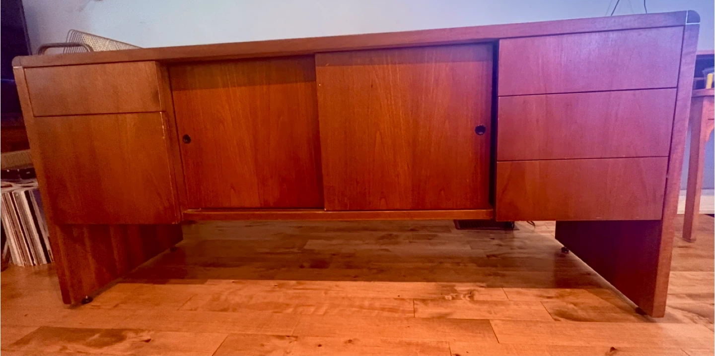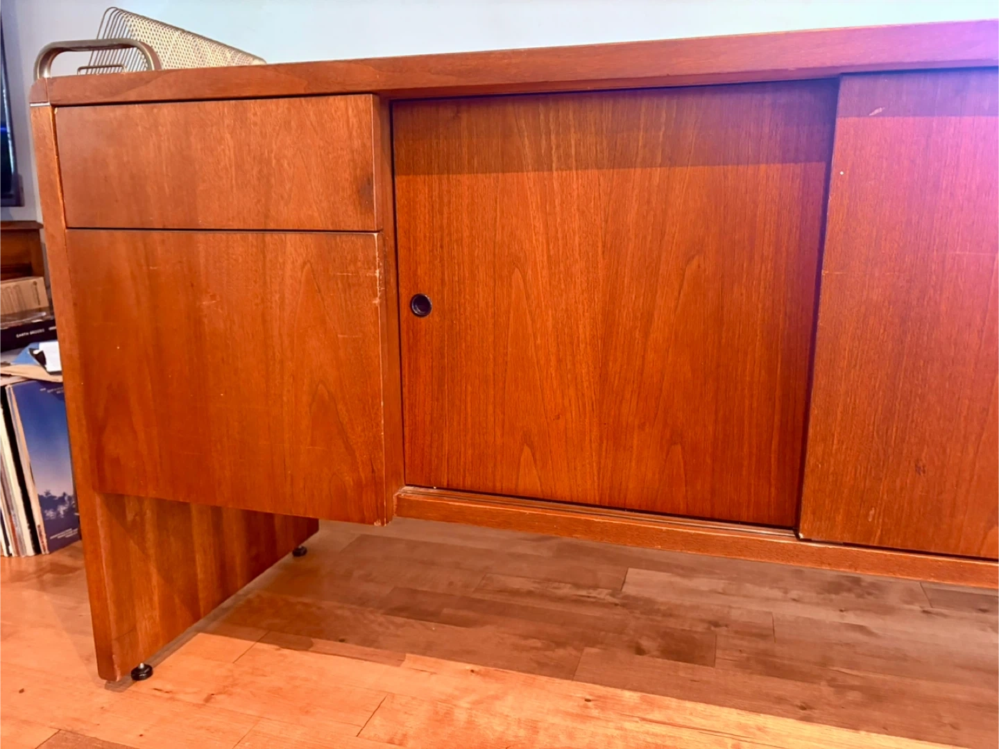 Gorgeous mid-century modern teak Credenza. Water damage on top, otherwise in excellent vintage condition. This piece would make a fabulous refinishing project opportunity! Dimensions: 65.5L x 29H x 19.5D Pick up only near Bermondsey & O’Connor. Will require a truck and 2 people to move. Cross-posted