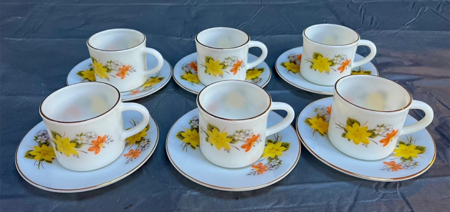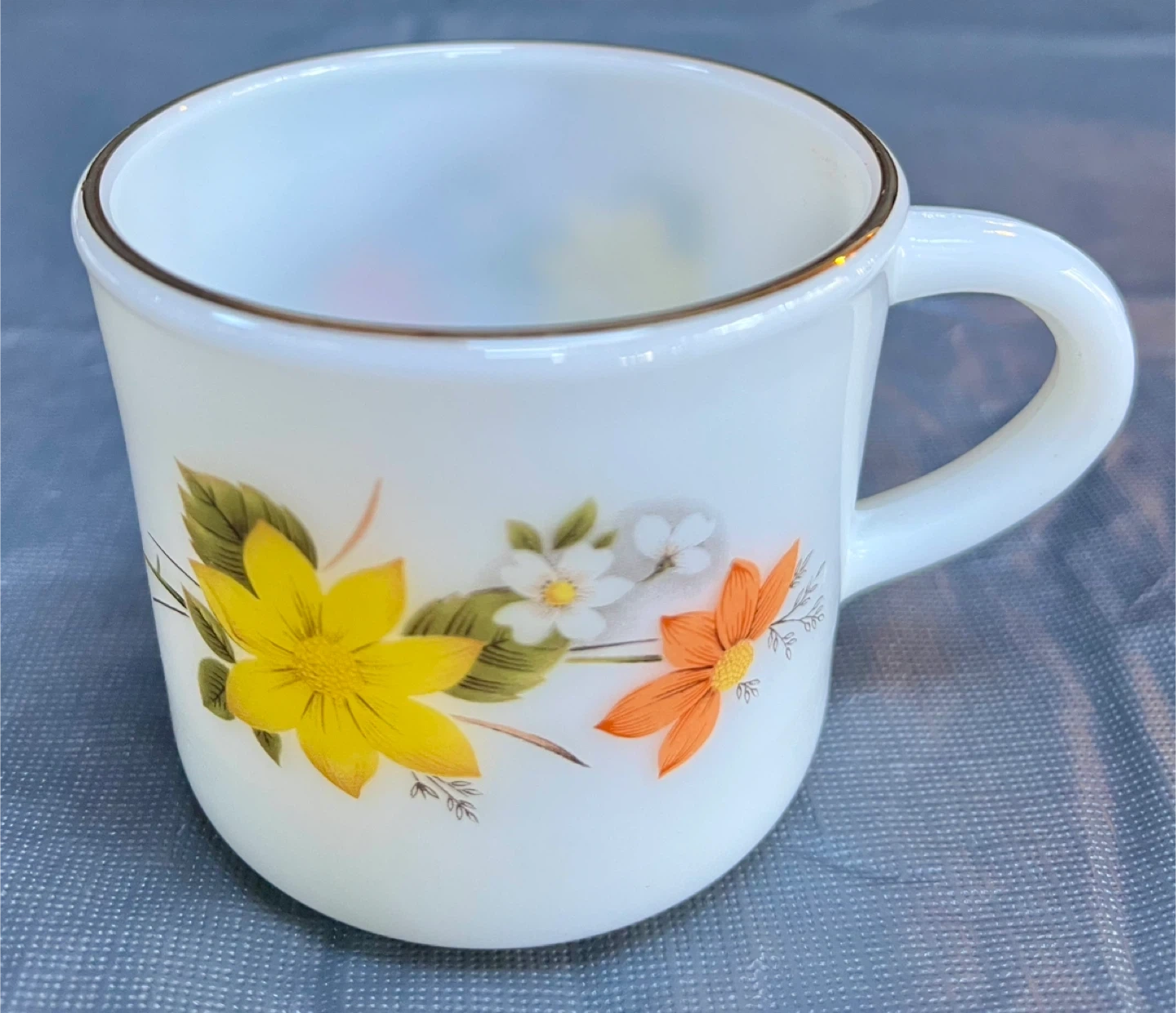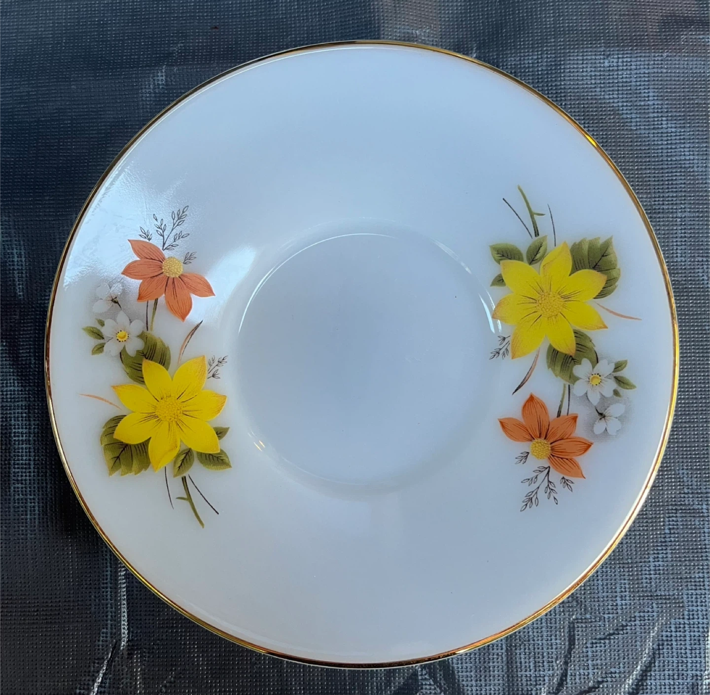 Here's a lovely vintage milk glass tea cup and saucer set! The set features a delicate floral design with yellow, orange, and white flowers, accented by a gold trim. Perfect for adding a touch of vintage charm to your tea time