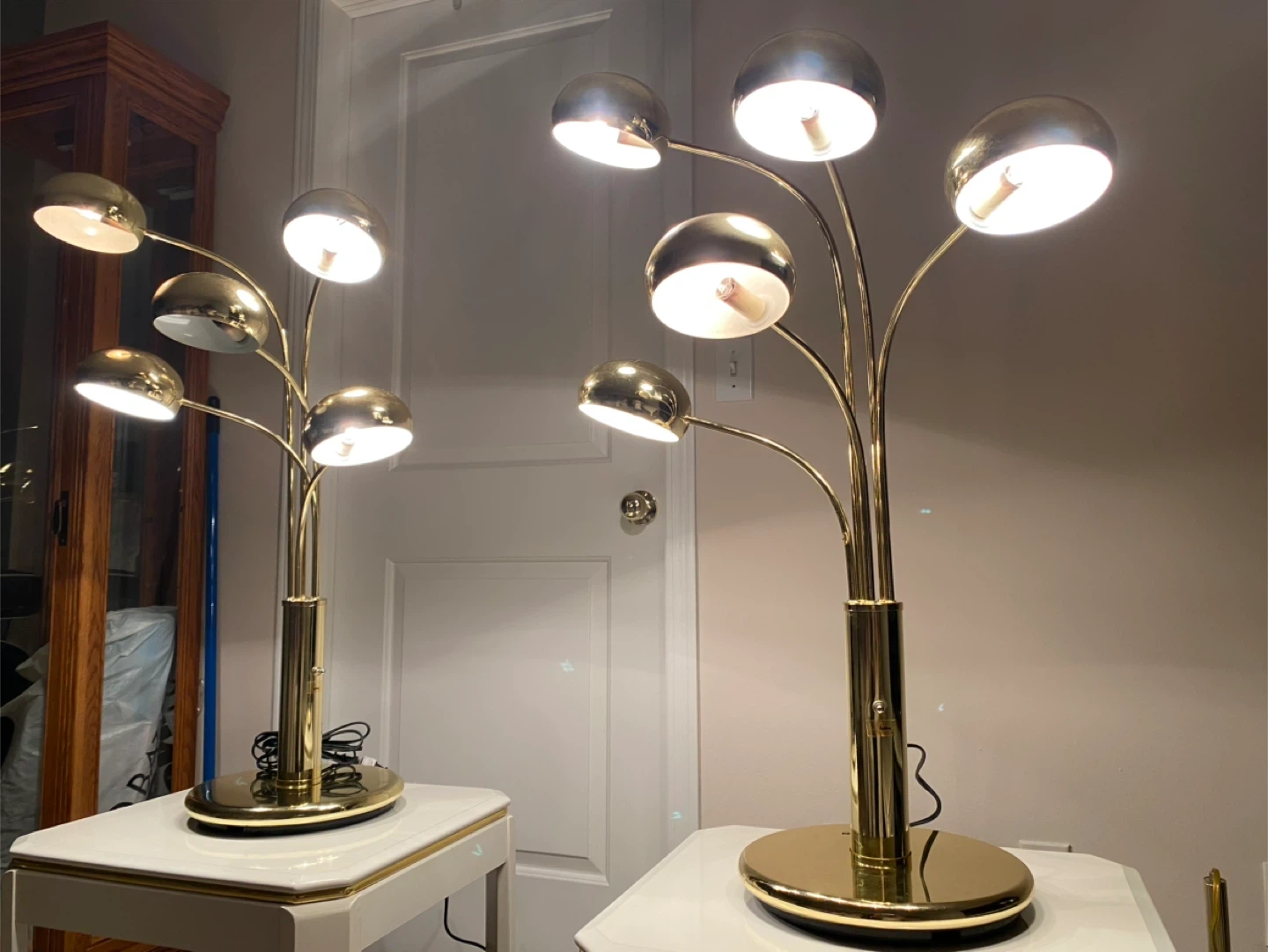 Selling a pair of vintage multi-bulb floor lamps! They have a beautiful gold finish that would add a touch of retro charm to any room. These lamps are in great condition and ready to brighten up your space. They have a unique design with multiple adjustable lights.
