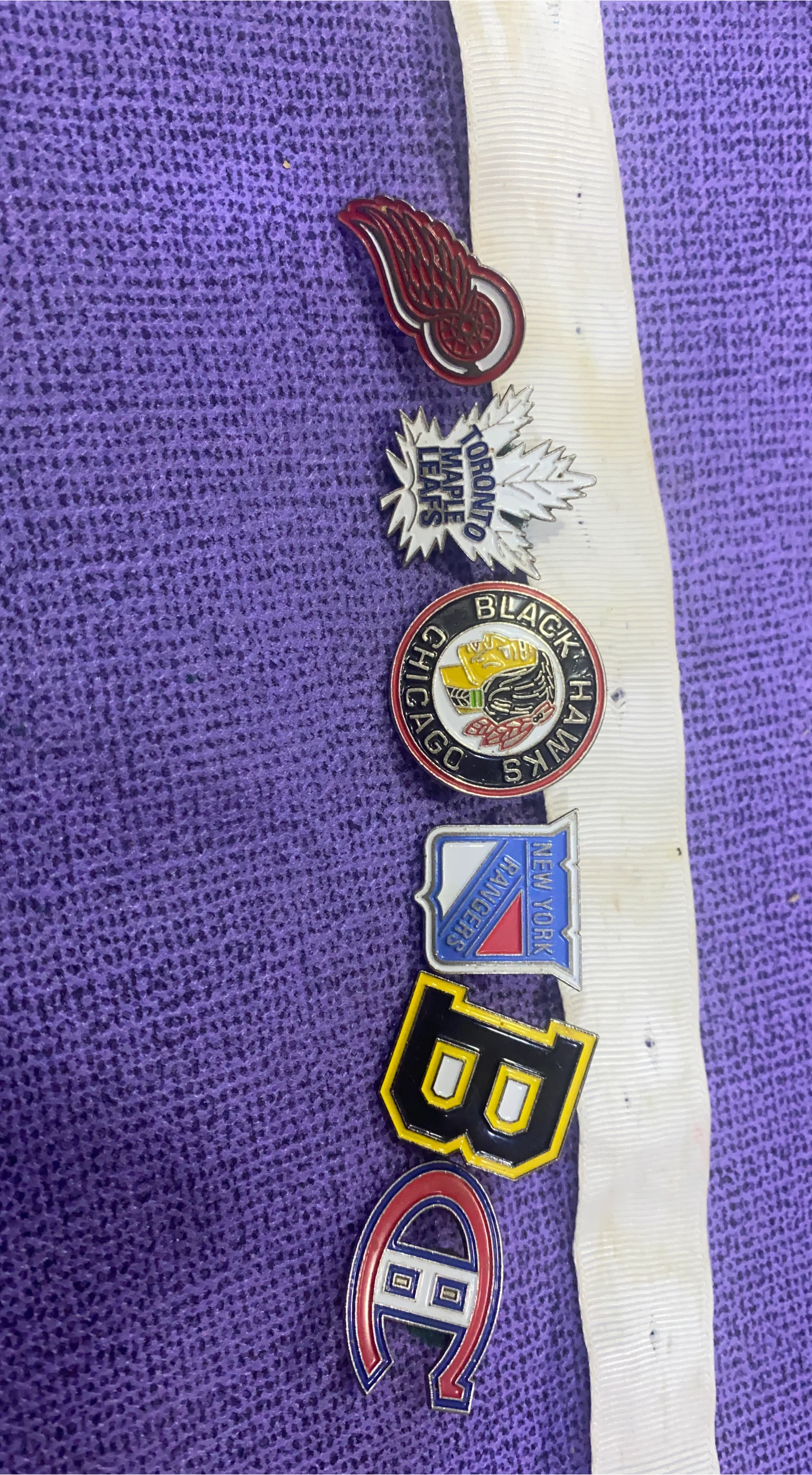 Selling a set of six vintage NHL team logo pins. The logos include the Detroit Red Wings, Toronto Maple Leafs, Chicago Blackhawks, New York Rangers, Boston Bruins (B), and an older Hartford Whalers logo. These pins are from the NFL Team and made in Taiwan. Perfect for any hockey fan!
