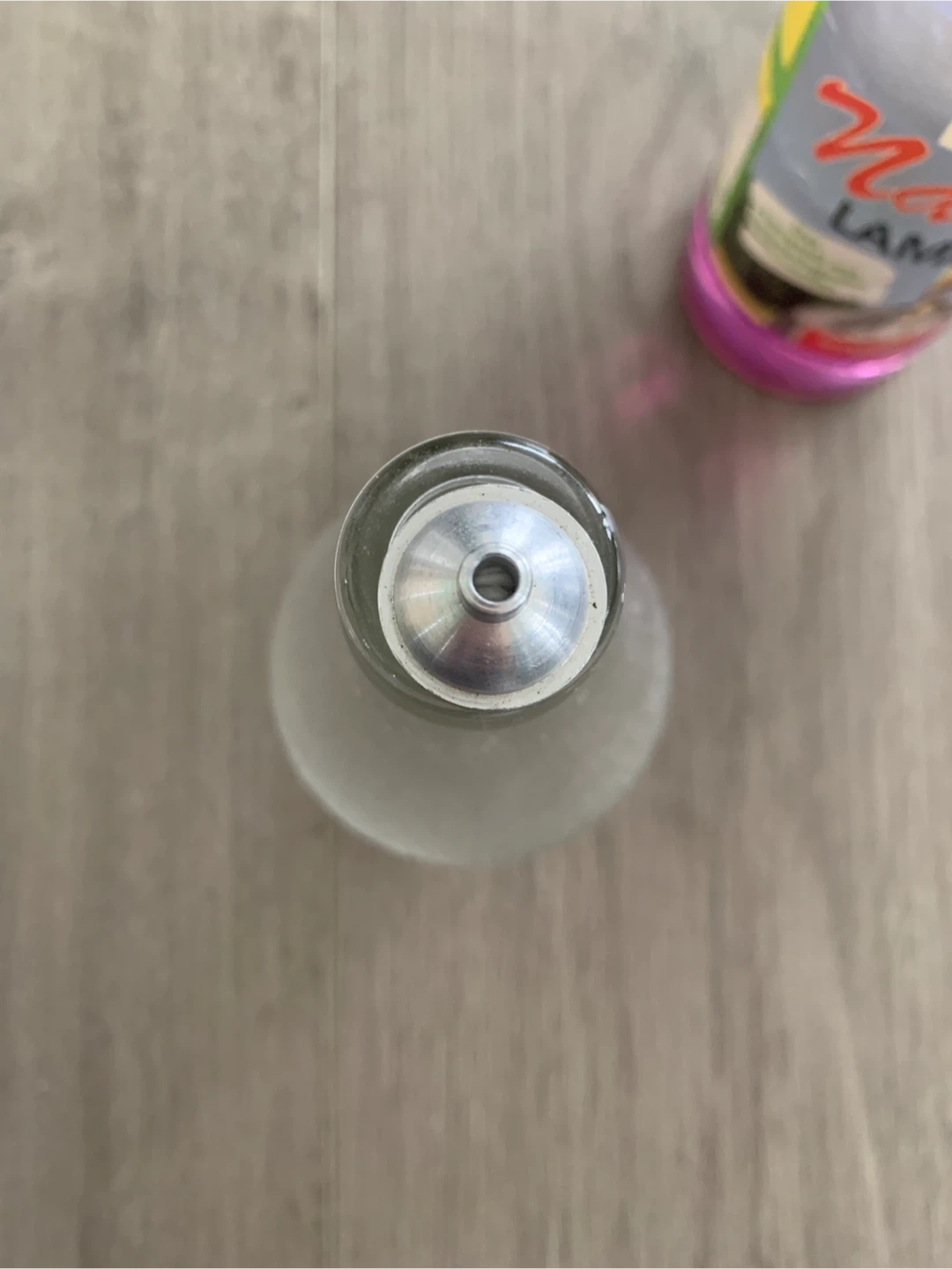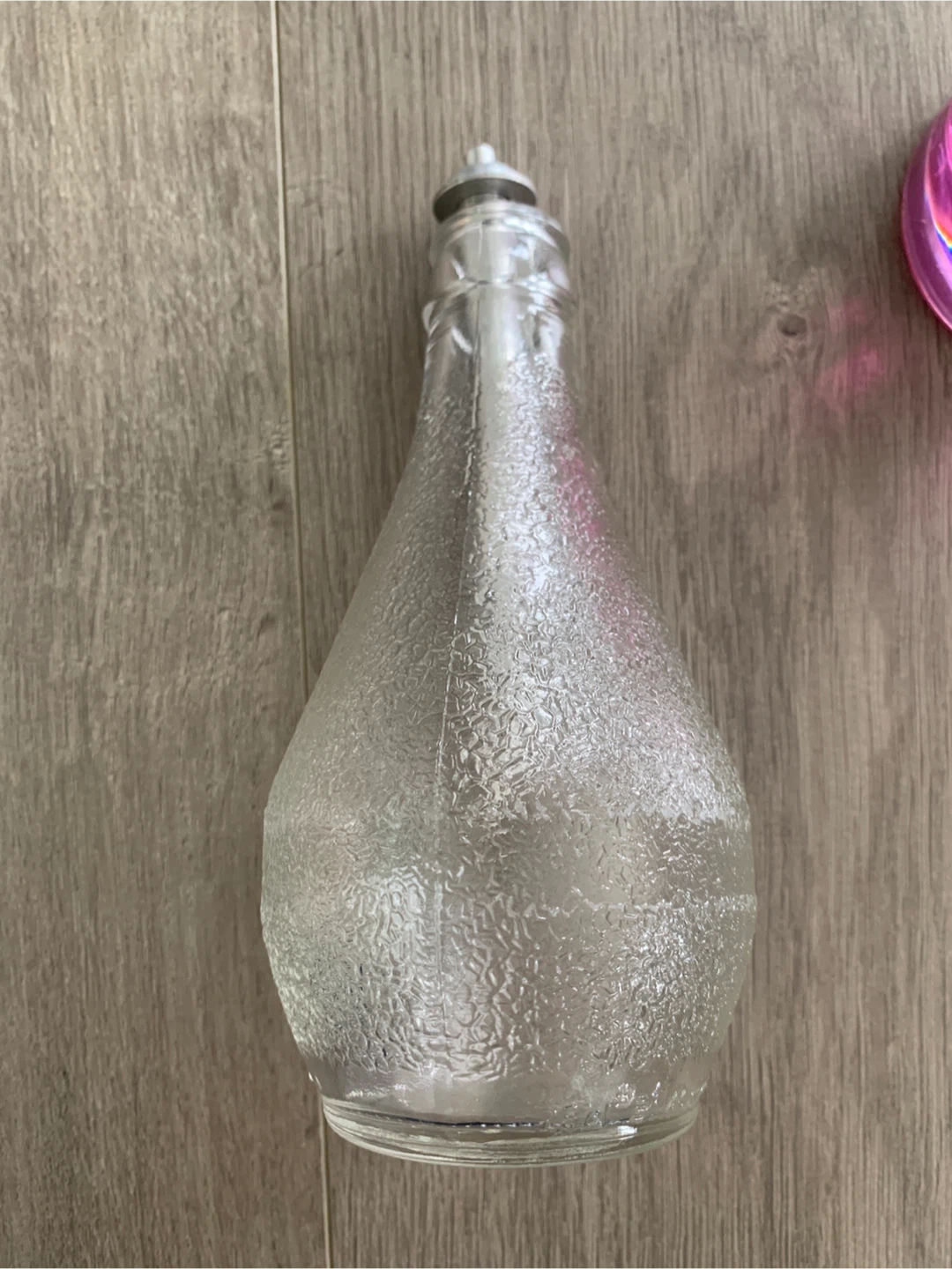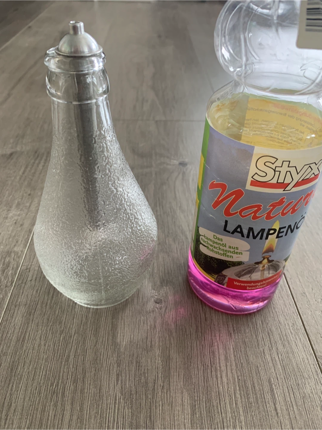 Selling a dyi glass oil lamp. The base of the lamp is an old orangina bottle , no logo on it. Includes the metal top / wick holder and purple lamp oil, half full bottle.
