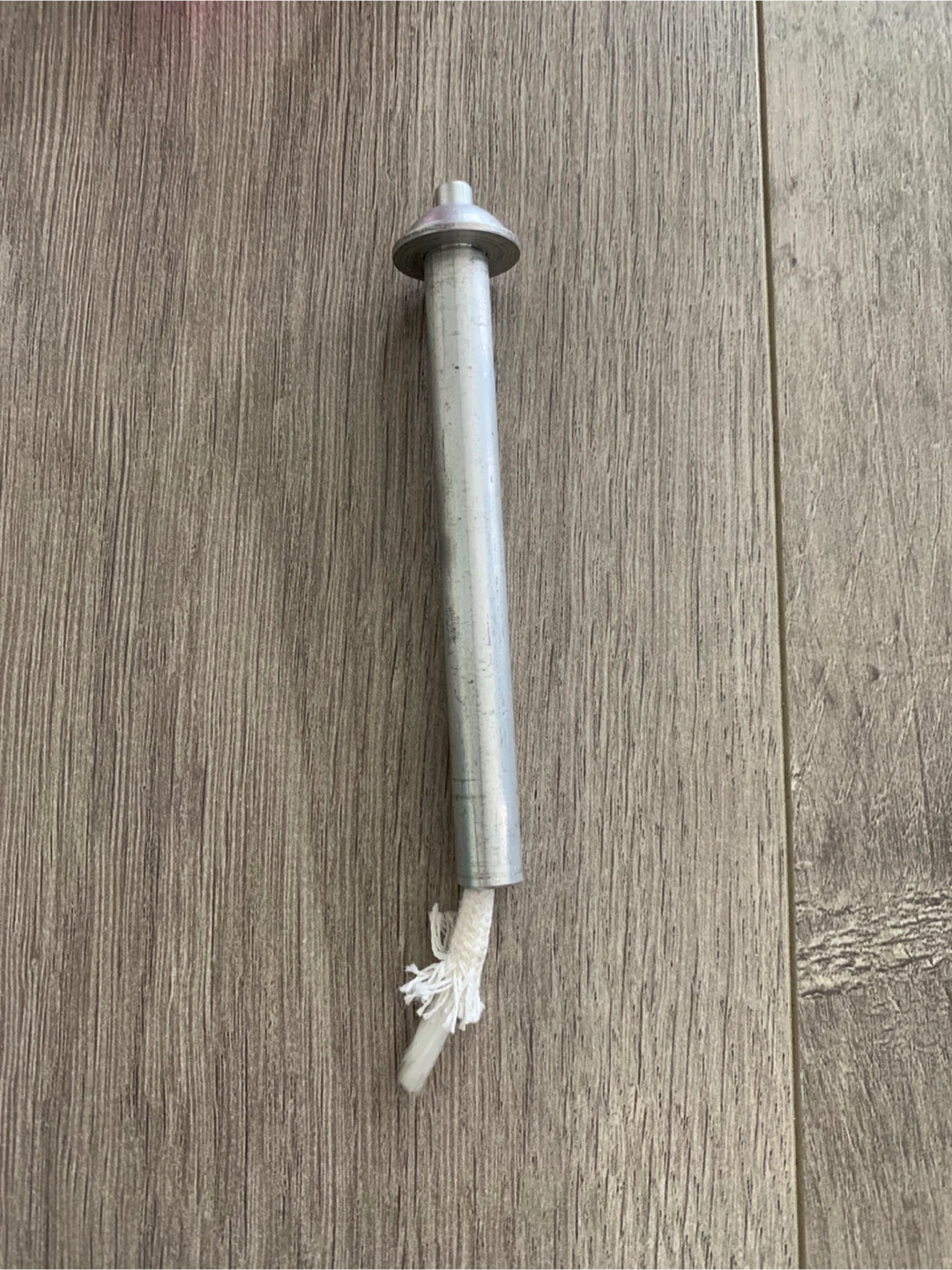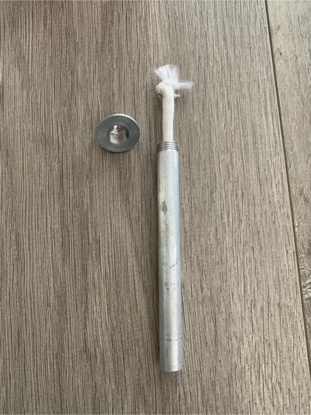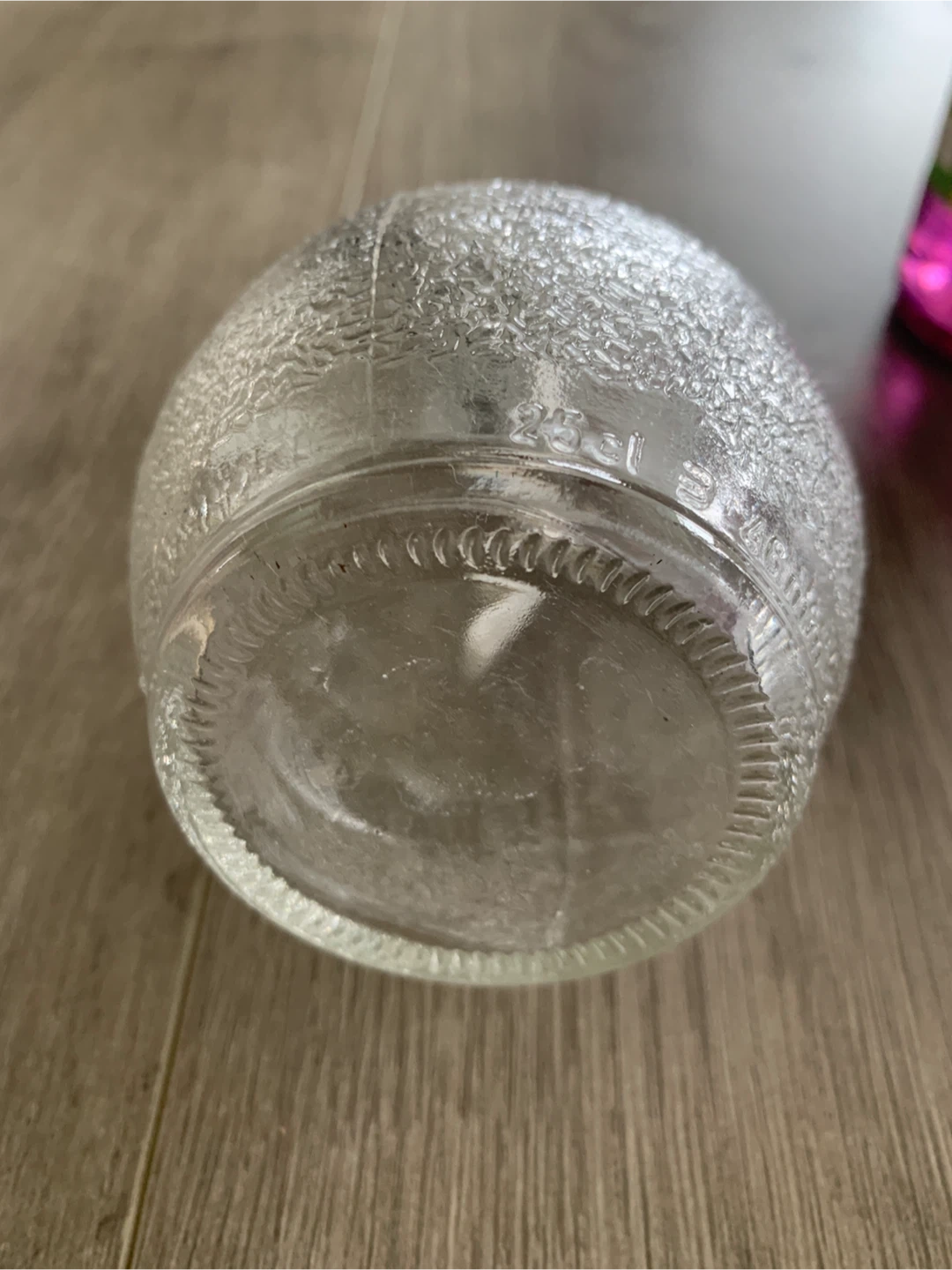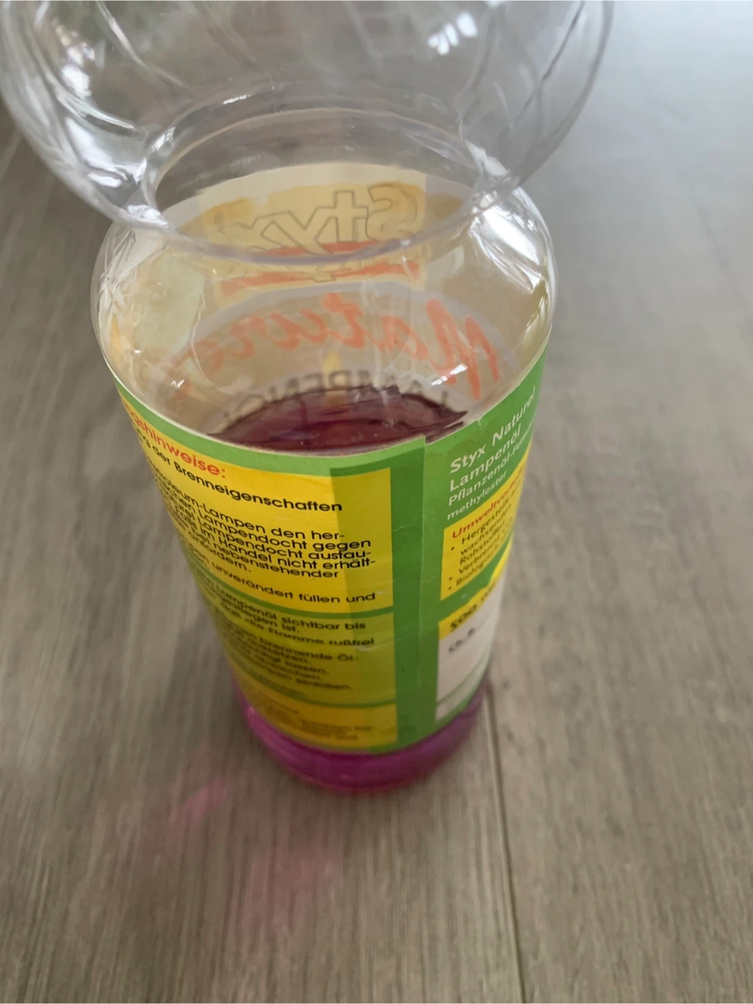 Selling a dyi glass oil lamp. The base of the lamp is an old orangina bottle , no logo on it. Includes the metal top / wick holder and purple lamp oil, half full bottle.