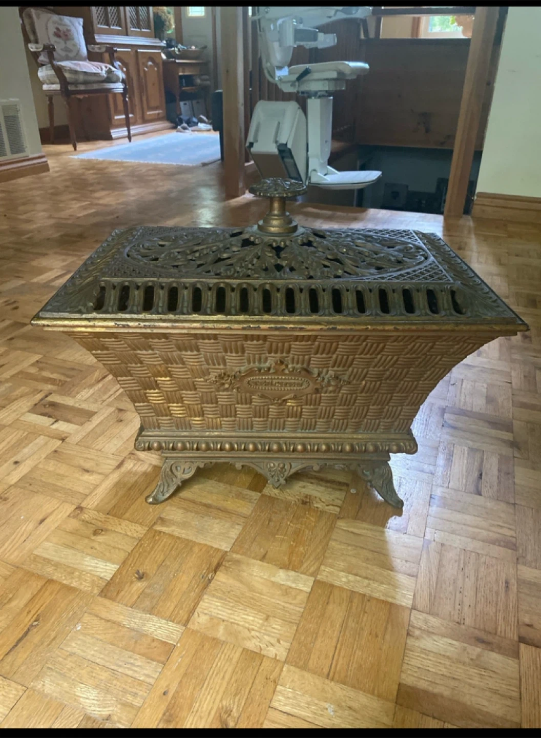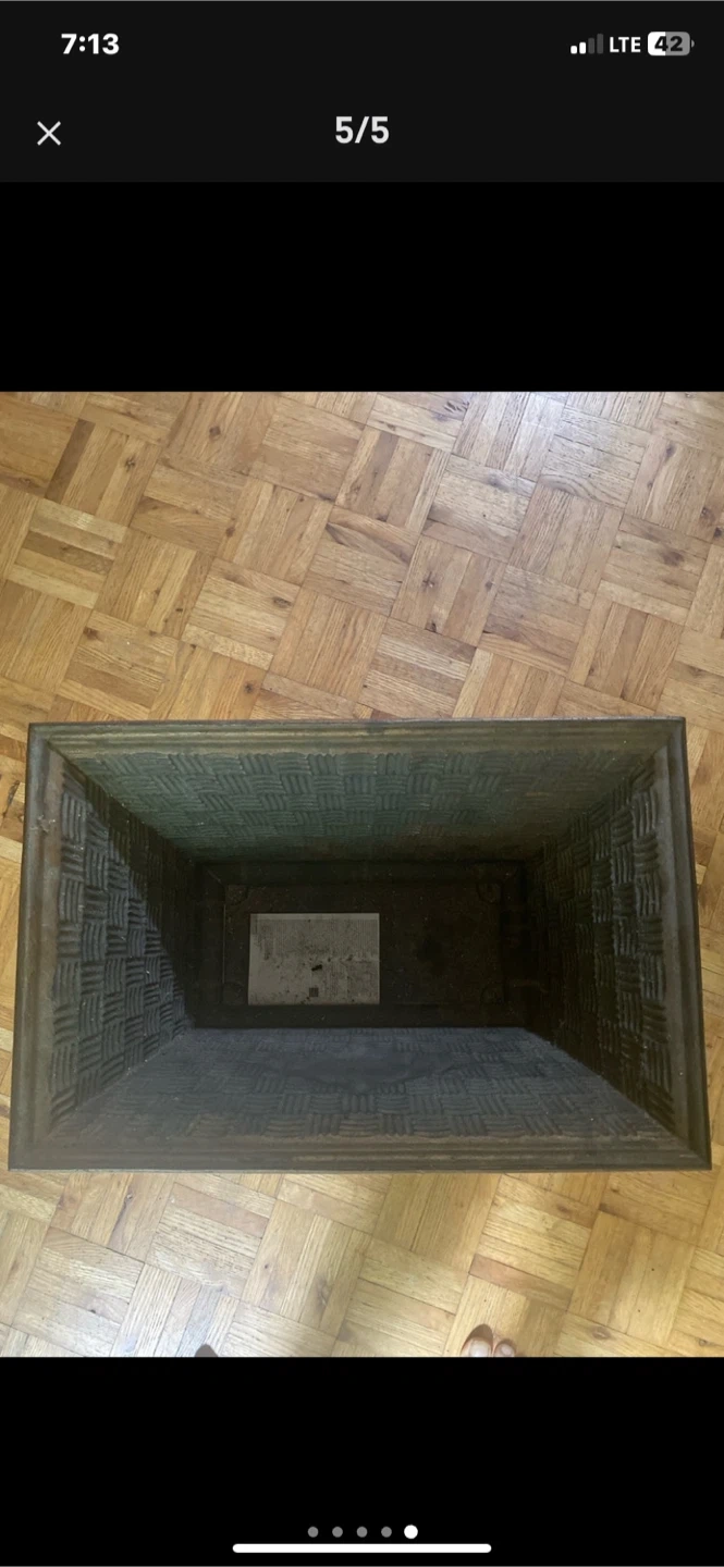 Selling a vintage firewood holder with a unique ornate metal design. It's in good condition and would make a lovely addition to any home with a fireplace. It has a rectangular shape with decorative details on the top and sides.