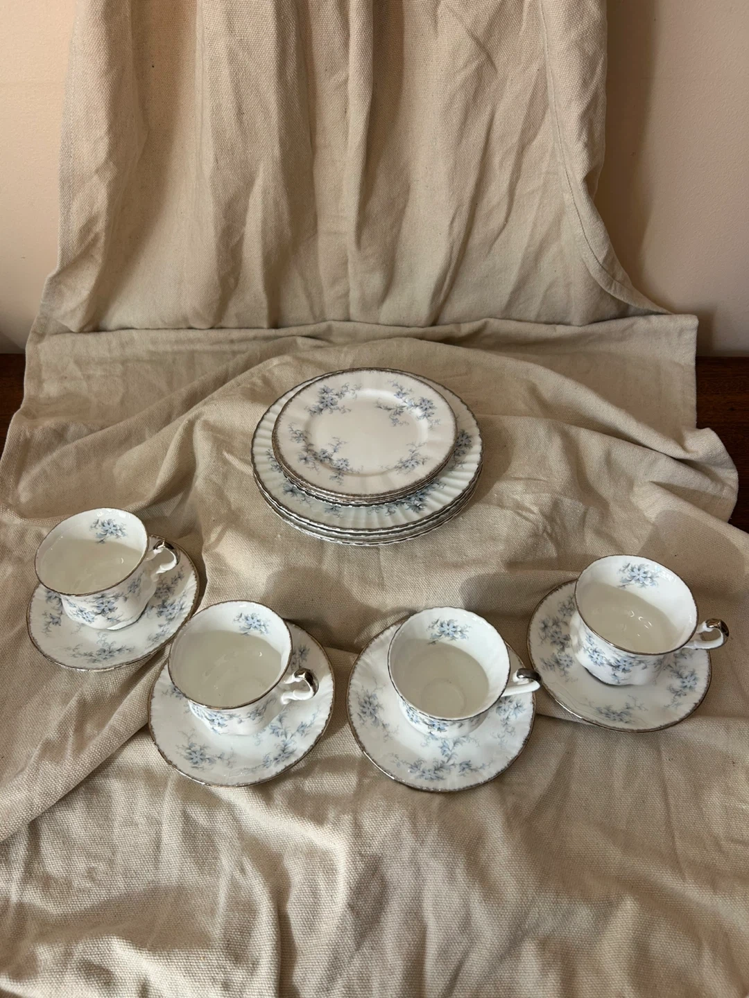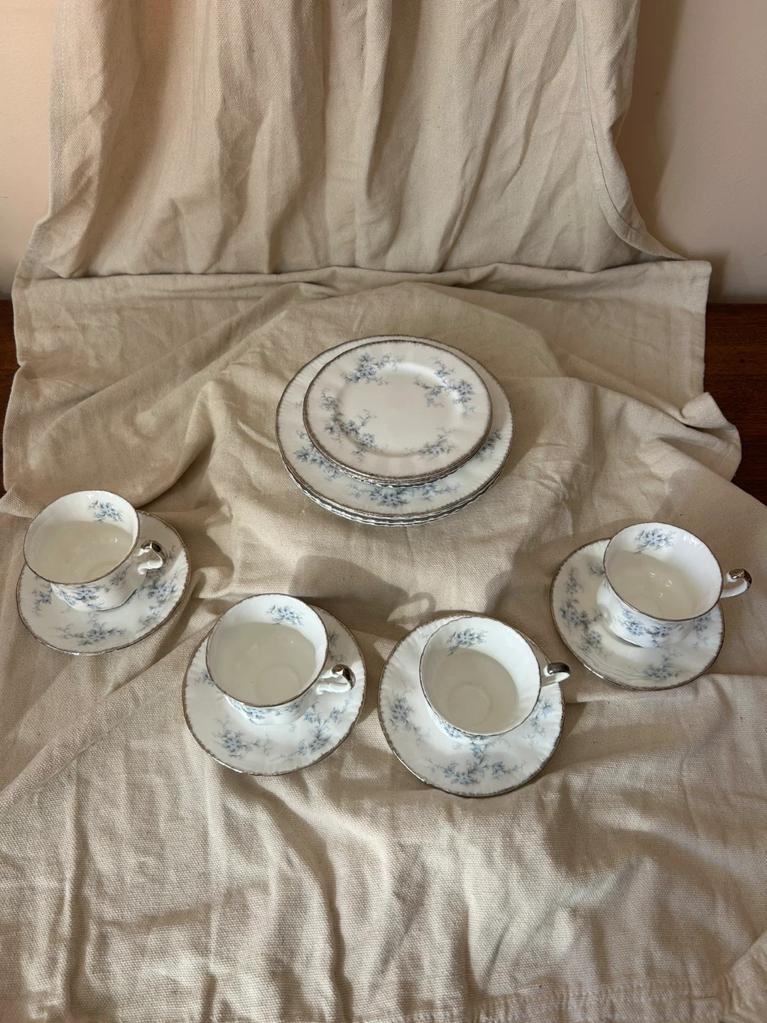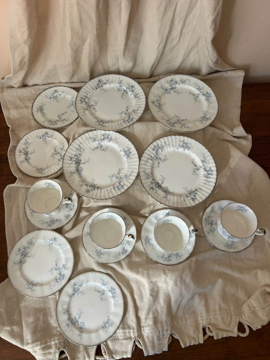 Selling a beautiful vintage tea Paragon set! It includes cups, saucers, and plates, all adorned with a delicate blue floral pattern and silver trim. Perfect for adding a touch of elegance to your tea time