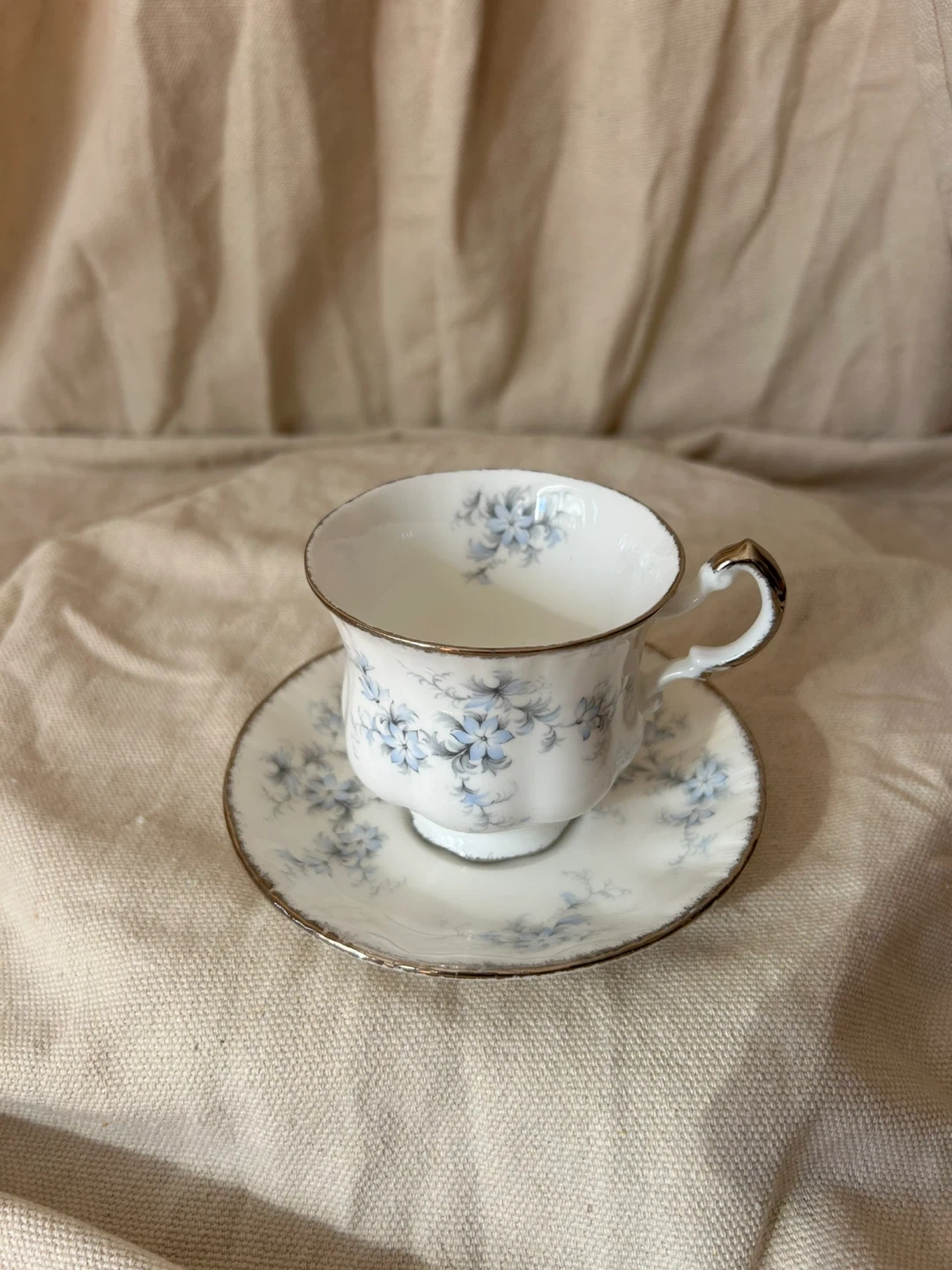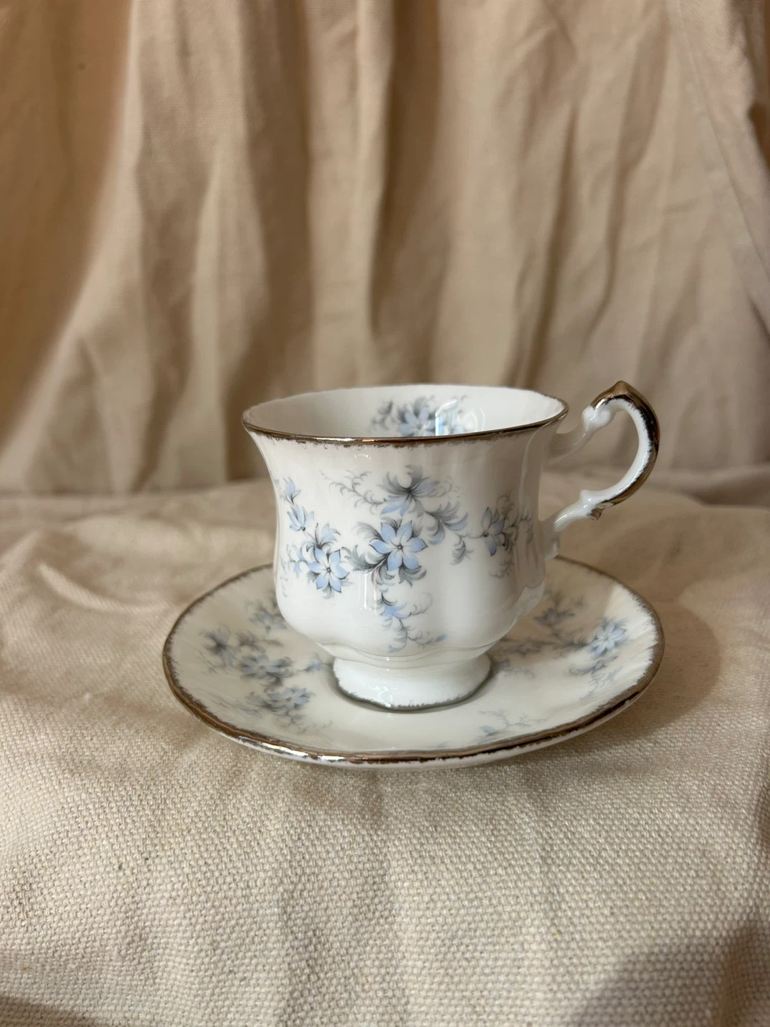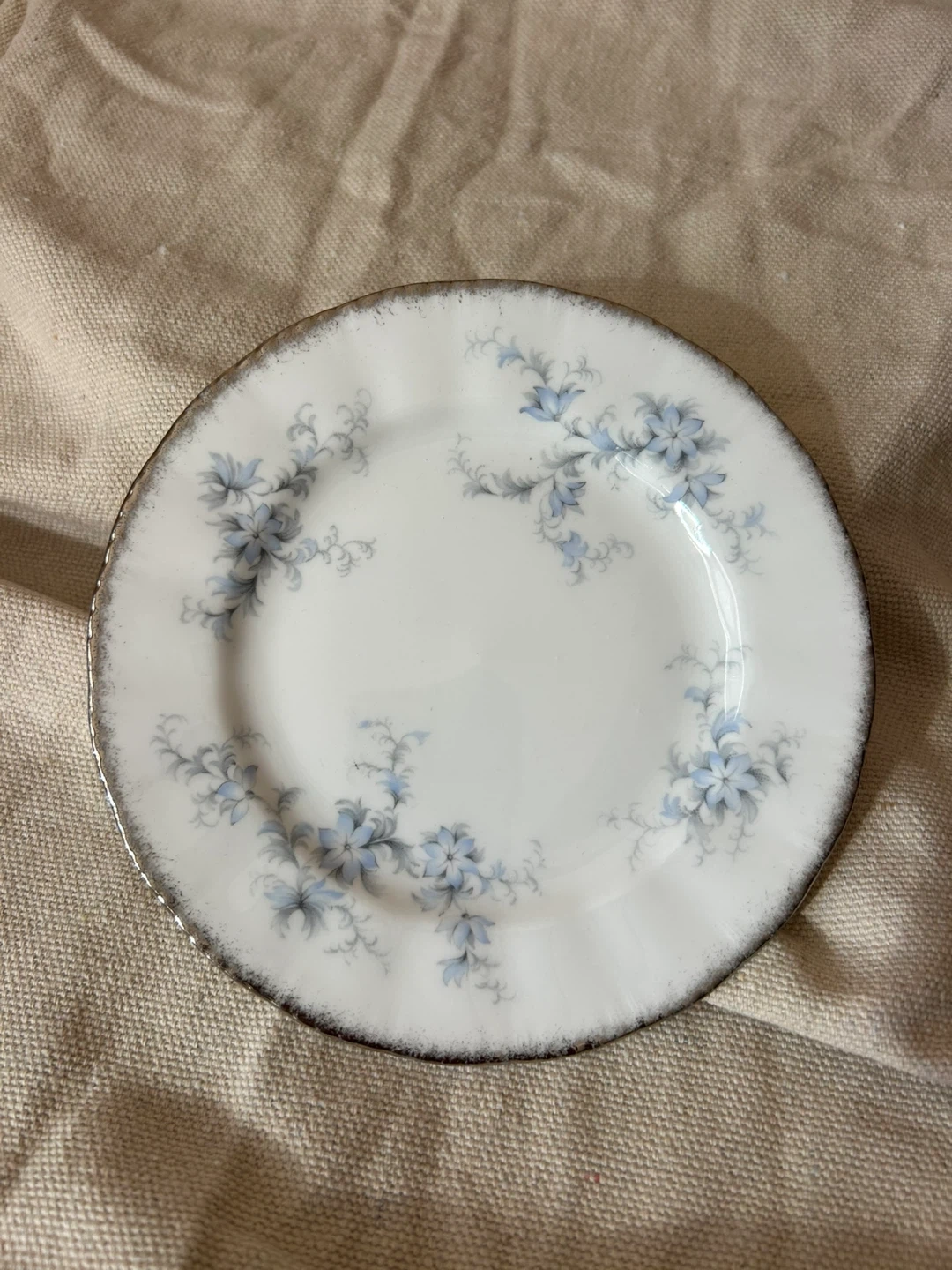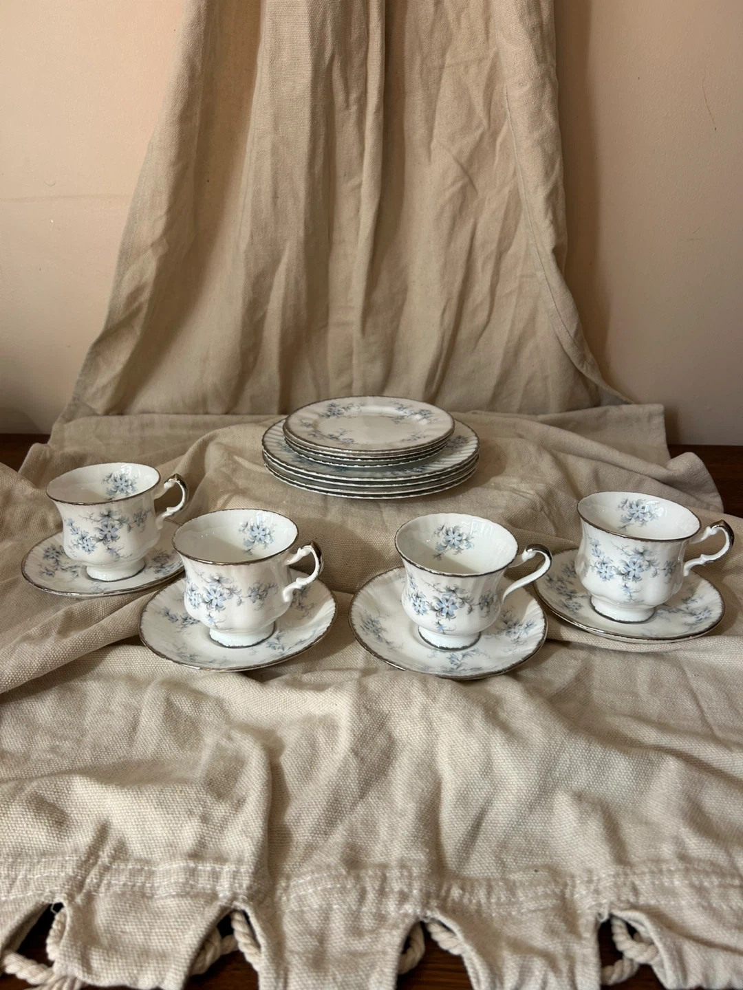Selling a beautiful vintage tea Paragon set! It includes cups, saucers, and plates, all adorned with a delicate blue floral pattern and silver trim. Perfect for adding a touch of elegance to your tea time