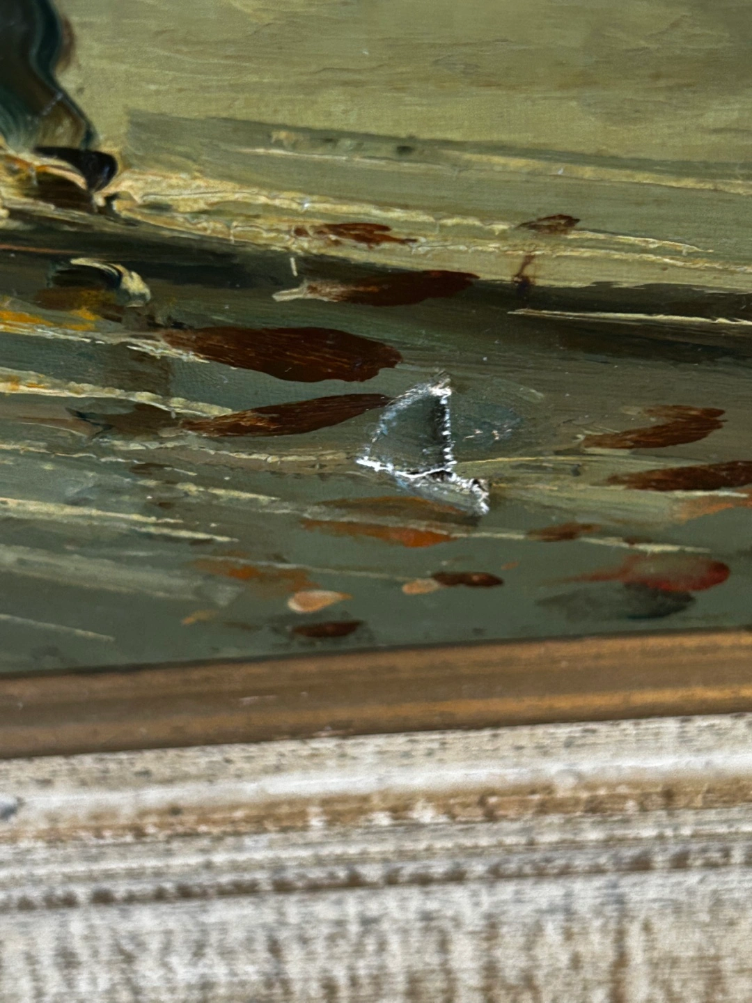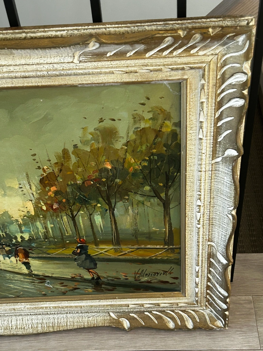 Large framed painting. Depicts a Parisian street scene with Notre Dame Cathedral in the background. Features people walking and horse-drawn carriages. Ornate gold frame. Signed by the artist. Note that there is a small hole in the picture. Pick up area, Bayview and Sheppard.