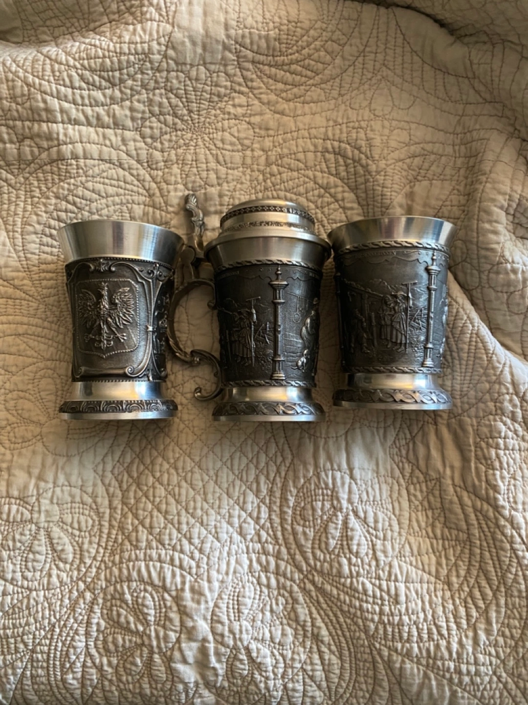 Selling a set of three vintage pewter steins. They feature detailed designs and a classic look. Perfect for collectors or anyone who appreciates unique drinkware!