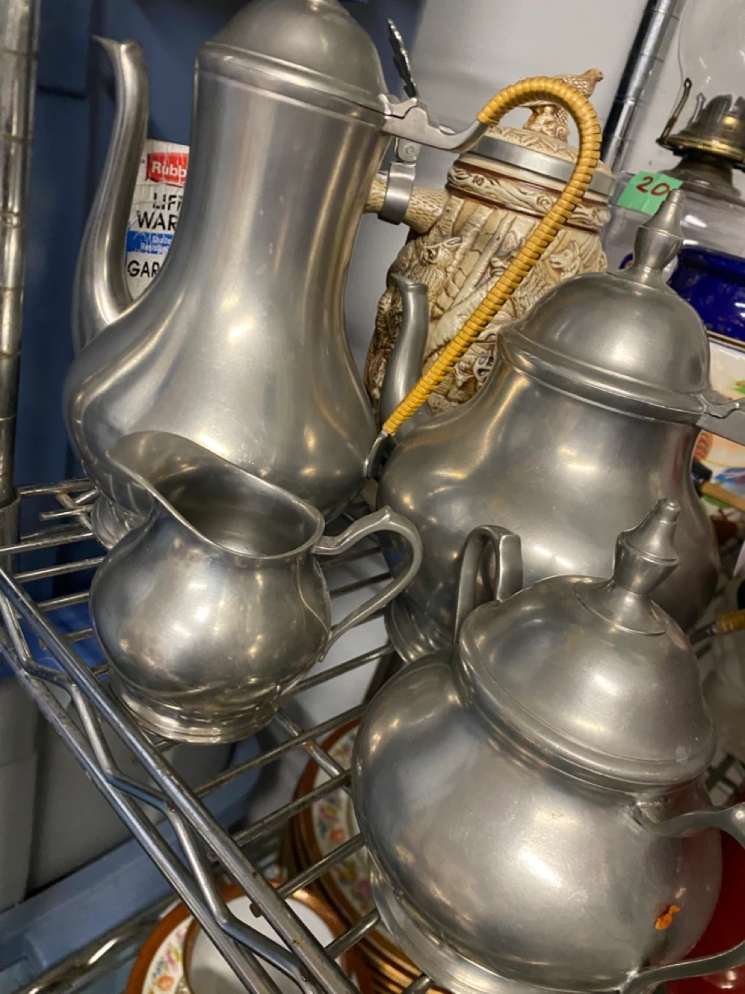 Here's a lovely vintage pewter tea set ! It includes a teapot, coffee pot creamer, and sugar bowl. Perfect for adding a touch of vintage charm to your tea time It has very nice handle wrapping.