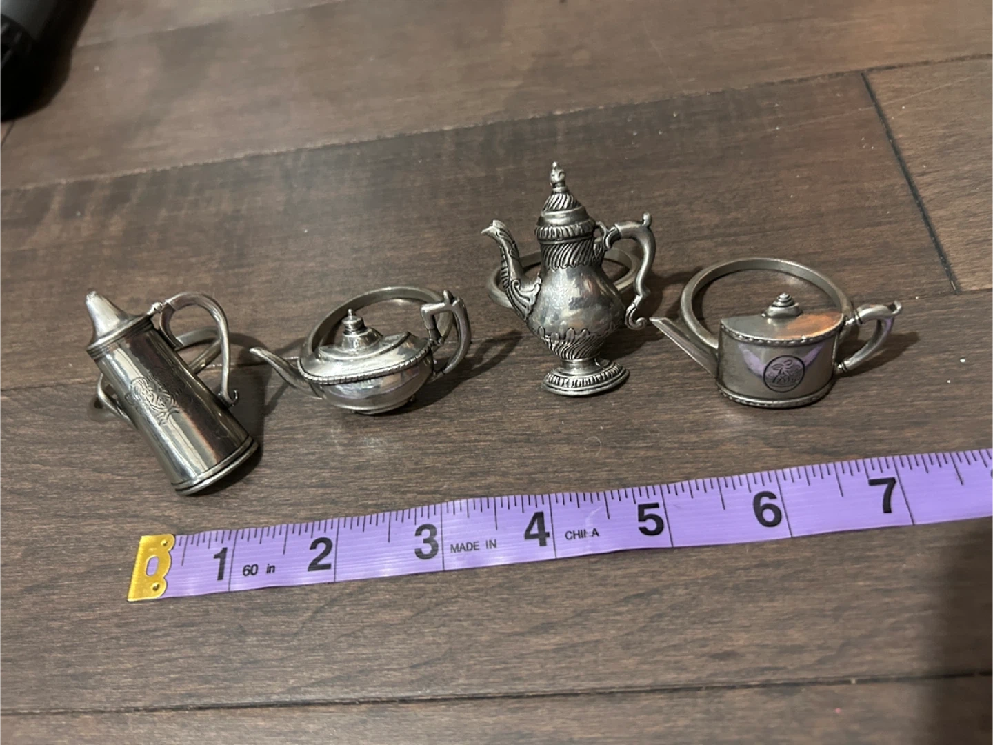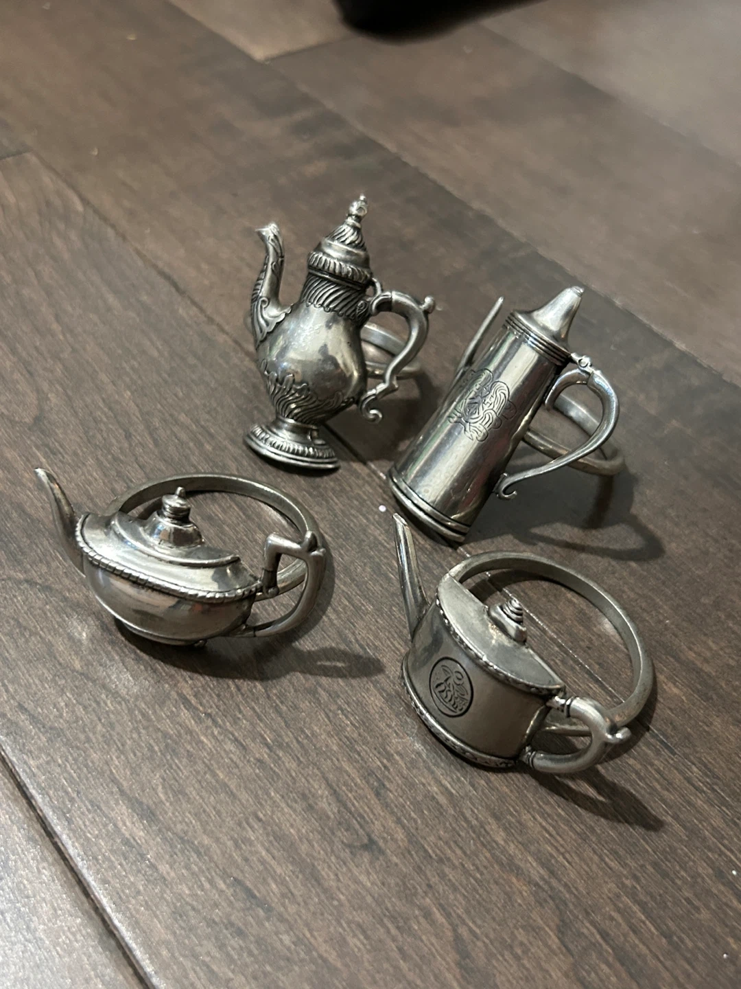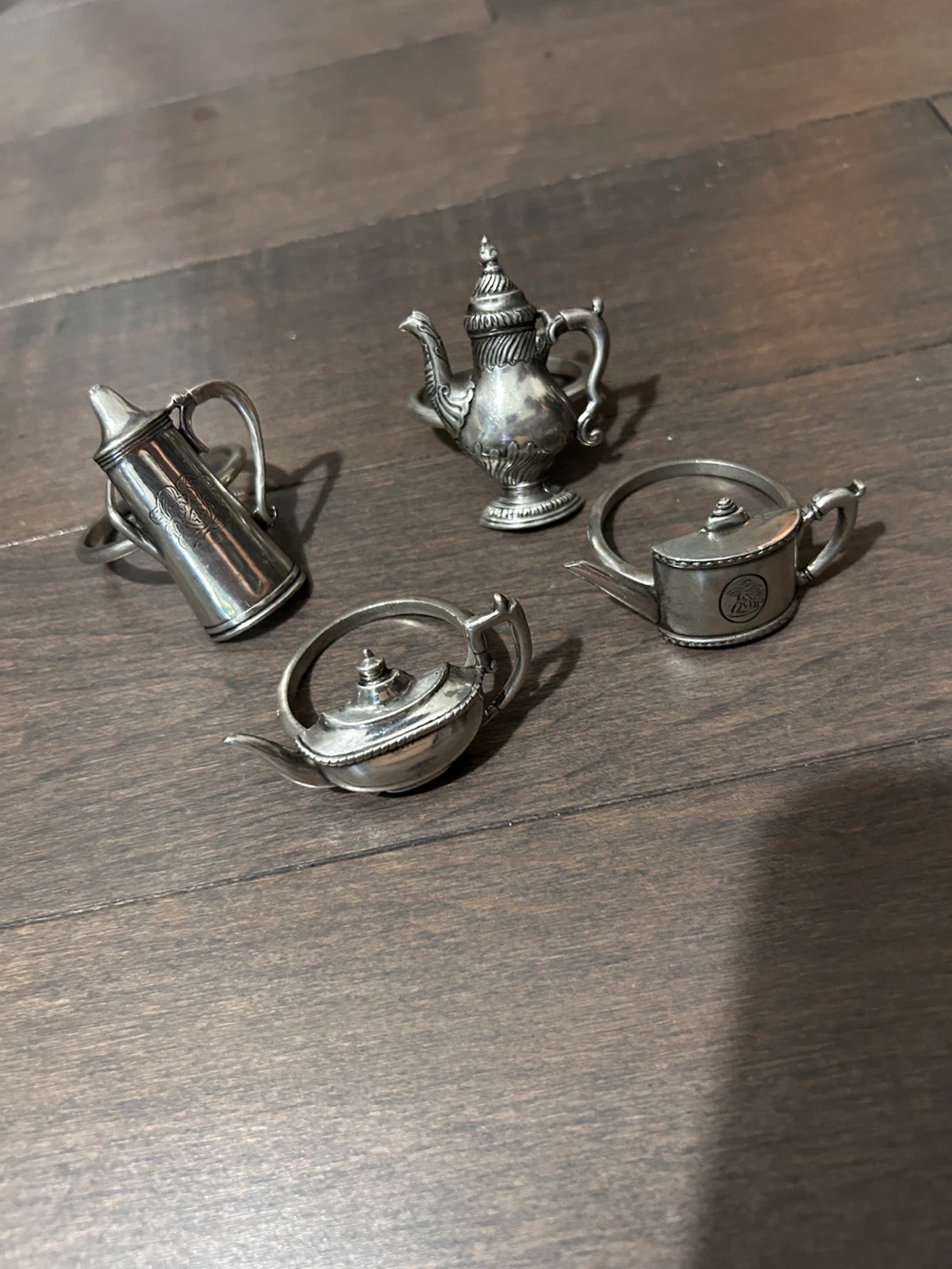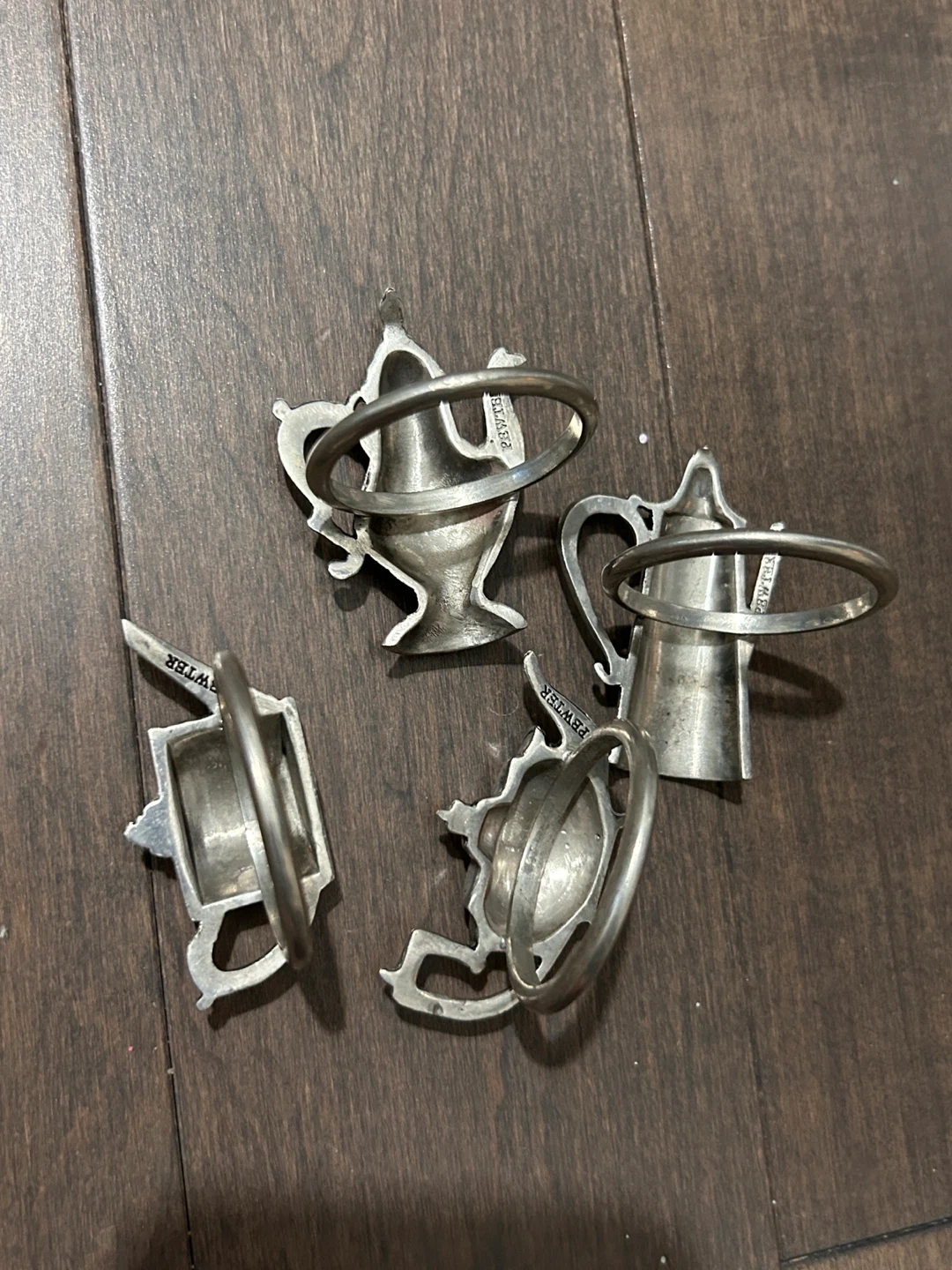 Selling a set of four vintage pewter napkin rings! They're in the shape of teapots and would make a lovely addition to any table setting. They're in great condition.