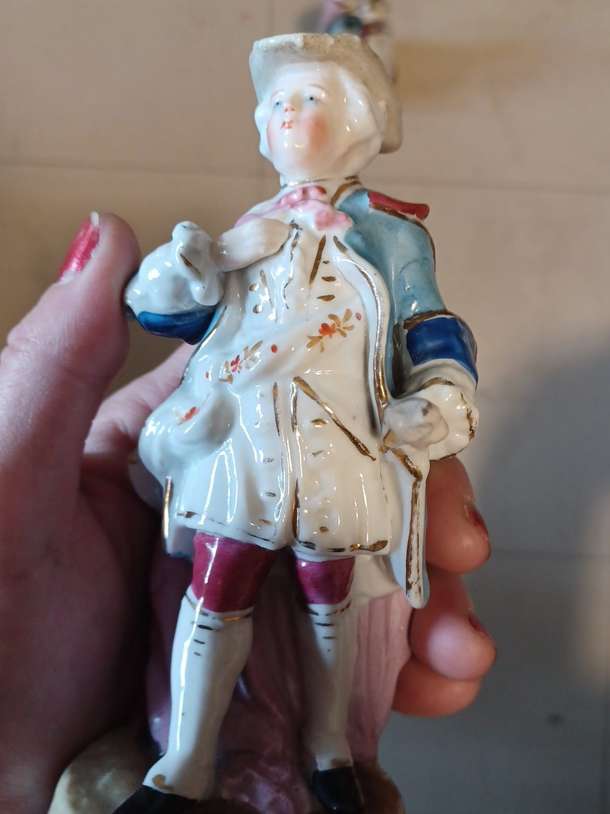 Selling a vintage porcelain figurine of a man in a white, blue and red coat. It has some gold detailing. It's in good condition for its age!