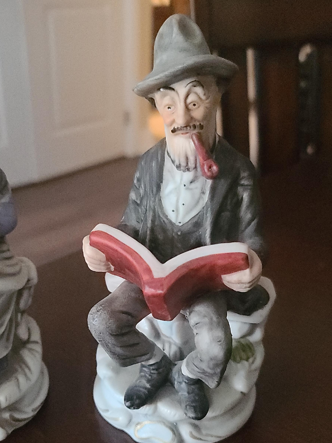 I'm selling a vintage porcelain figurine of a man sitting and reading a book. It's a charming piece that would look great on a bookshelf or mantelpiece. It shows some signs of age and wear, which adds to its character