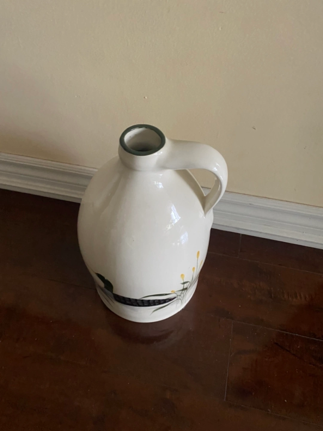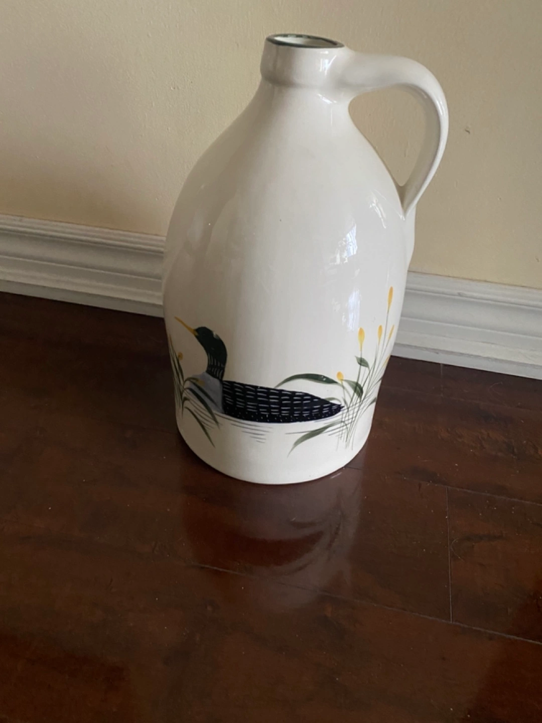 Large white ceramic jug. Features a loon and reeds design. Green rim. Perfect for home decor.